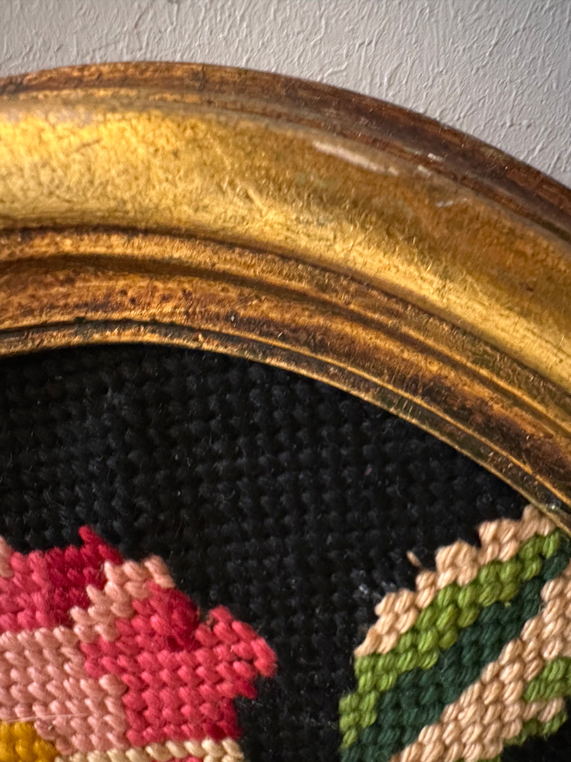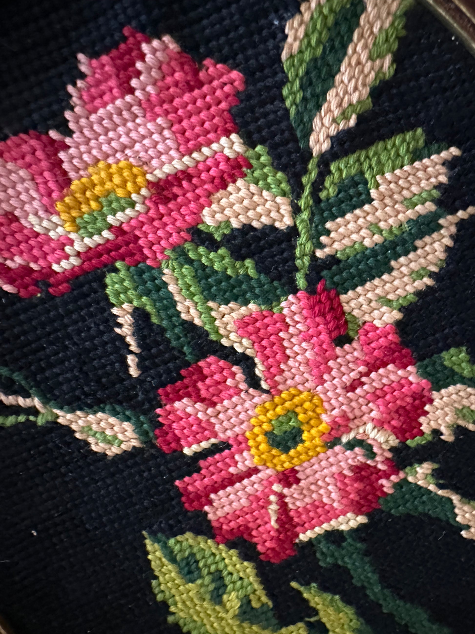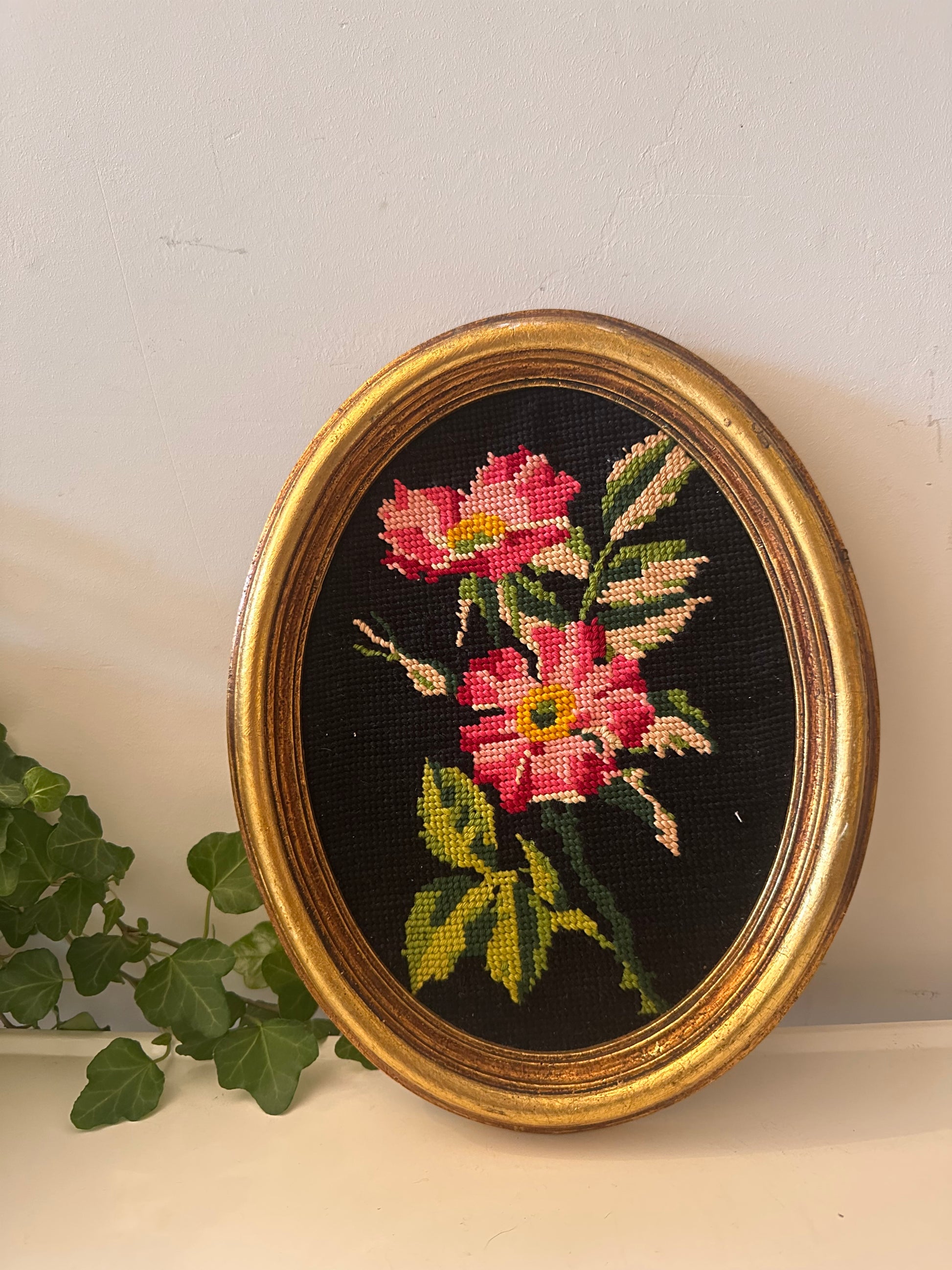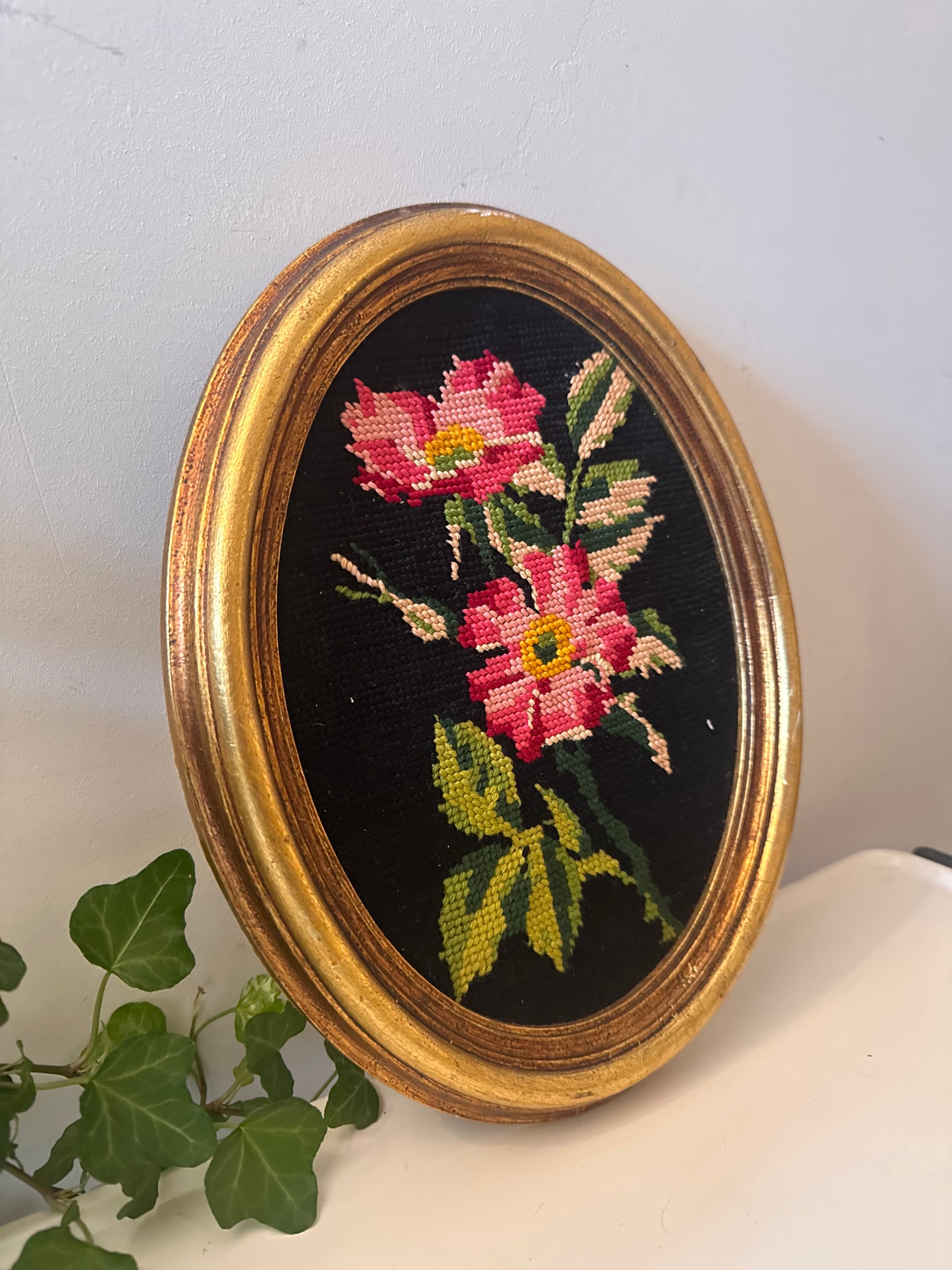 Hoe leuk is dit handgemaakte borduurwerk met roze bloemen op zwarte achtergrond! Het zit in een vintage ovaal lijstje met goudkleurige rand β een klassieker uit de jaren 60/70. Prachtig voor aan de muur of gewoon los tegen de wand gestyled tussen je andere vondsten. Q600
