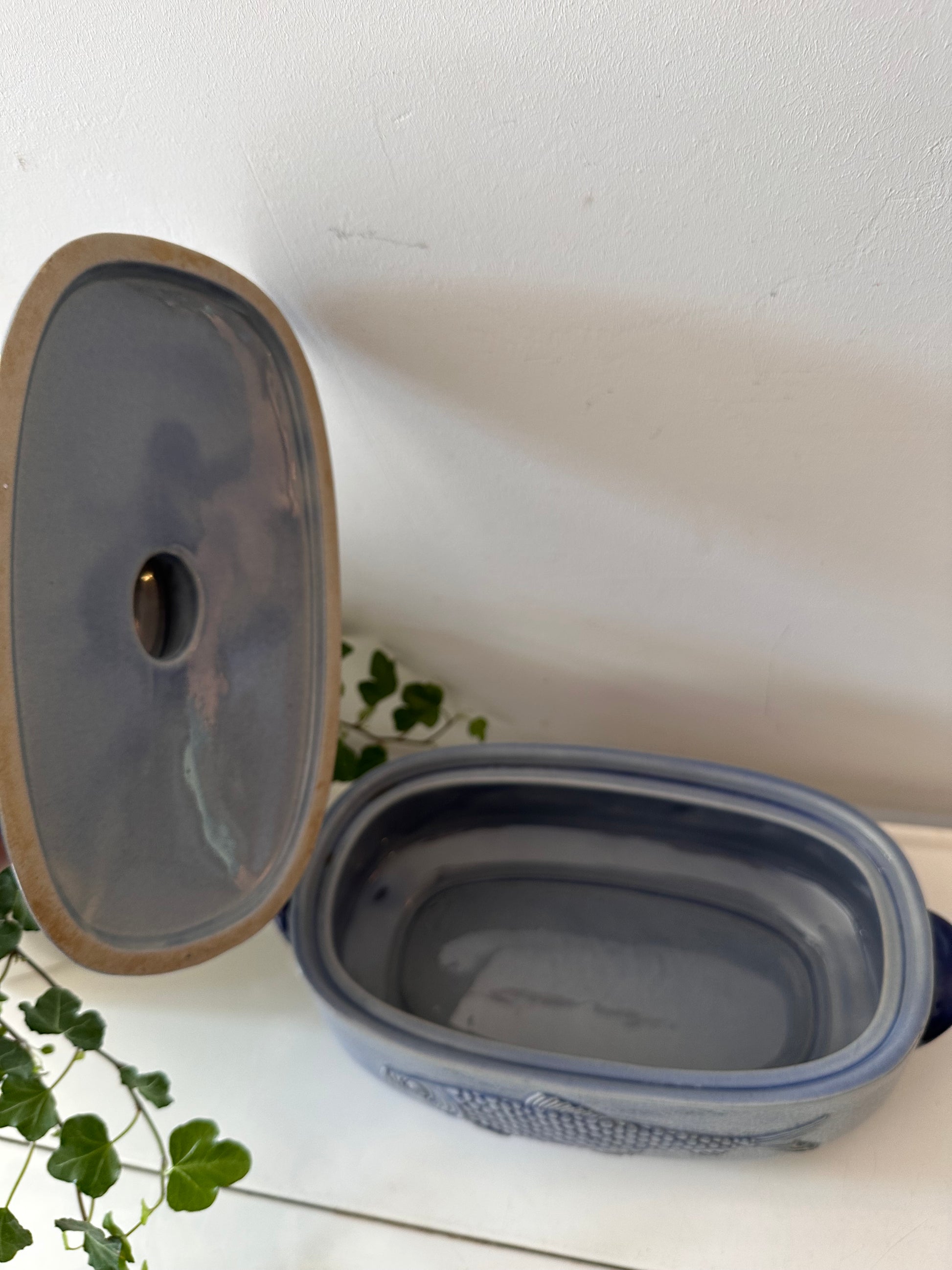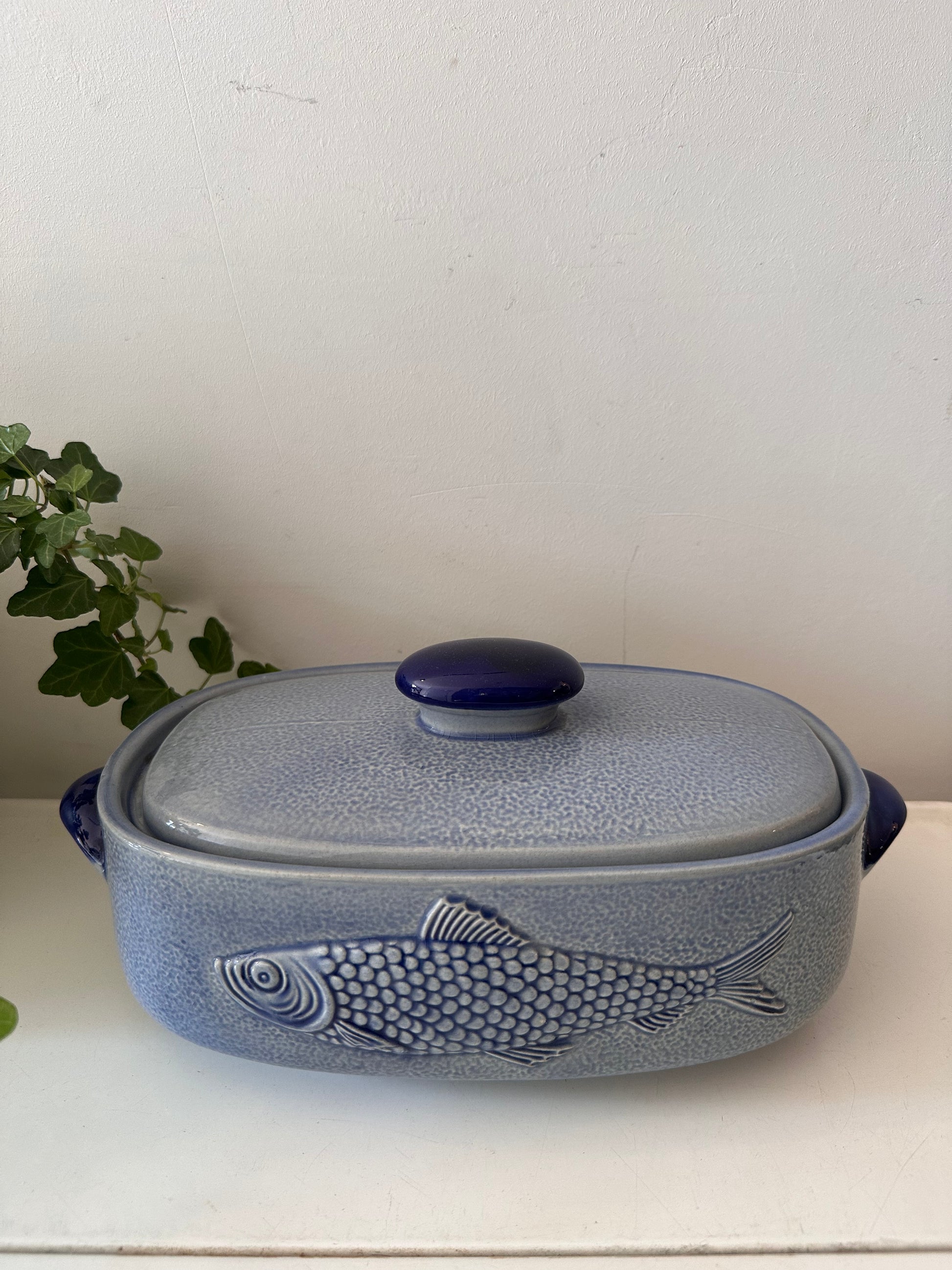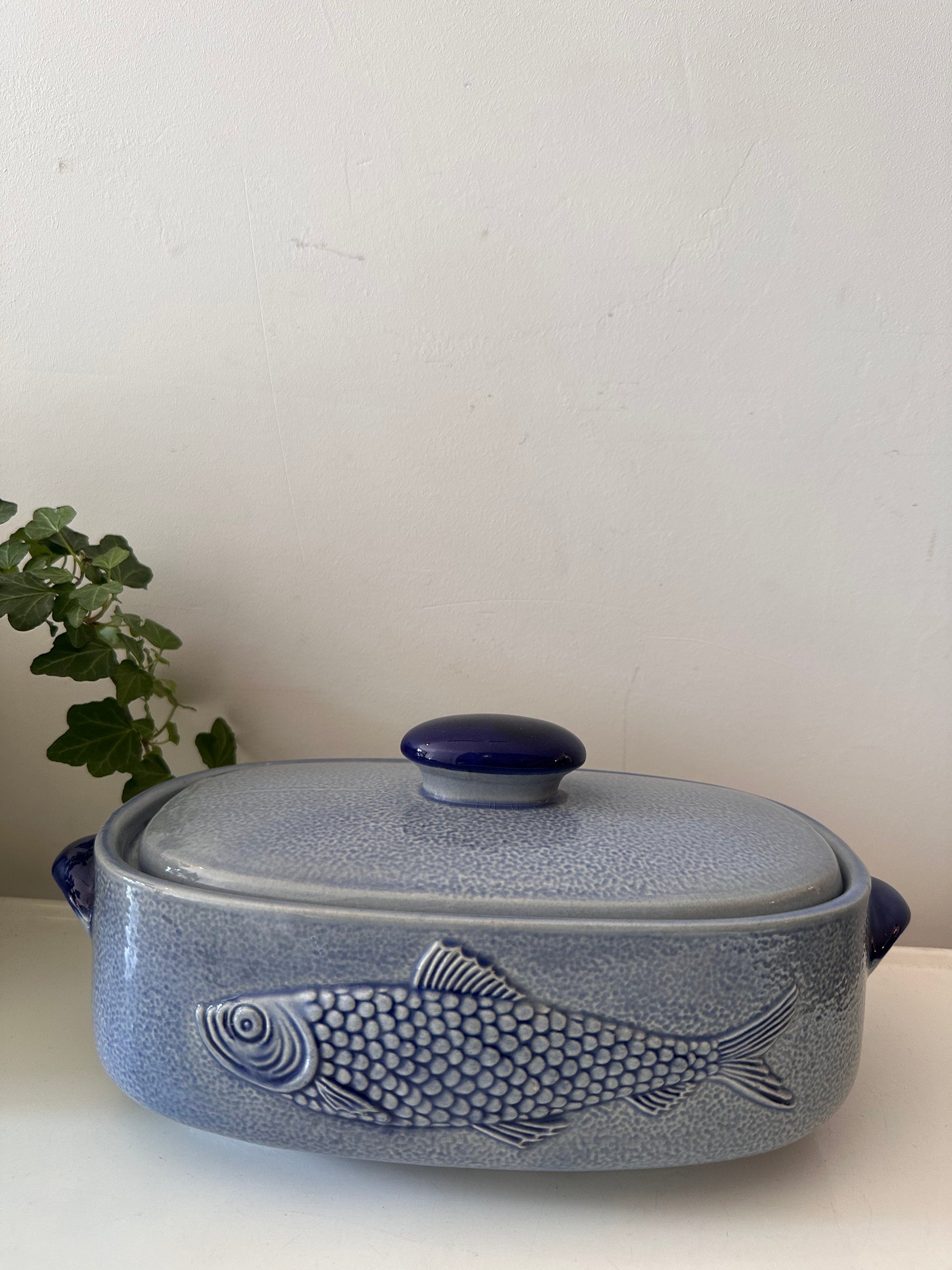 Hoe tof is dit stuk? Blauwe geglazuurde ovenschaal met deksel. Aan beide kanten zit een reliëf van een vis, perfect voor een op tafel of in je keuken. Afkomstig uit Duitsland, gemerkt aan de onderzijde (M.R. stempel, modelnummer 3067). Q398