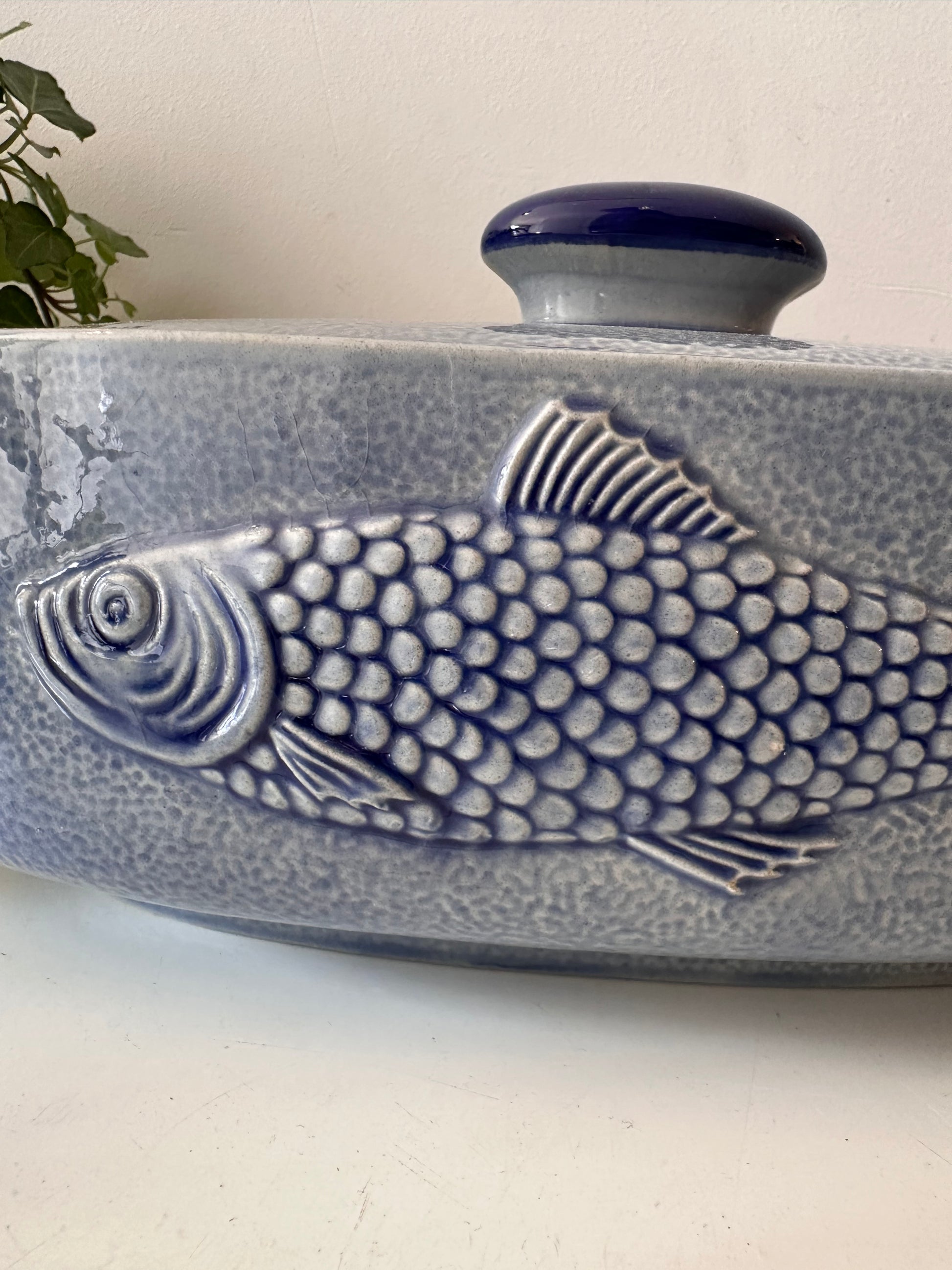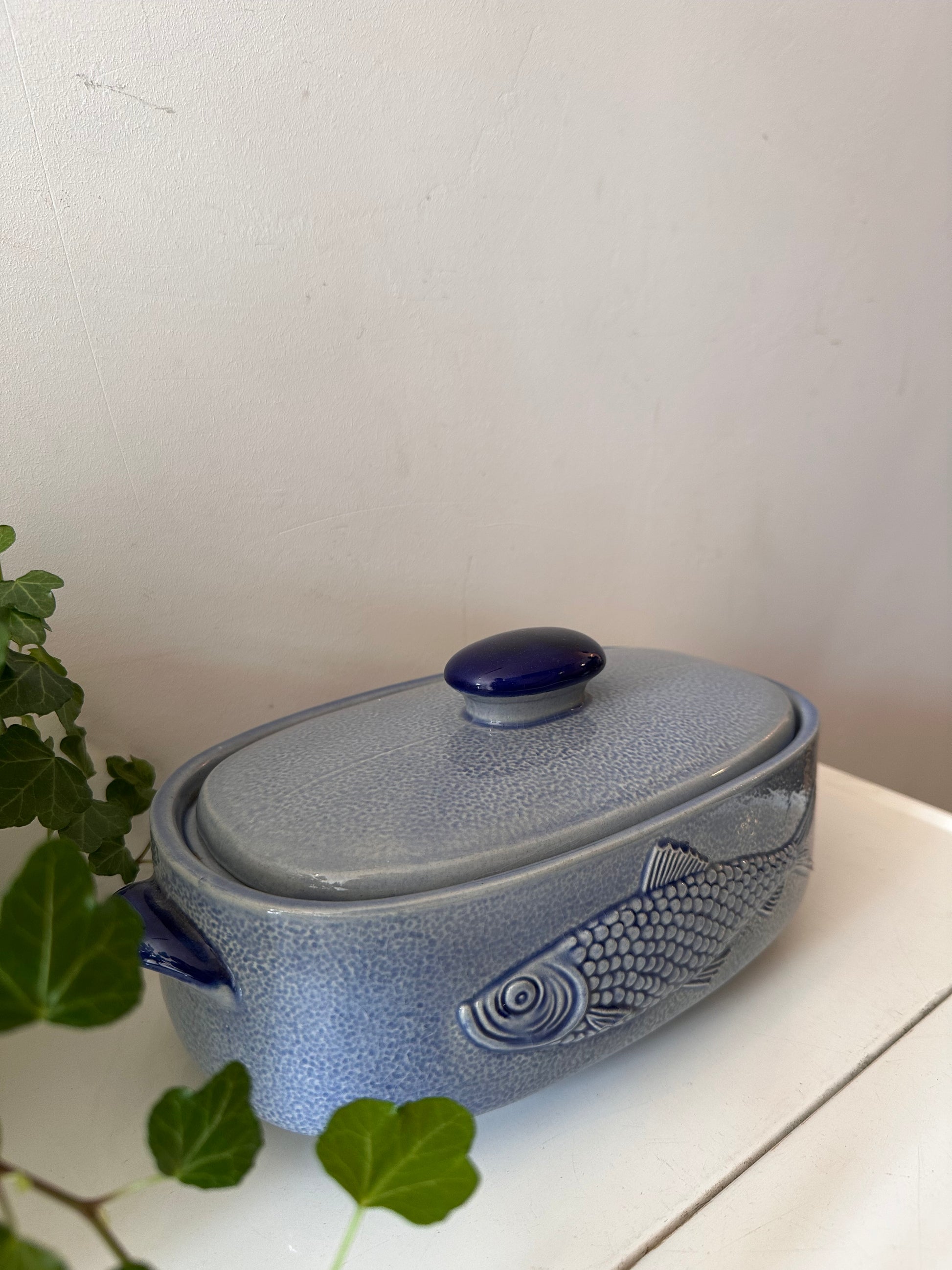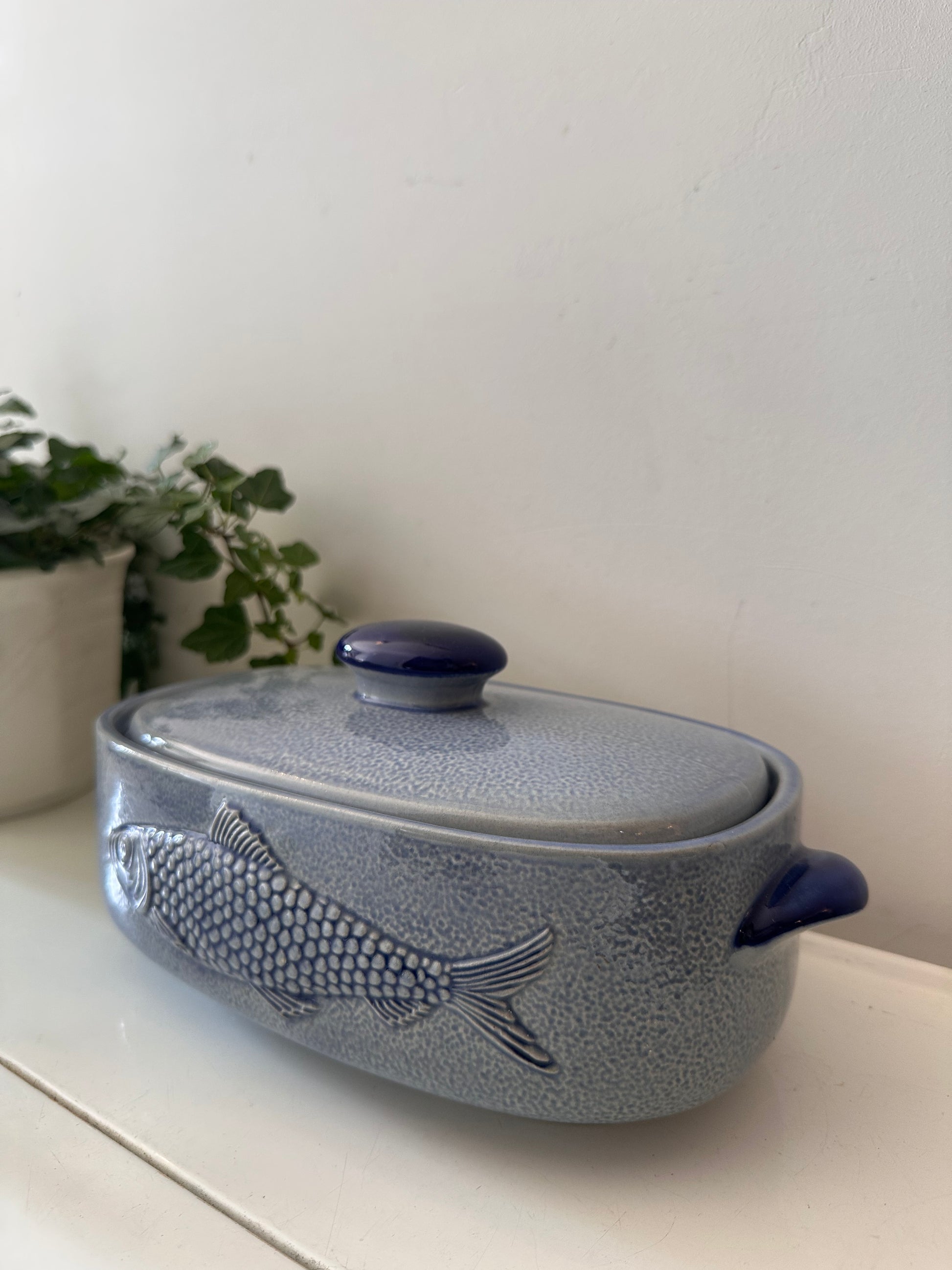 Hoe tof is dit stuk? Blauwe geglazuurde ovenschaal met deksel. Aan beide kanten zit een reliëf van een vis, perfect voor een op tafel of in je keuken. Afkomstig uit Duitsland, gemerkt aan de onderzijde (M.R. stempel, modelnummer 3067). Q398