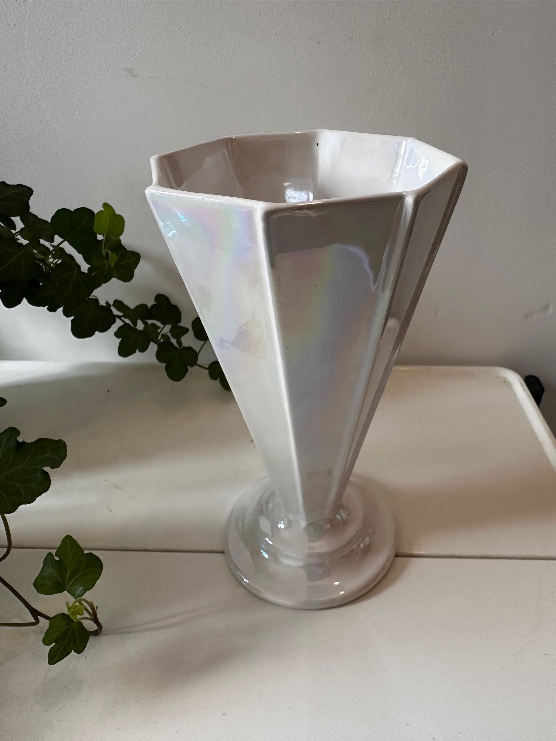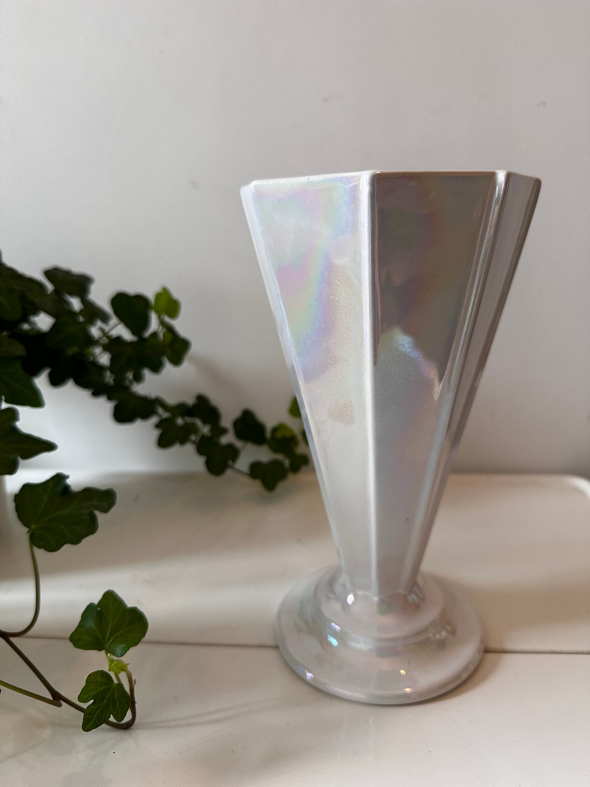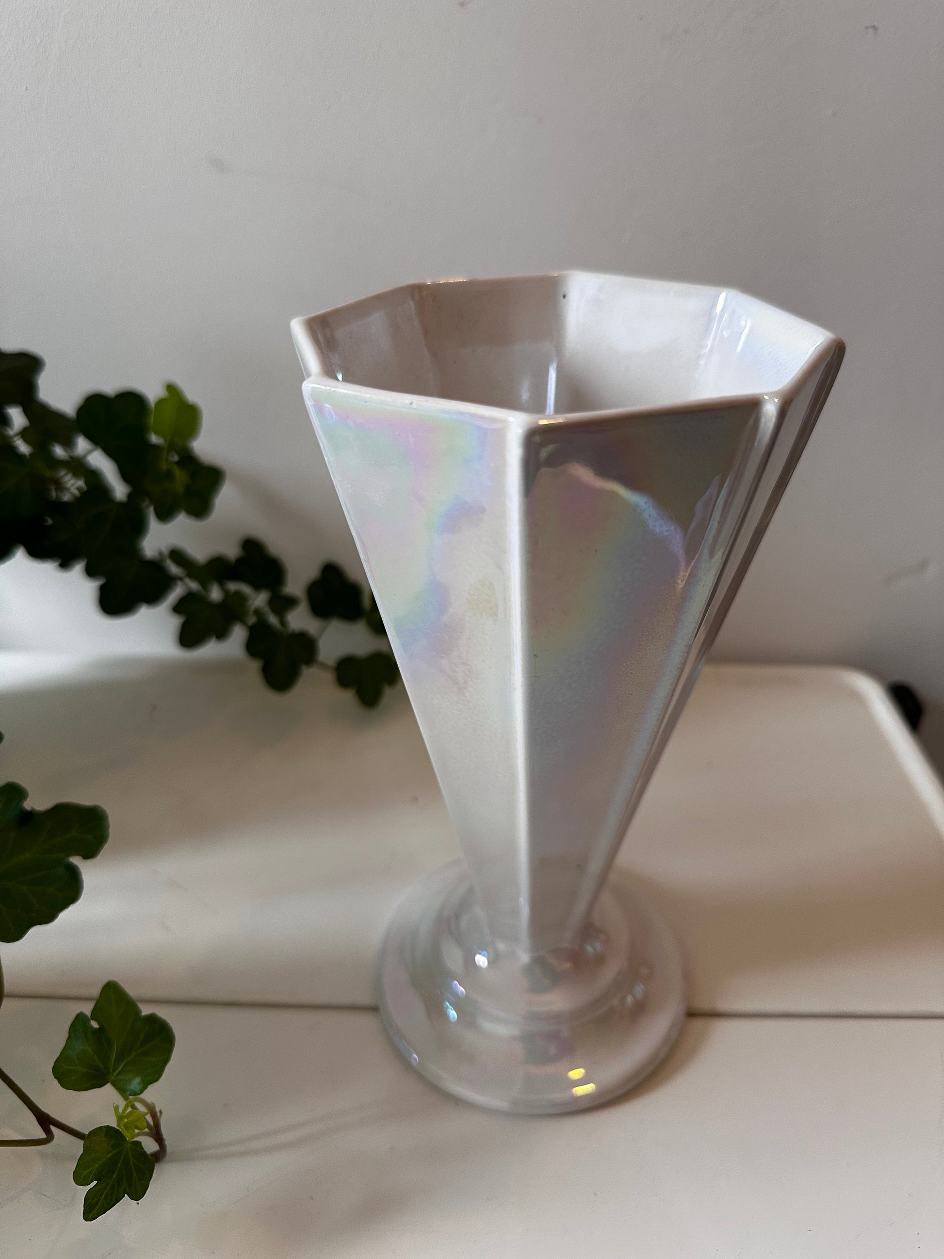 Hele toffe achtkantige vaas met een parelmoer kleur in een top vintage staat. Vaas is een uitlopend model.