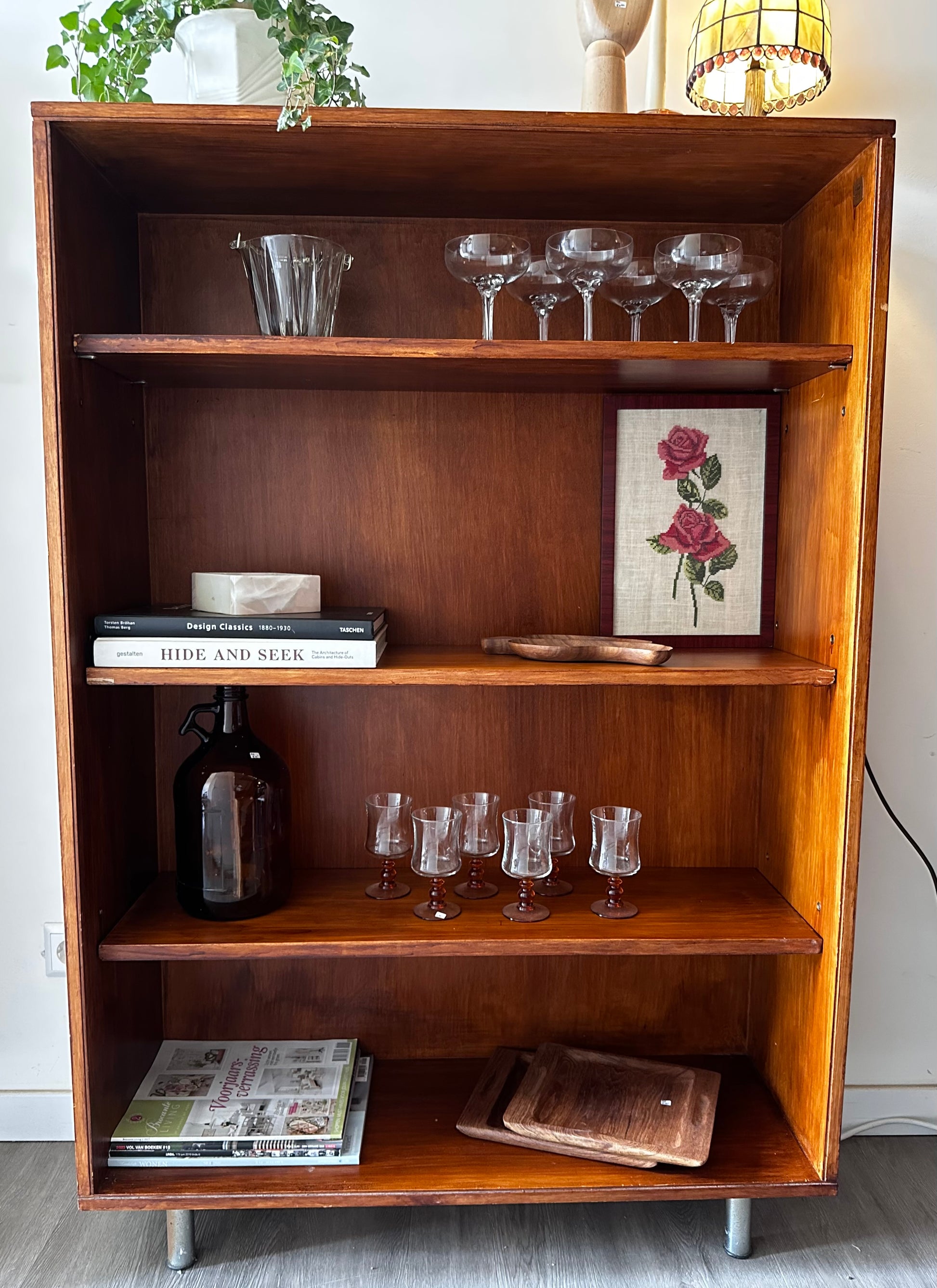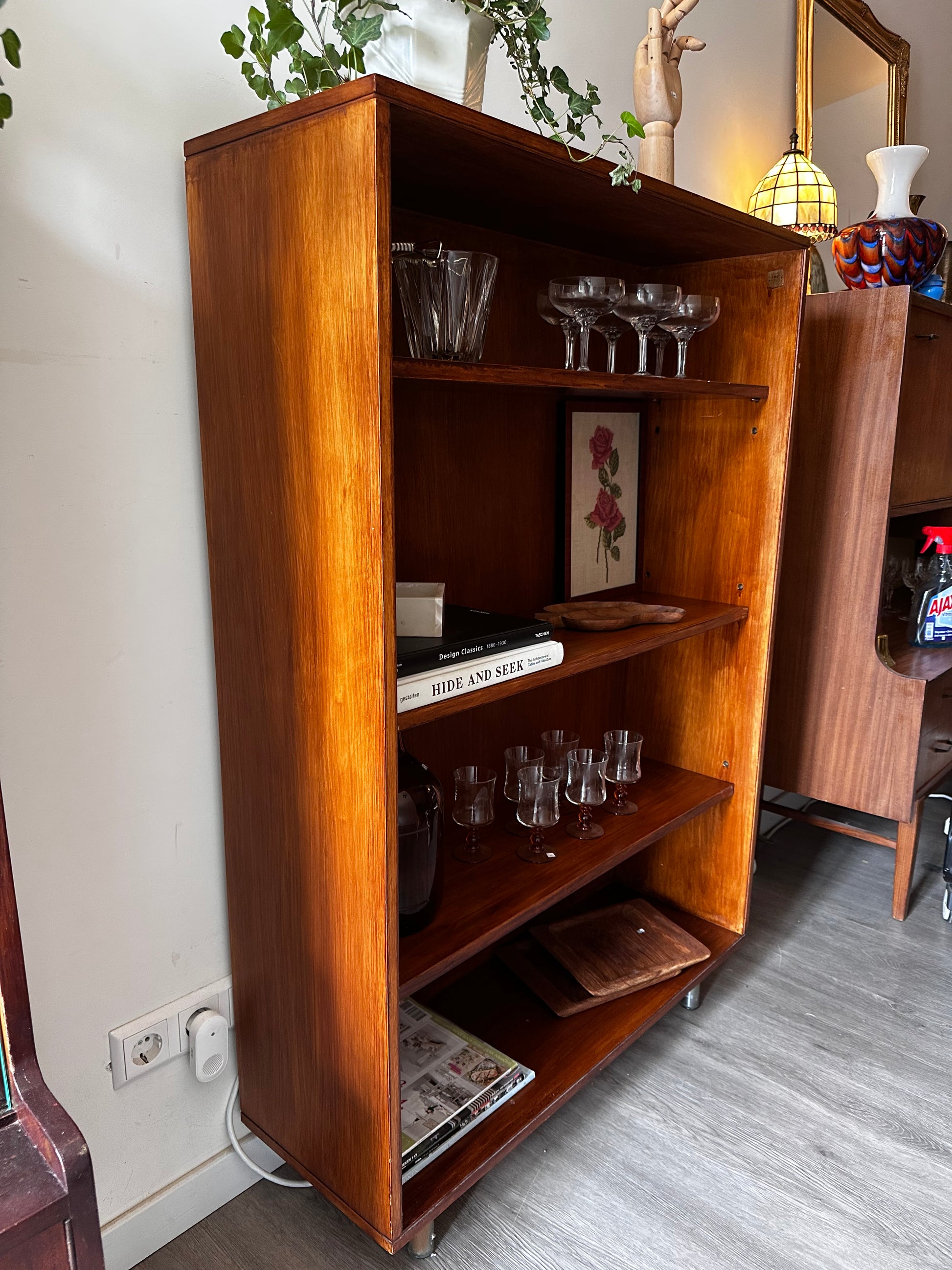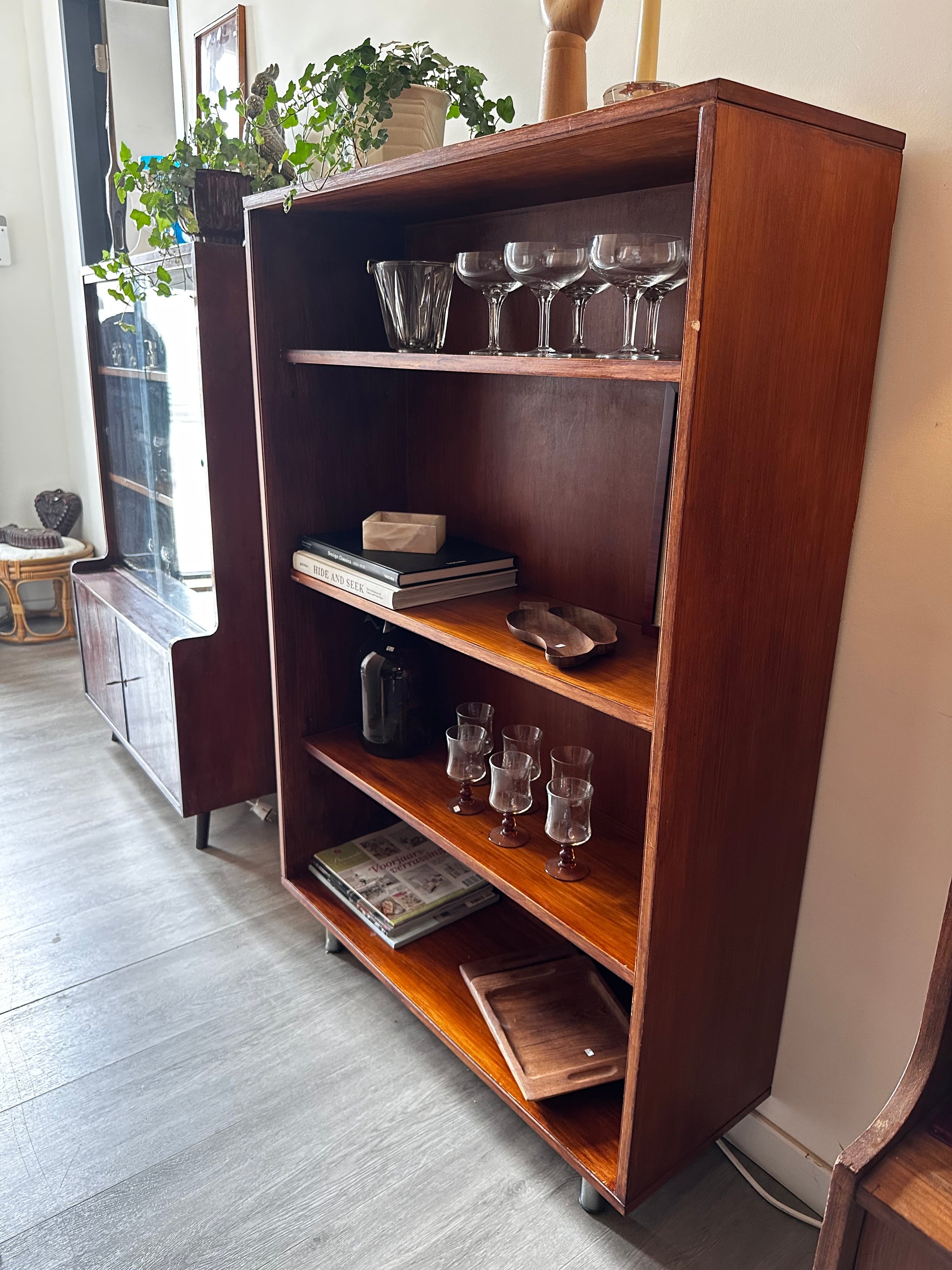 Stijlvolle open boekenkast van Pastoe, vermoedelijk jaren 60. Gemaakt van warm houtfineer met een strak en minimalistisch ontwerp. De kast heeft vier open vakken en staat op kenmerkende metalen pootjes – helemaal in de sfeer van Dutch design uit die tijd.