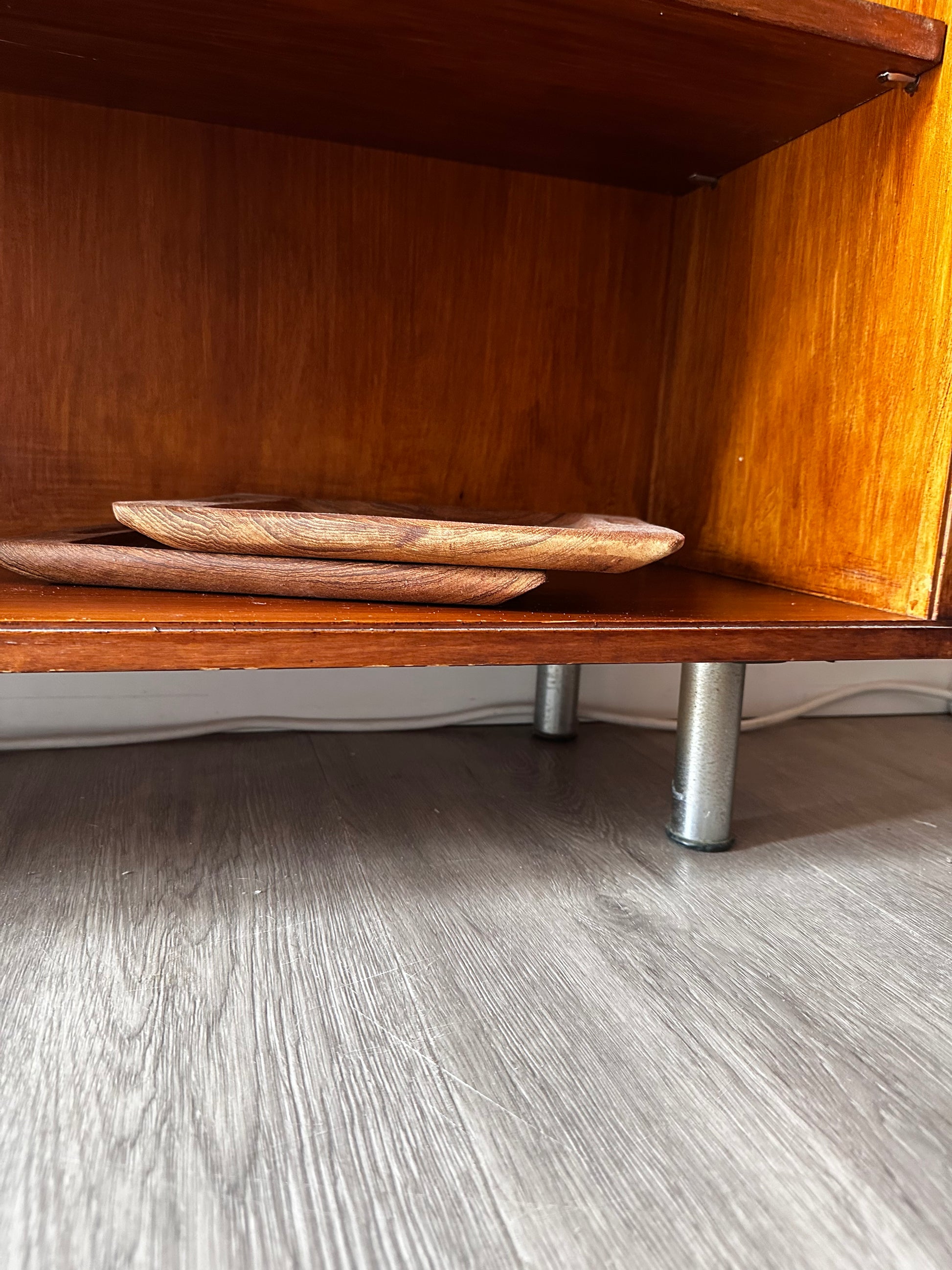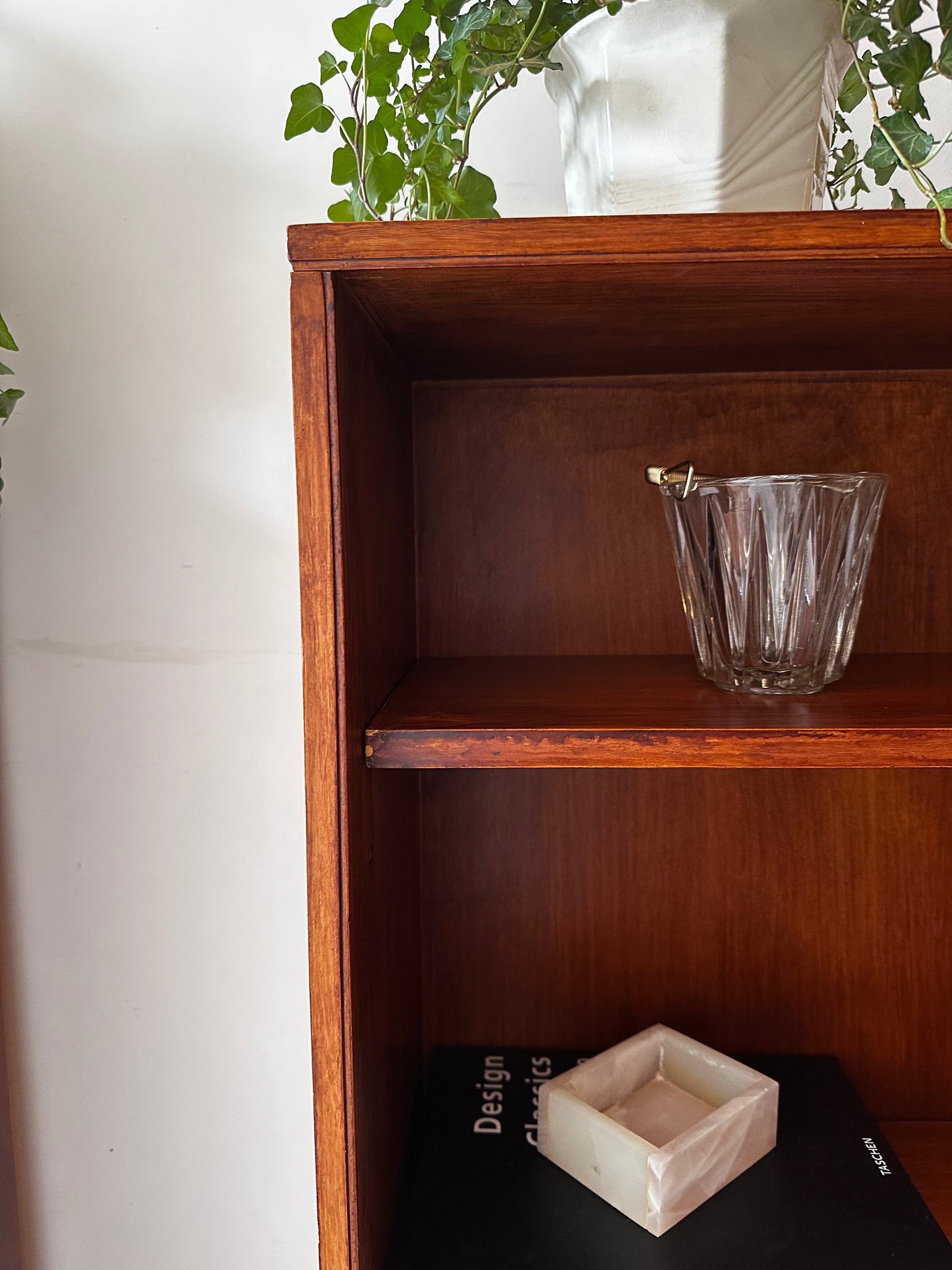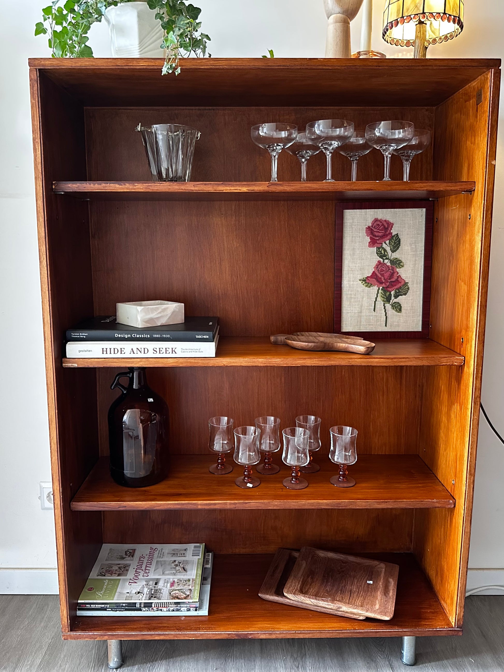 Stijlvolle open boekenkast van Pastoe, vermoedelijk jaren 60. Gemaakt van warm houtfineer met een strak en minimalistisch ontwerp. De kast heeft vier open vakken en staat op kenmerkende metalen pootjes – helemaal in de sfeer van Dutch design uit die tijd.
