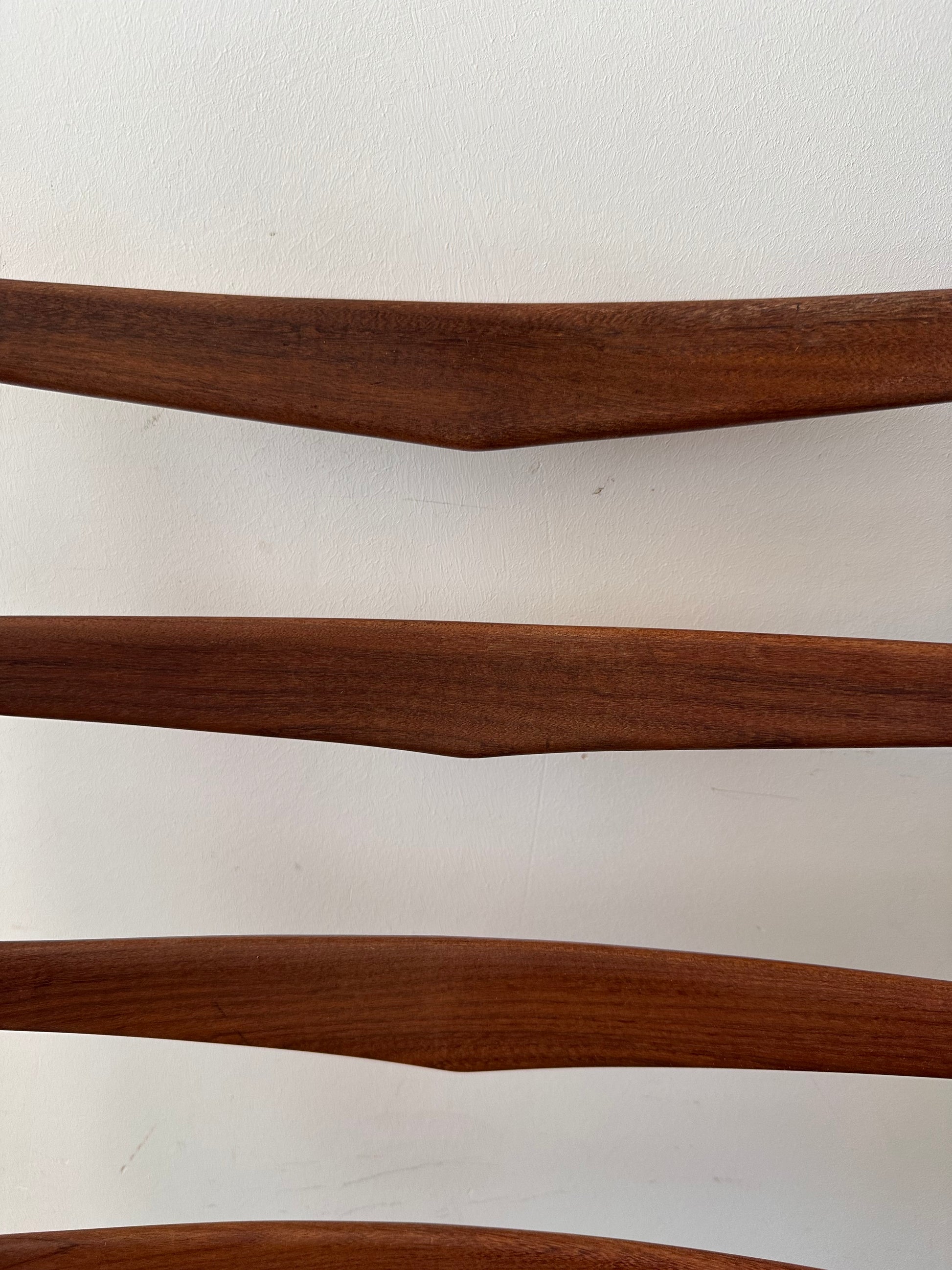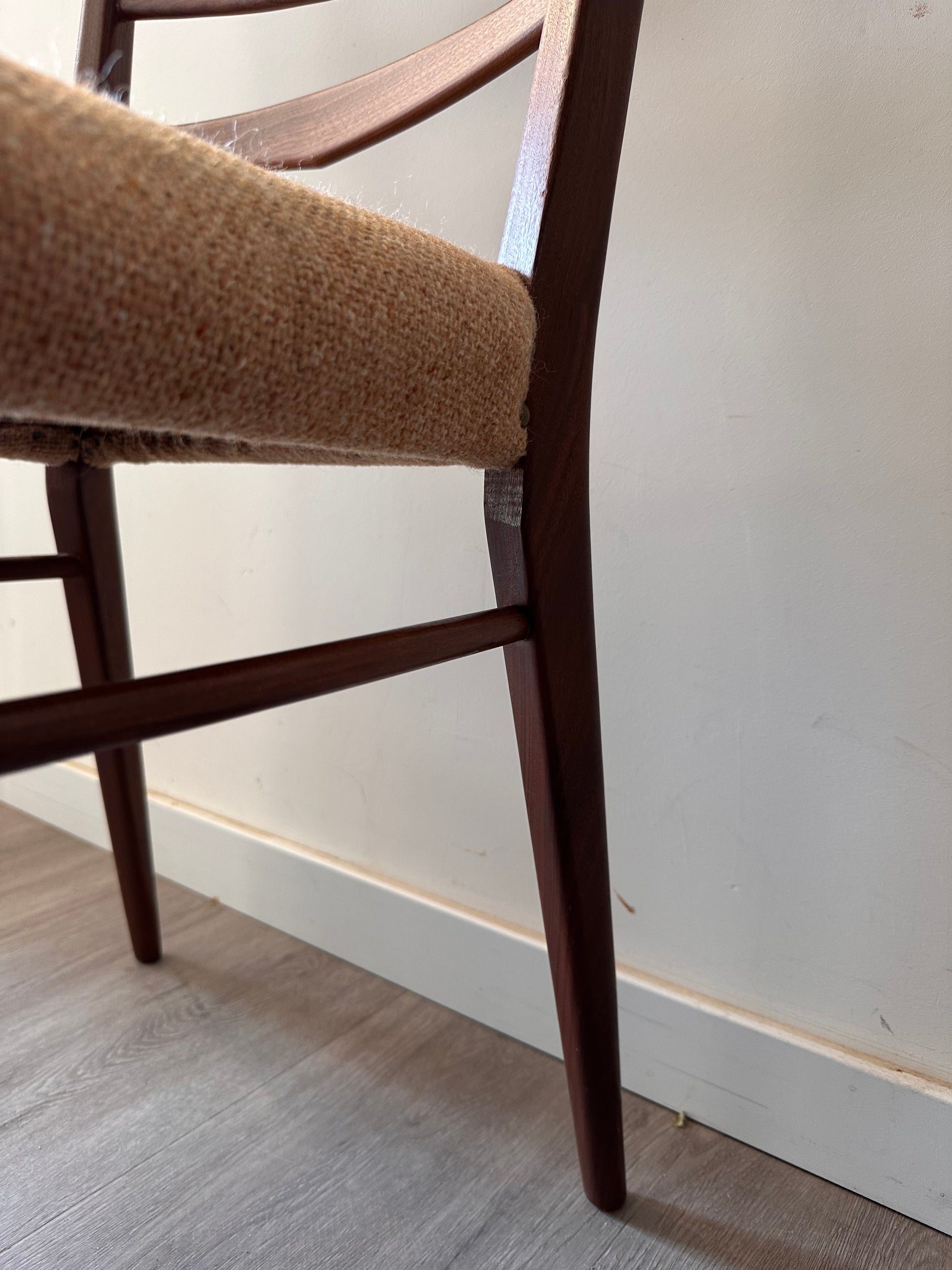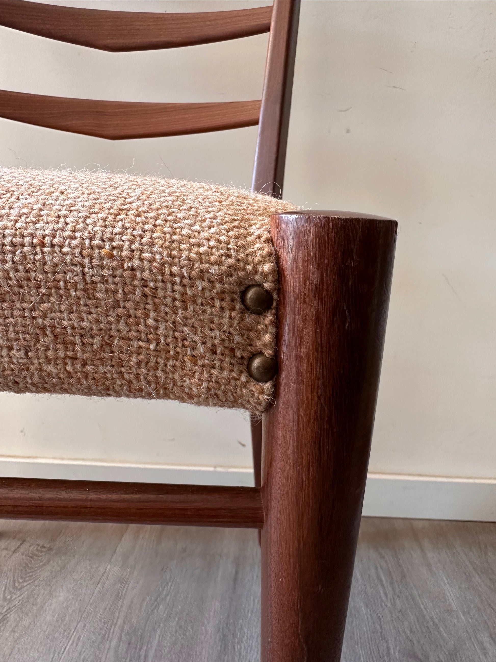 Strakke lijnen, donker houten frame en die herkenbare ladderback rugleuning – helemaal jaren 60. De zitting is bekleed met een grove, warmbeige stof met stoere messing nagels aan de zijkant. Stevig, comfortabel en nog altijd een tijdloos designstuk voor aan tafel of als losse stoel.