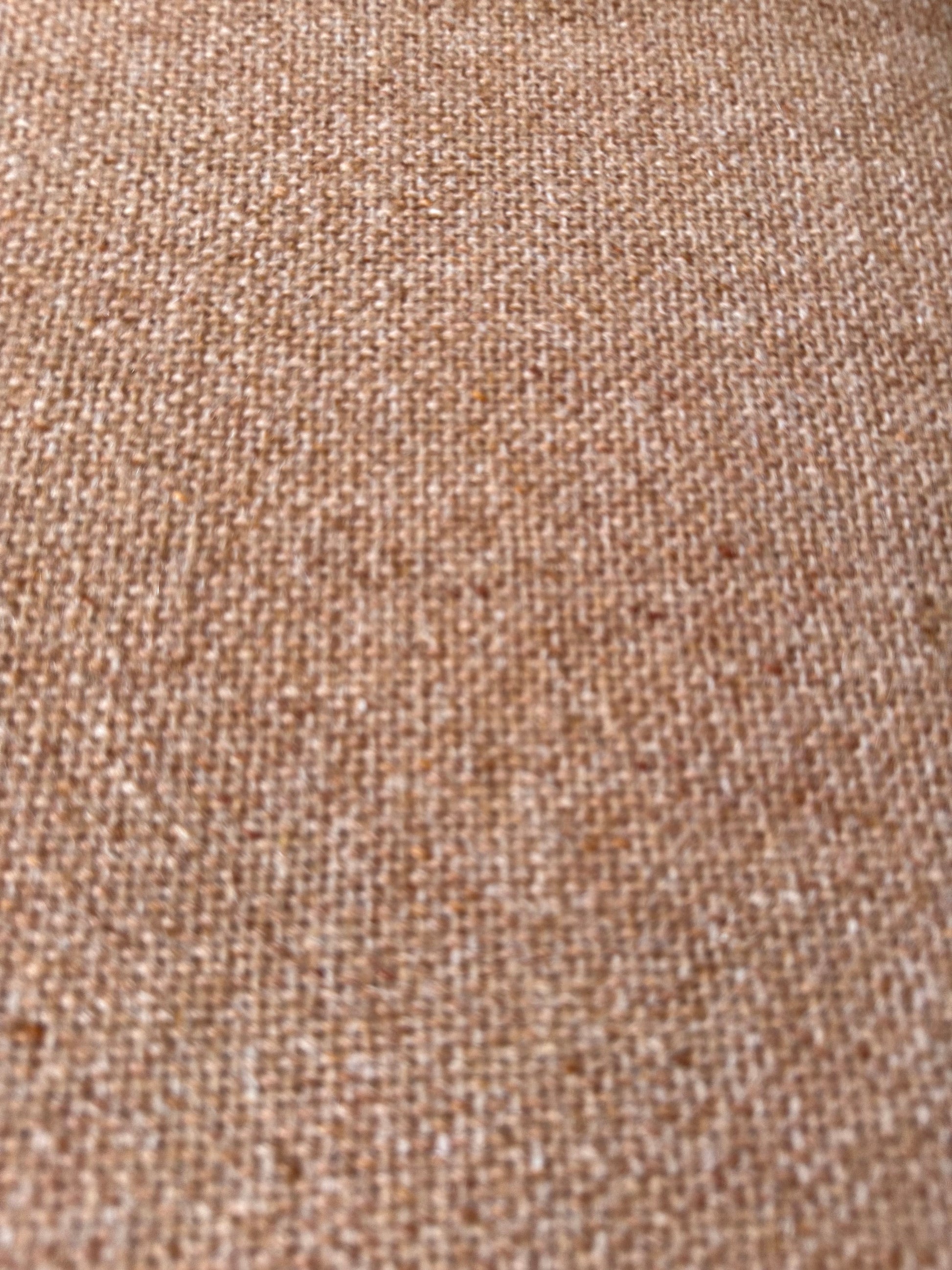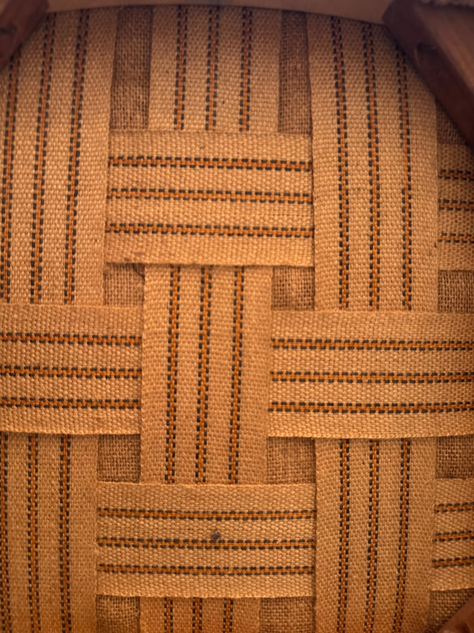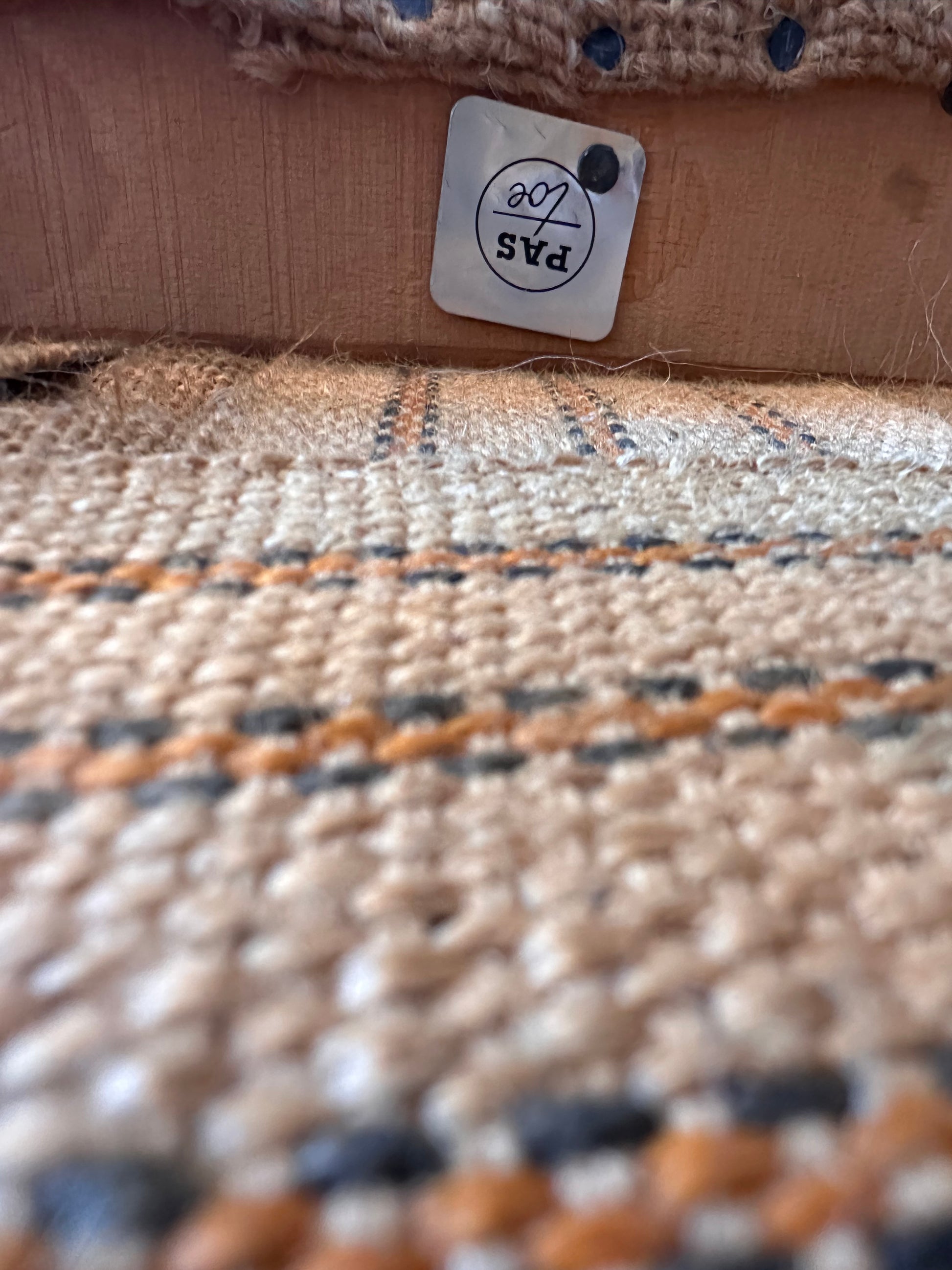 Strakke lijnen, donker houten frame en die herkenbare ladderback rugleuning – helemaal jaren 60. De zitting is bekleed met een grove, warmbeige stof met stoere messing nagels aan de zijkant. Stevig, comfortabel en nog altijd een tijdloos designstuk voor aan tafel of als losse stoel.