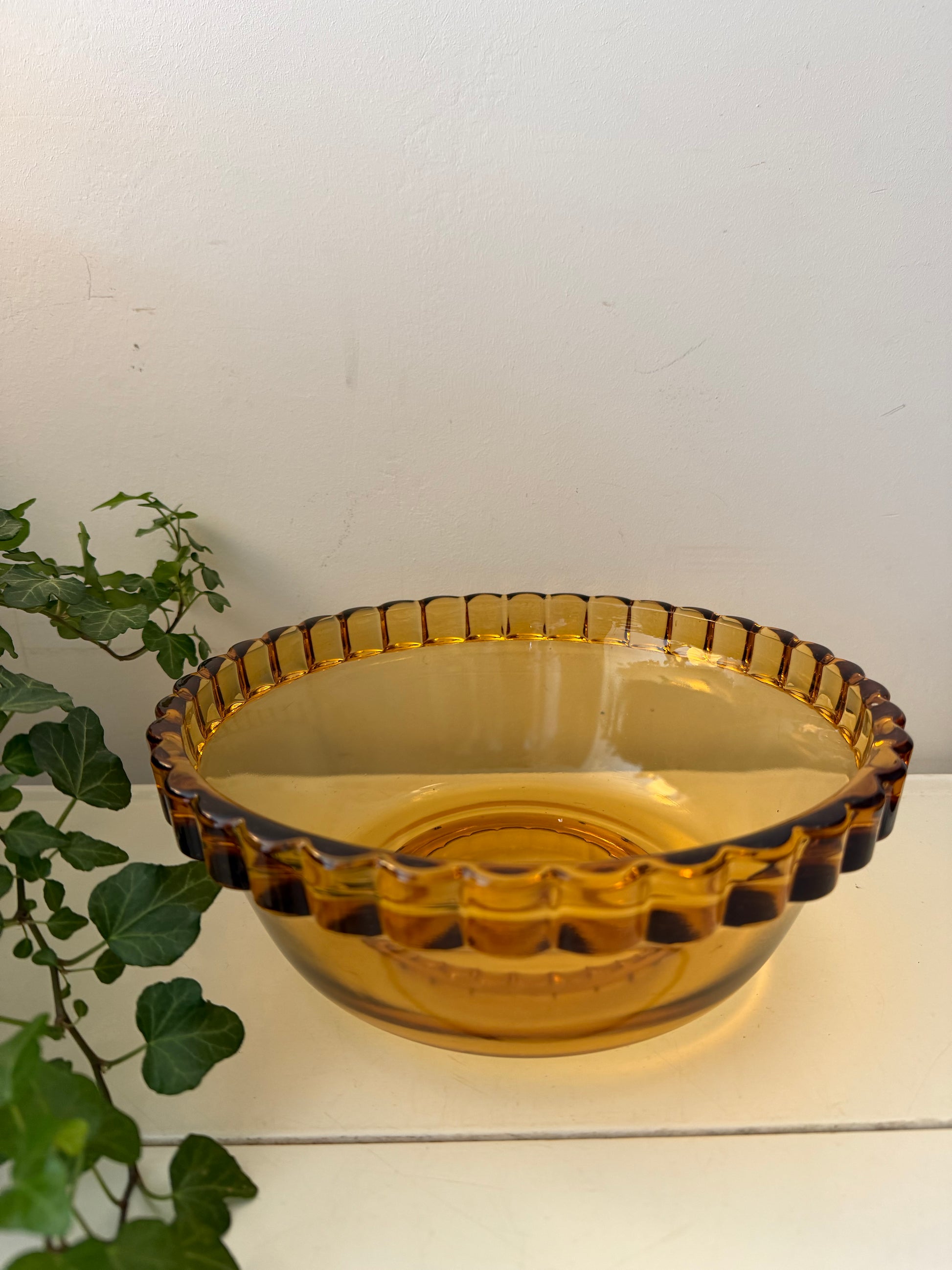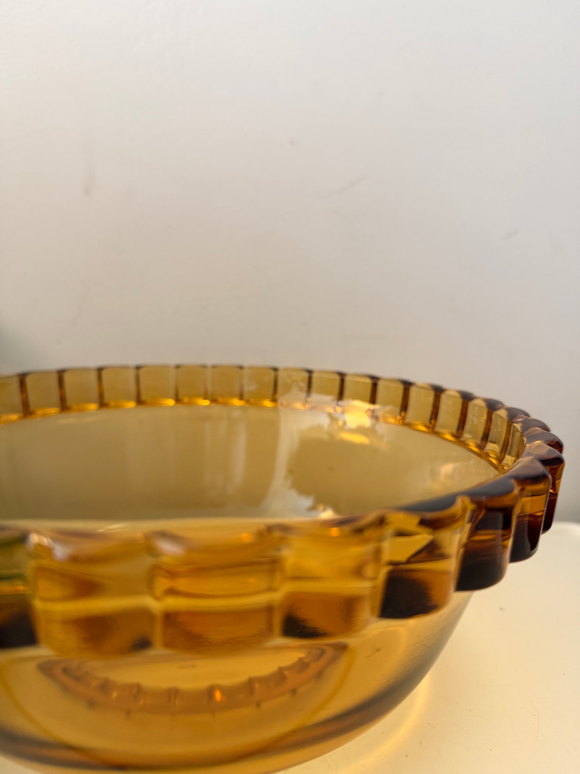 Wát een heerlijke amber/geelkleurige glasschaal 😍 Die warme kleur knalt er echt uit en die rand met halve bolletjes maakt ‘m extra leuk. Mooi zwaar glas en supermooie glans, echt zo’n fijne seventies schaal. Q832