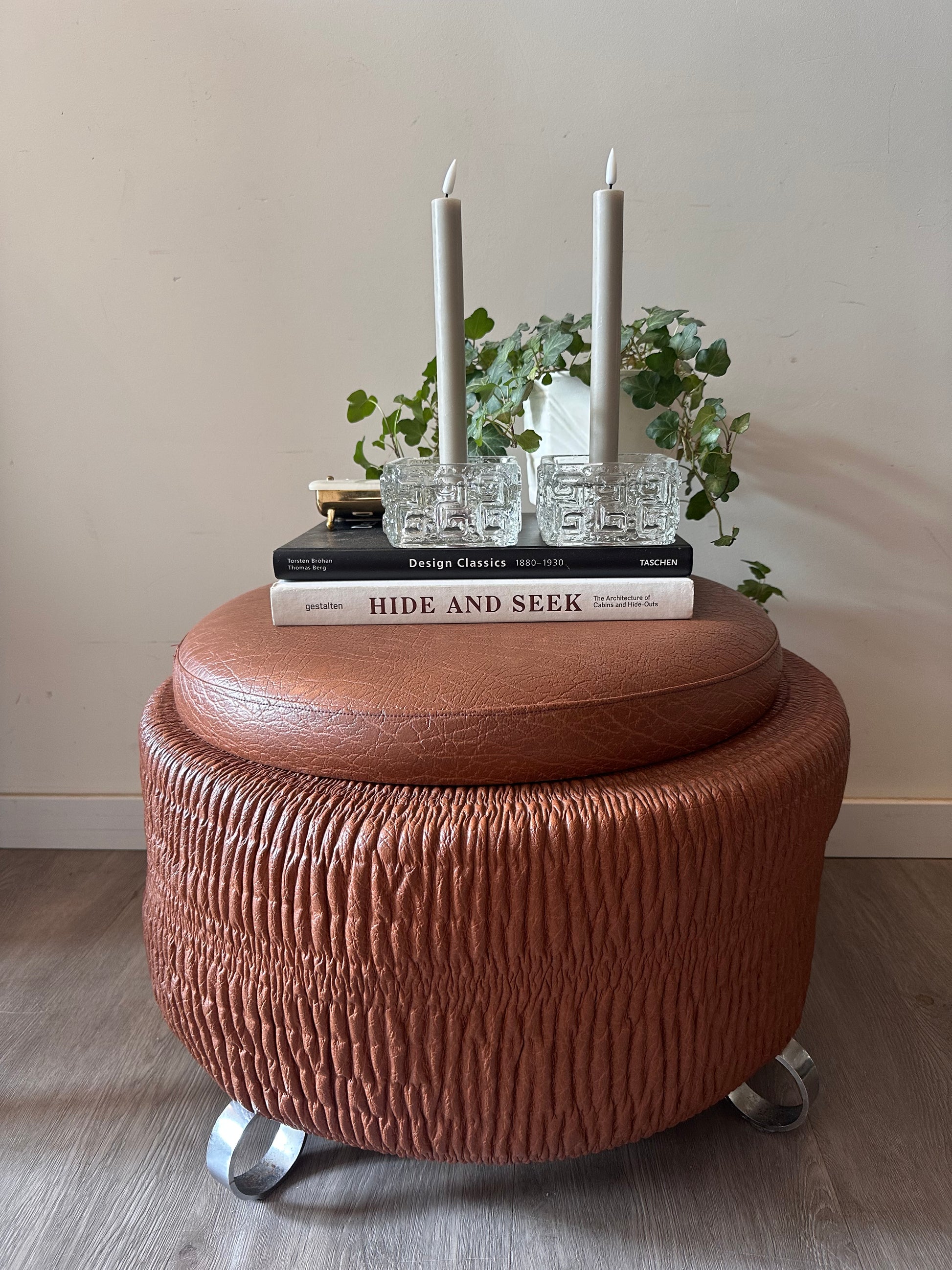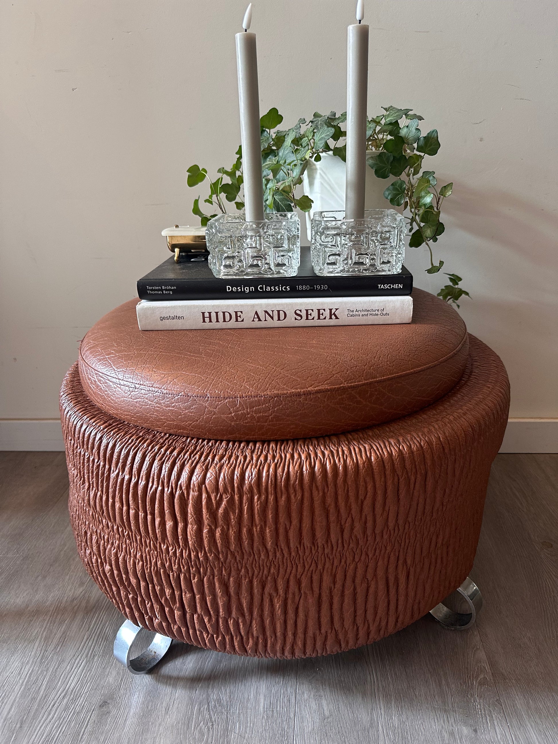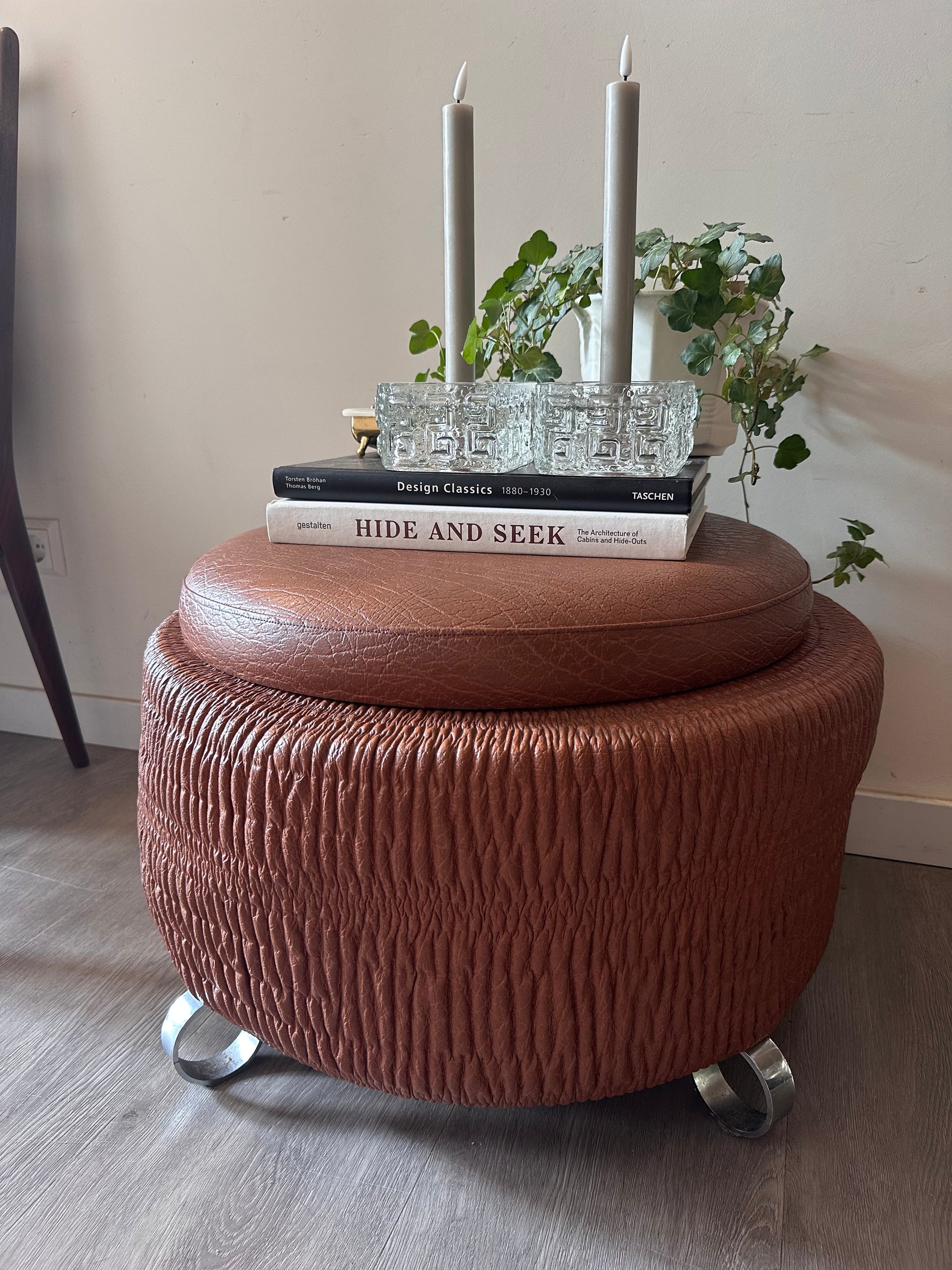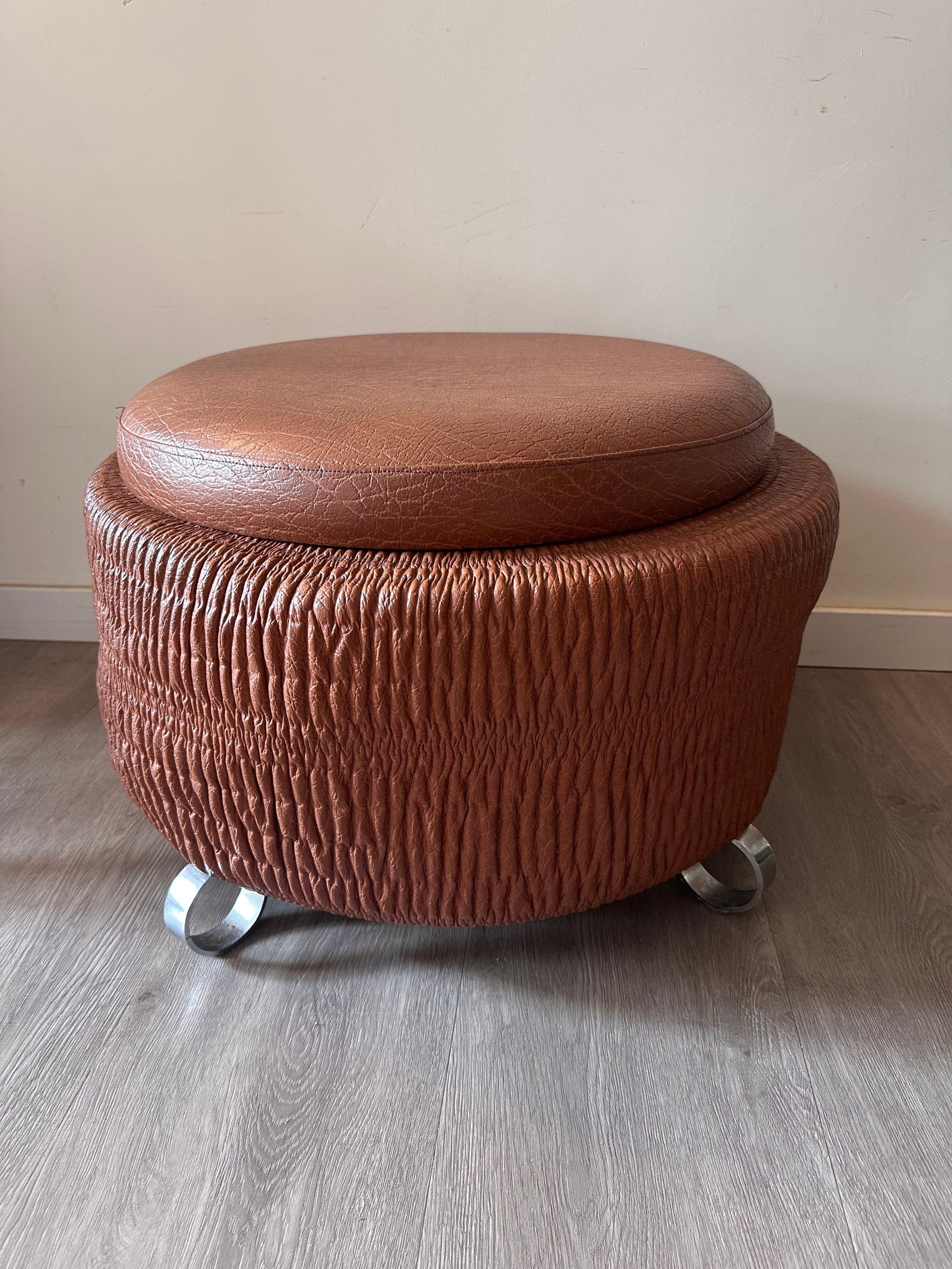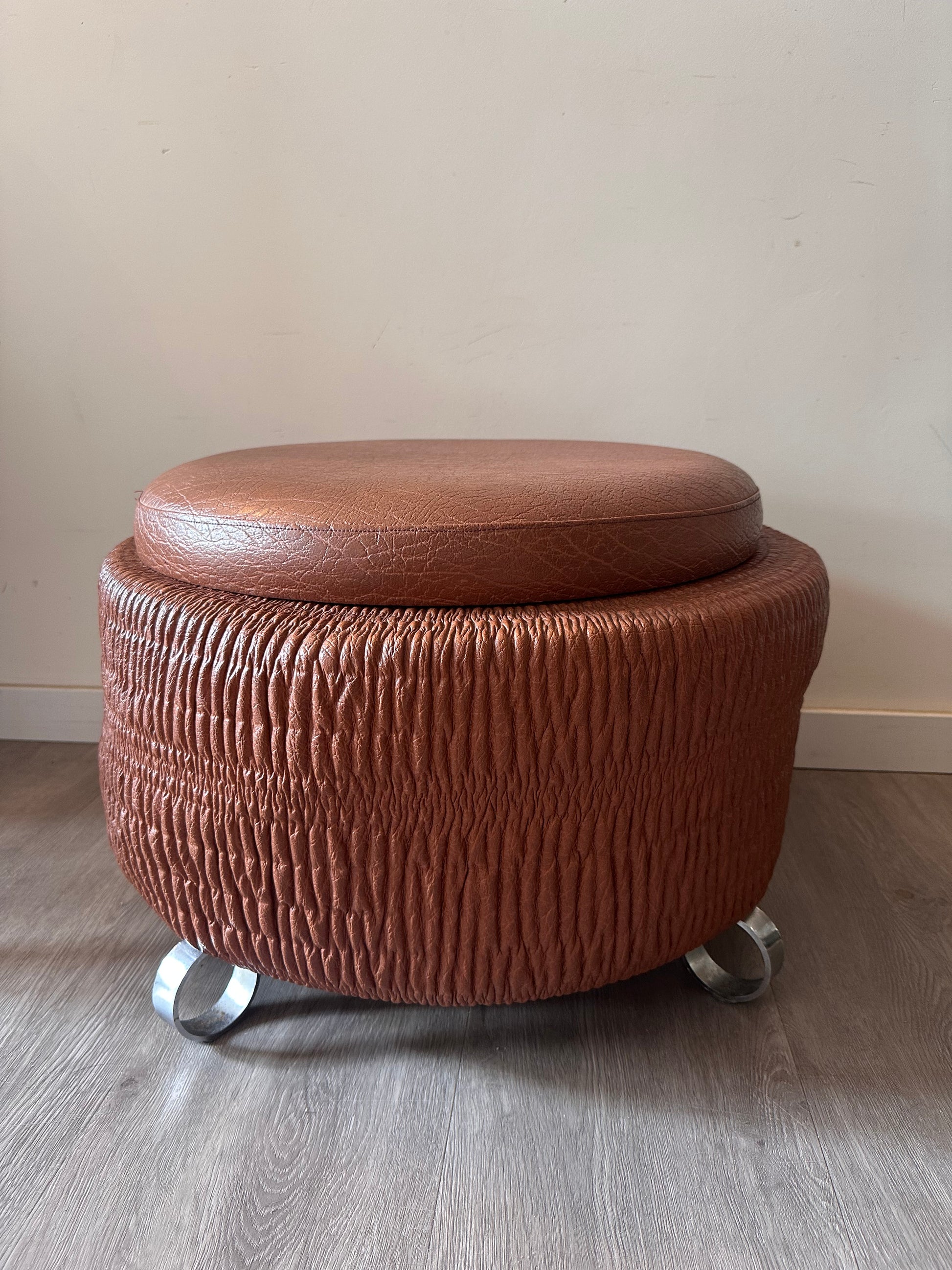 Wat een toffe vondst is deze retro poef! Uitgevoerd in bruin skai met die typische jaren ‘70 textuur en stoere metalen pootjes. Het ronde model heeft een los deksel, waardoor je er ook nog wat in kunt opbergen. Echt zo’n gaaf vintage stuk dat je als extra zitplaats, bijzettafel of gewoon als blikvanger kunt gebruiken. Q347