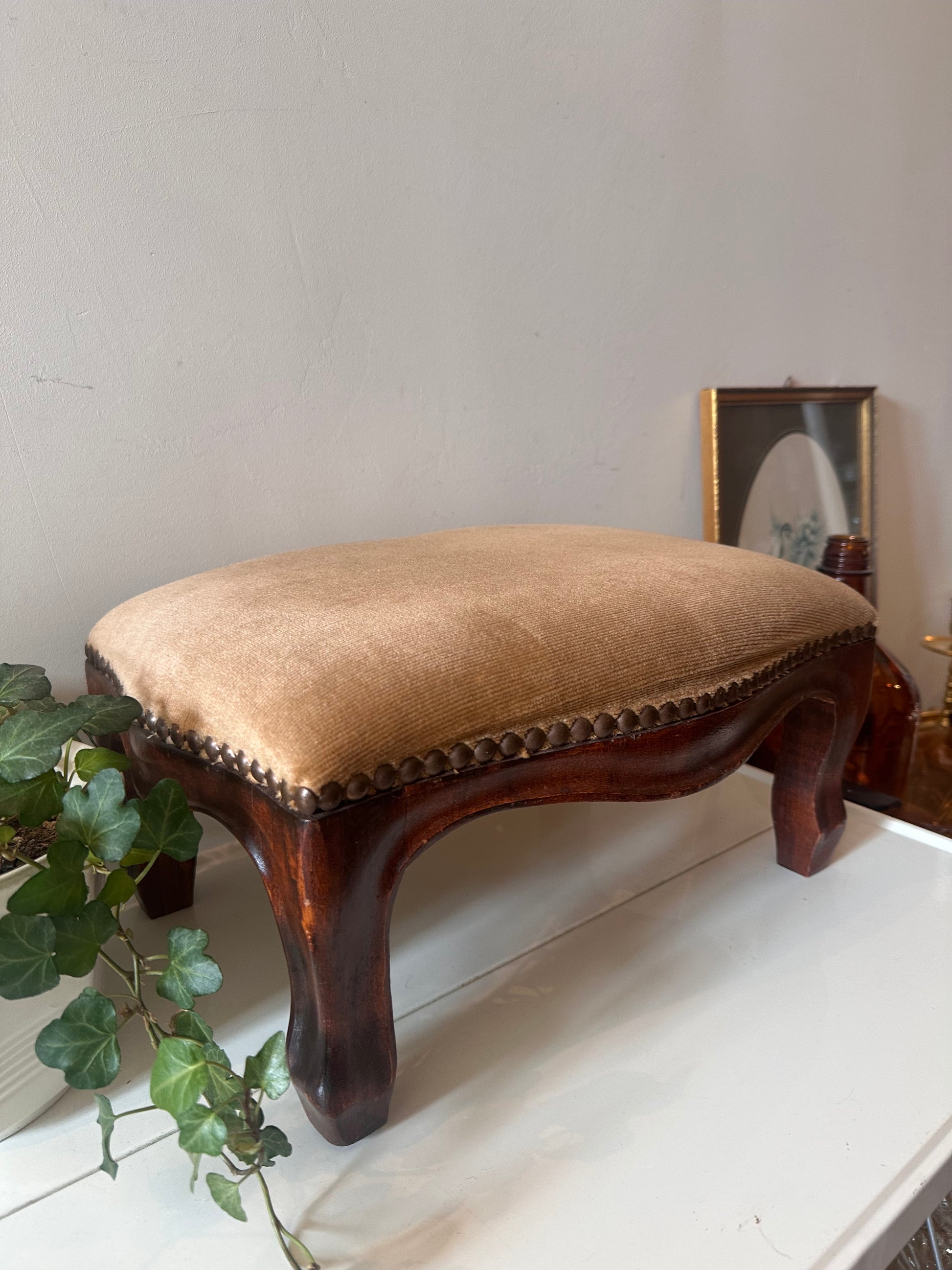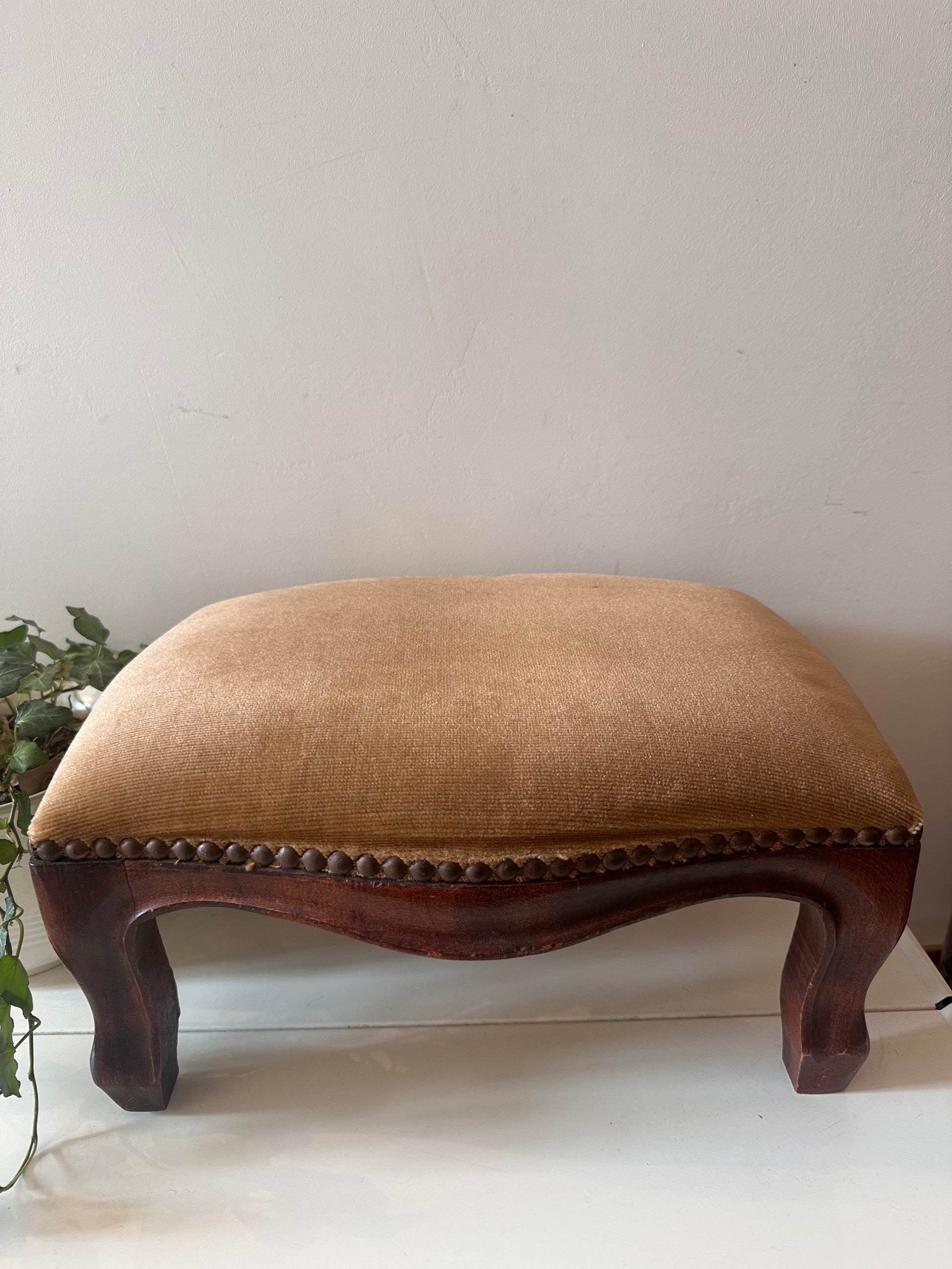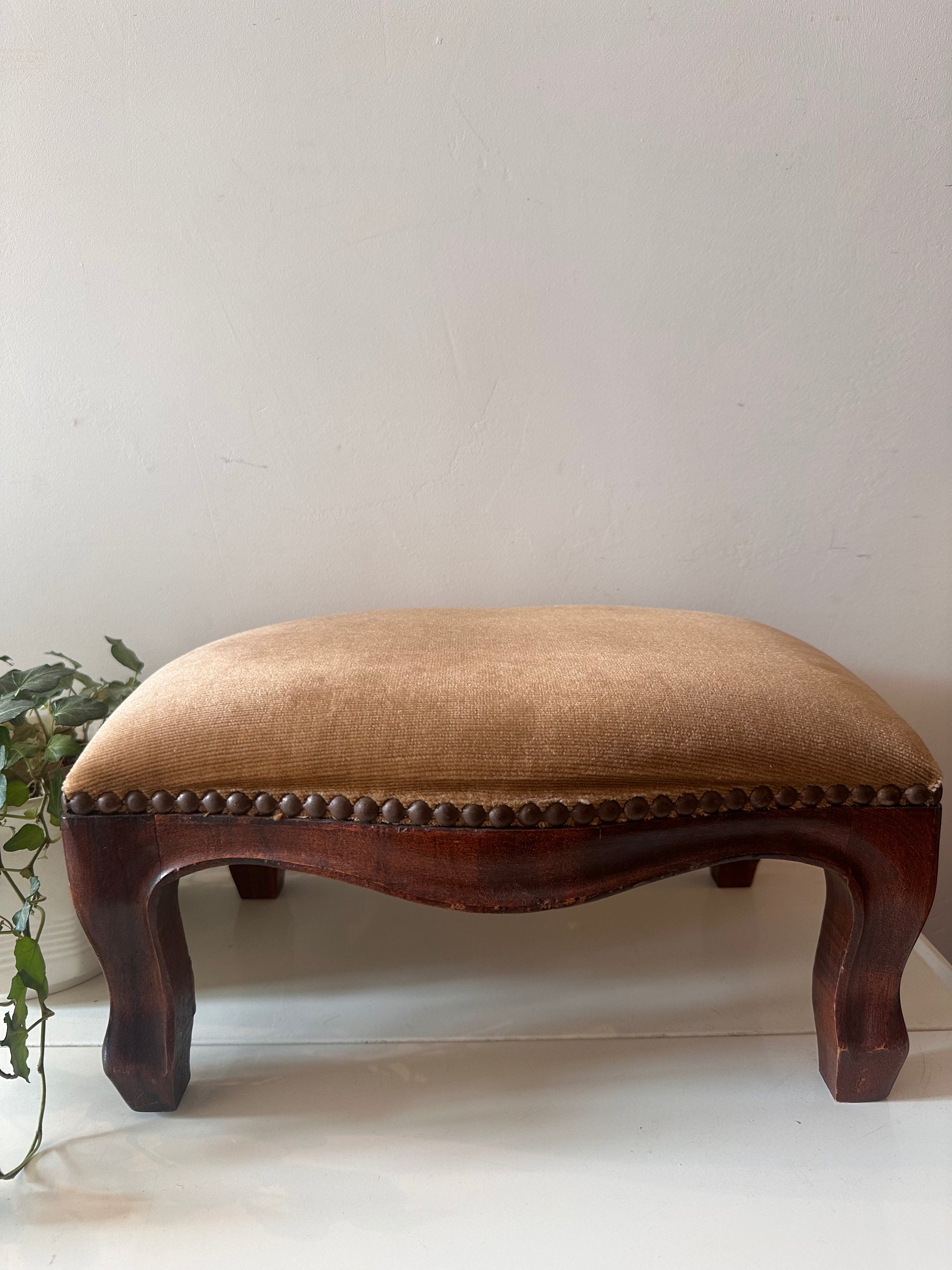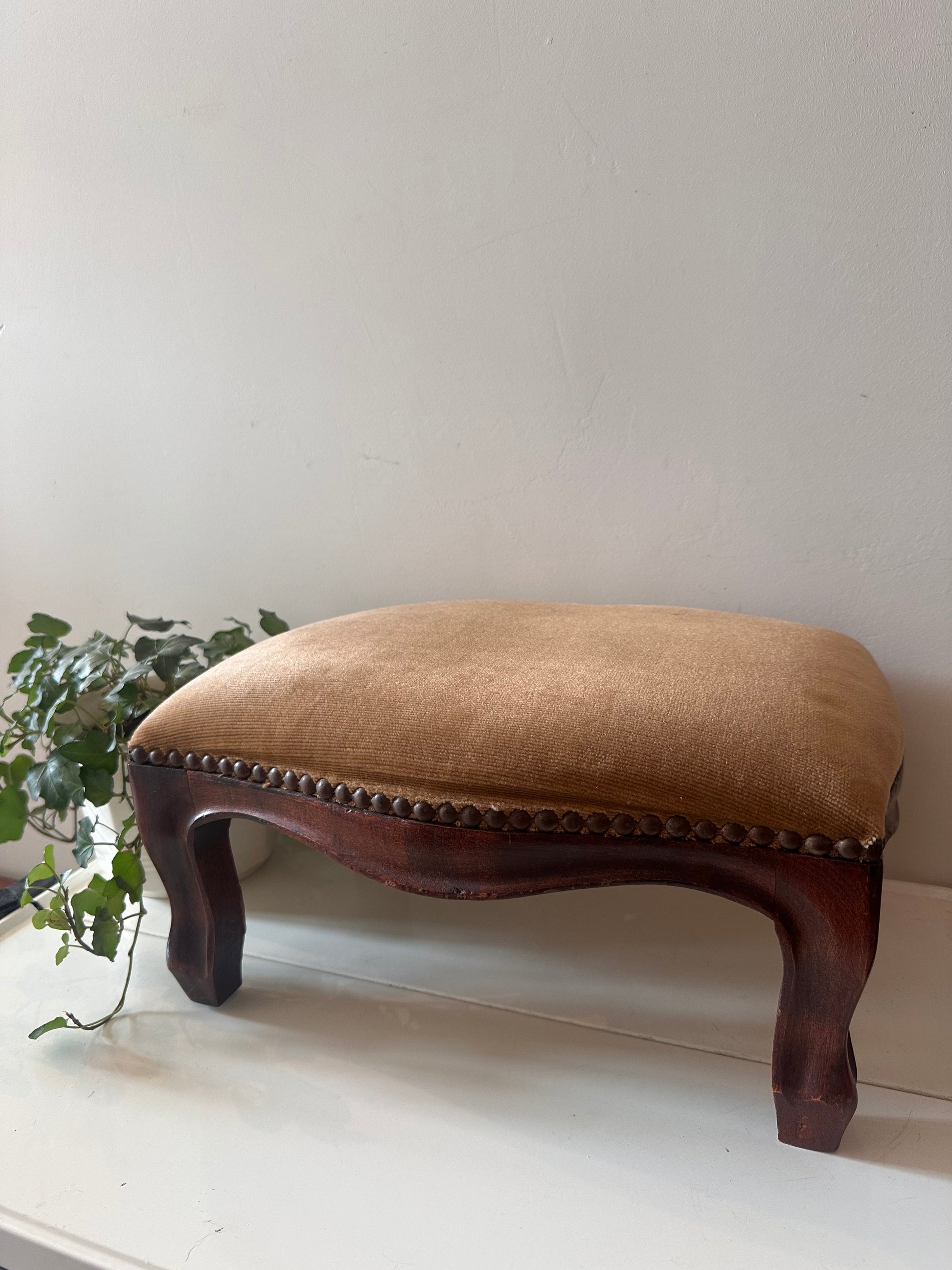 Klein maar superleuk, dit klassieke voetenbankje met houten onderstel en bronskleurige siernagels. Het zachte velours in warme bruintint en de gebogen houten pootjes geven ‘m die leuke charme.