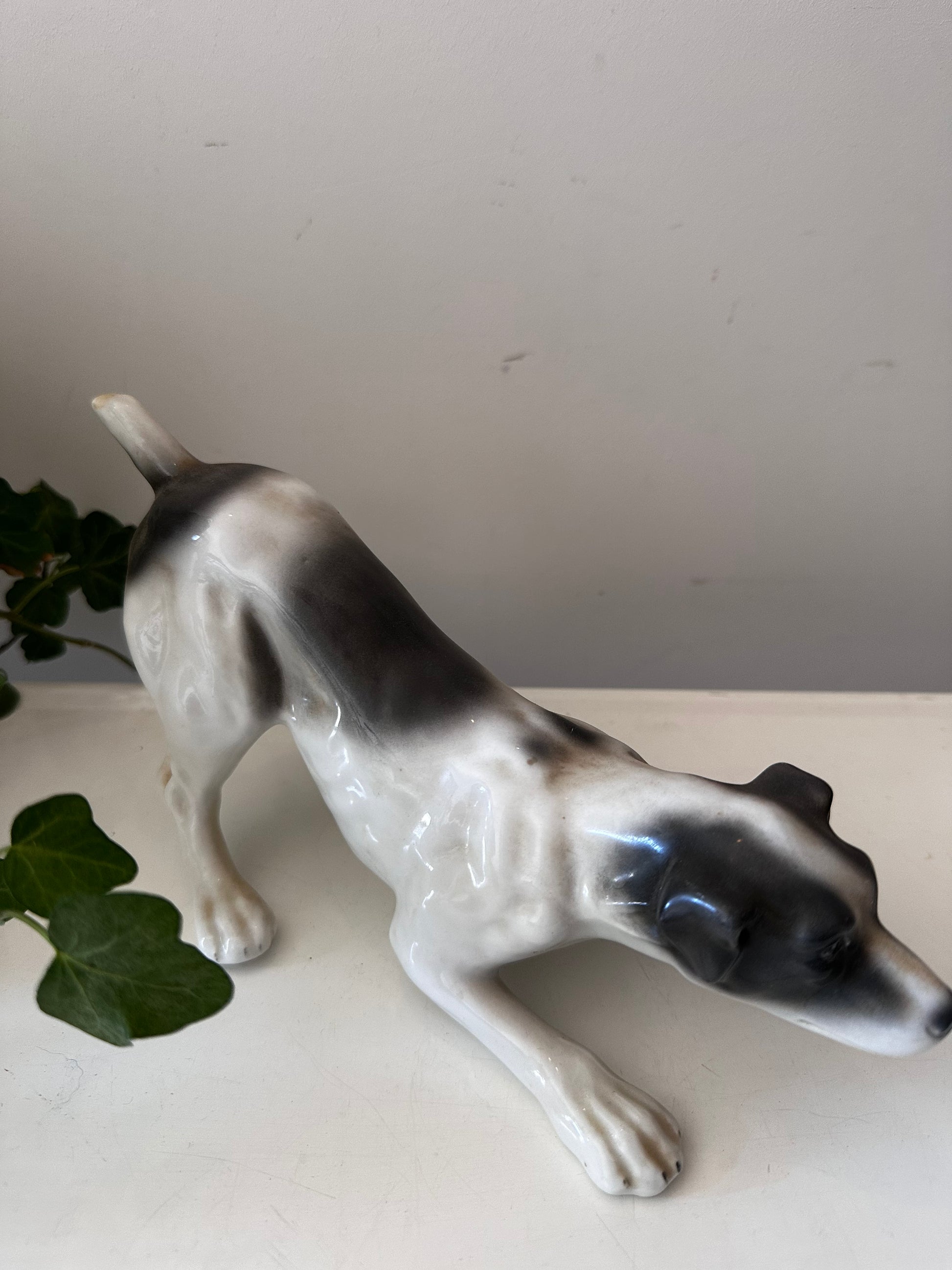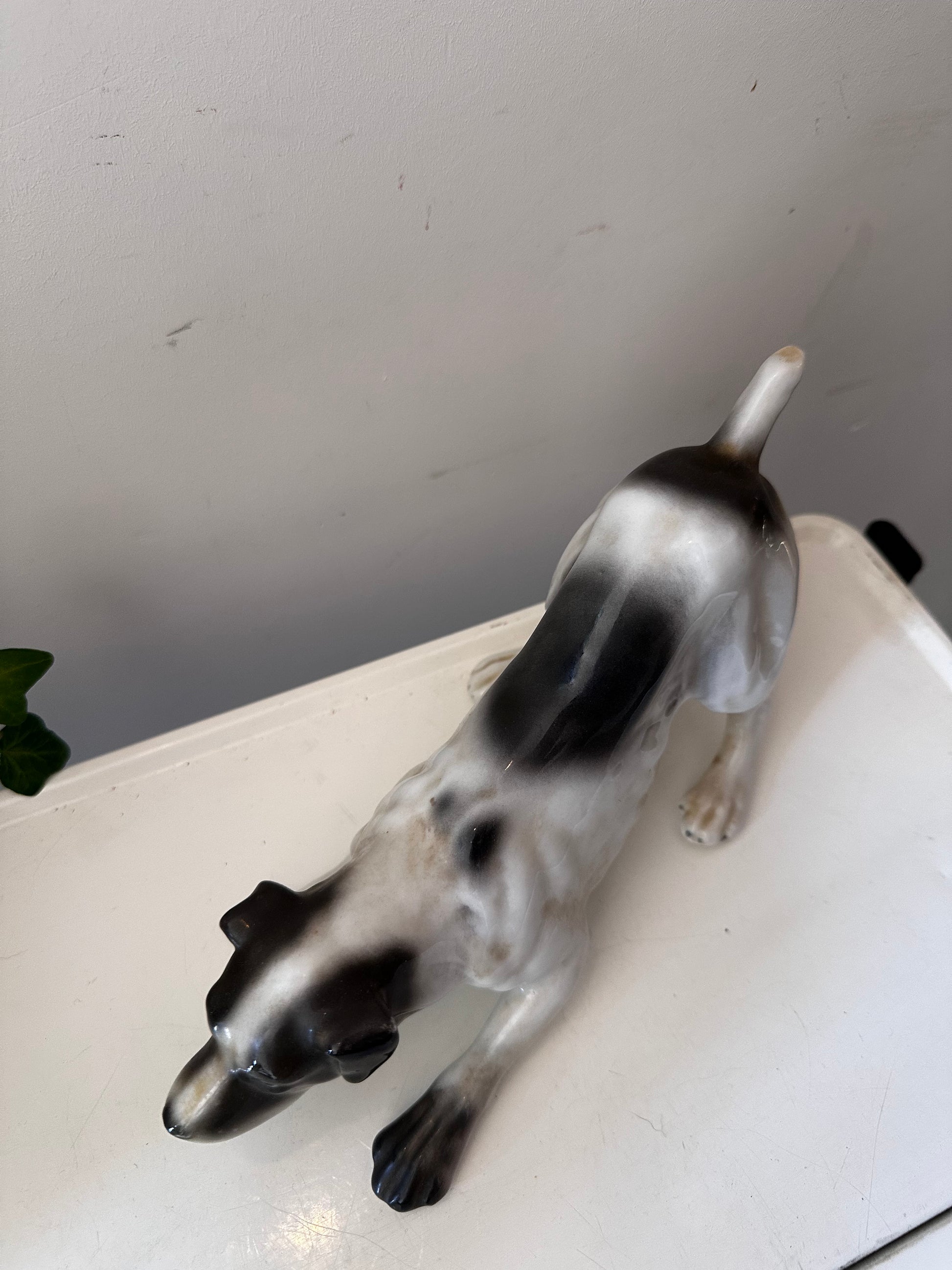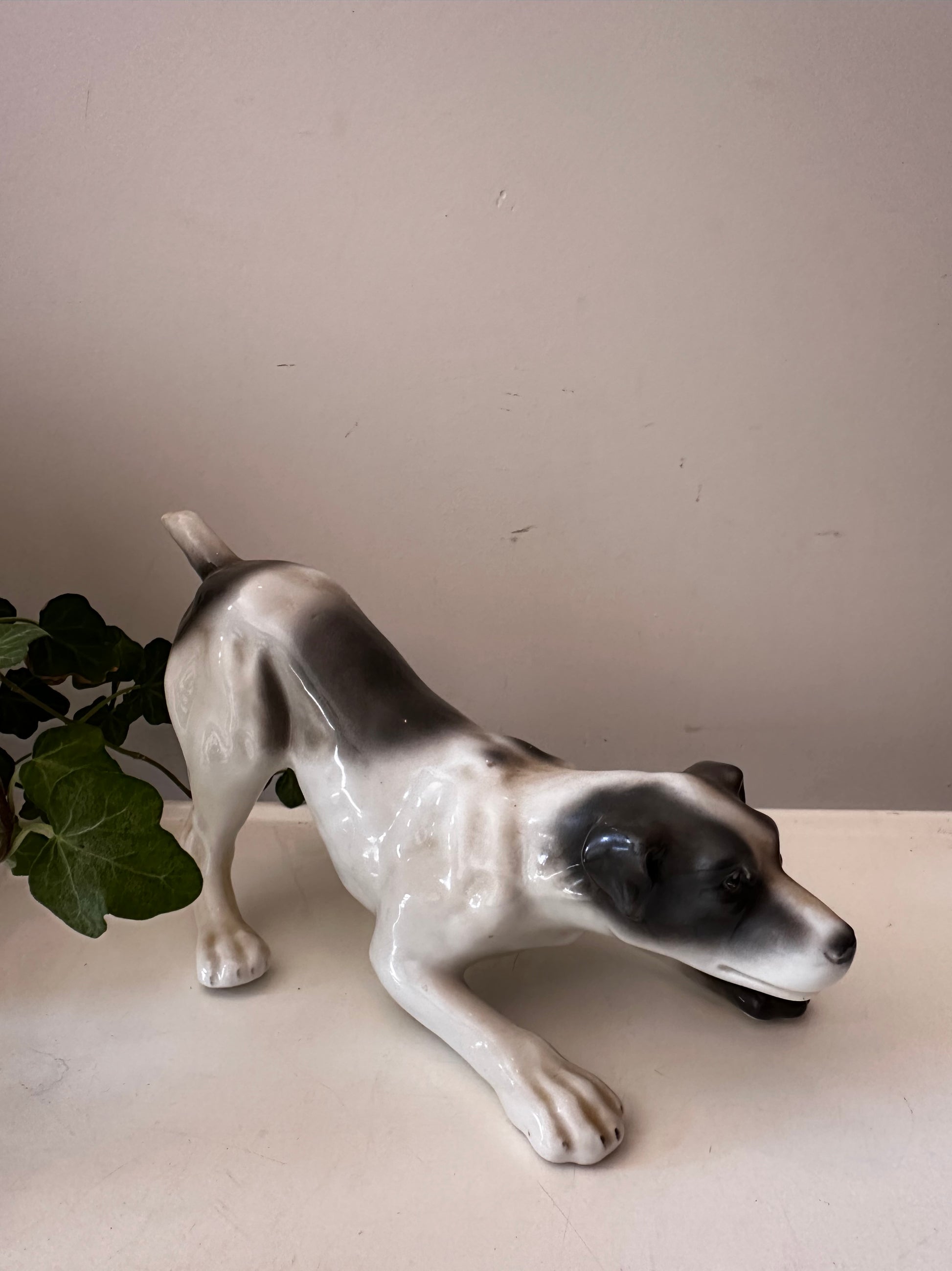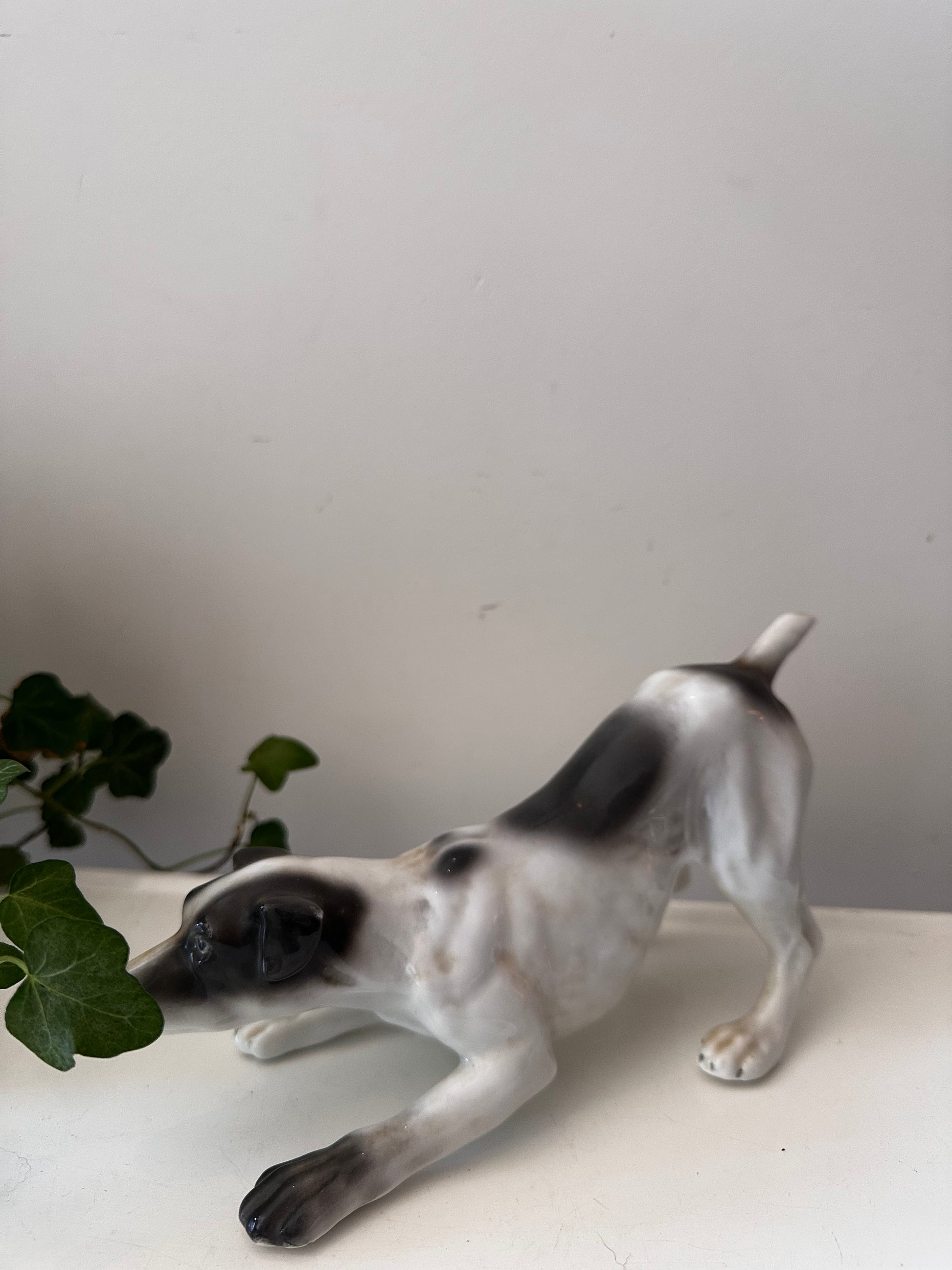 Tof porseleinen beeldje van een speurende hond in lage houding. Mooi afgewerkt in zachte grijstinten met een glanzend glazuur. In een mooie vintage staat. Op de pootjes onder zitten merkjes maar moeilijk te zien