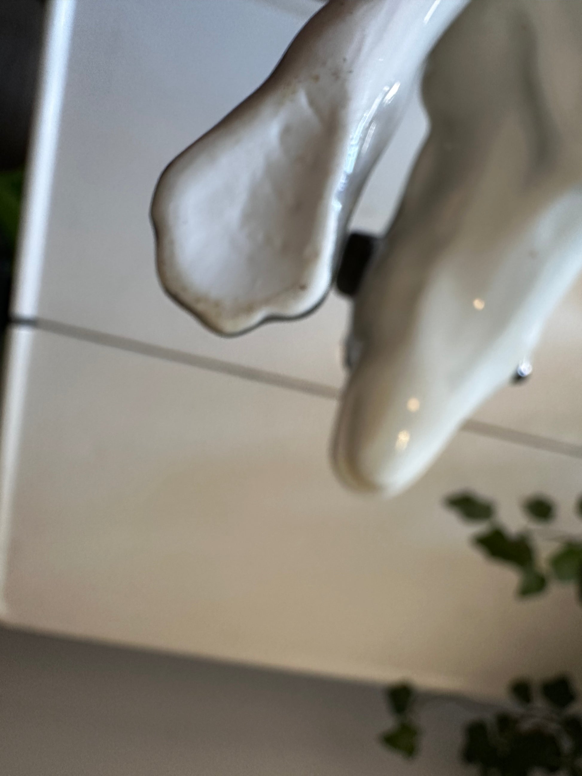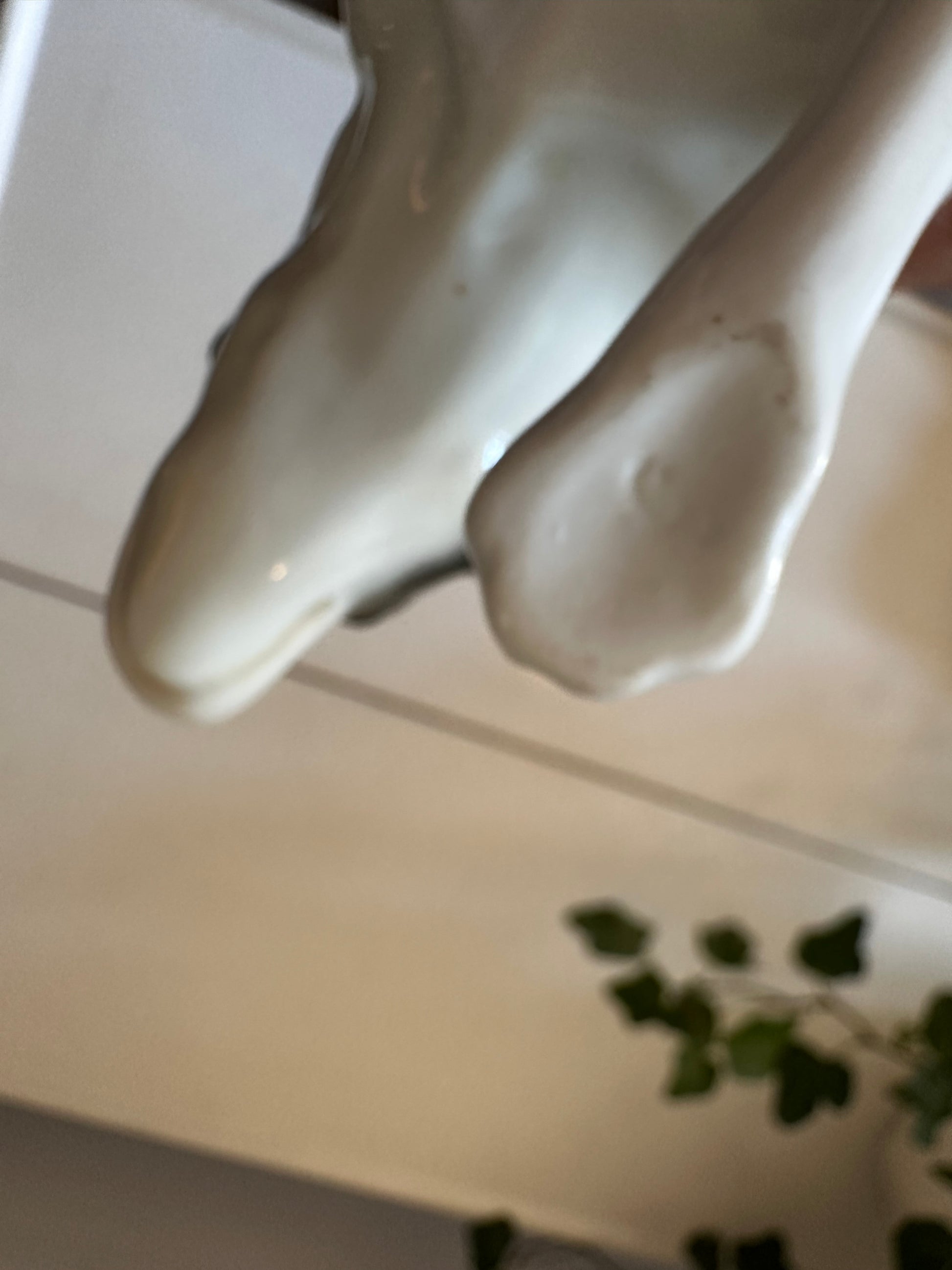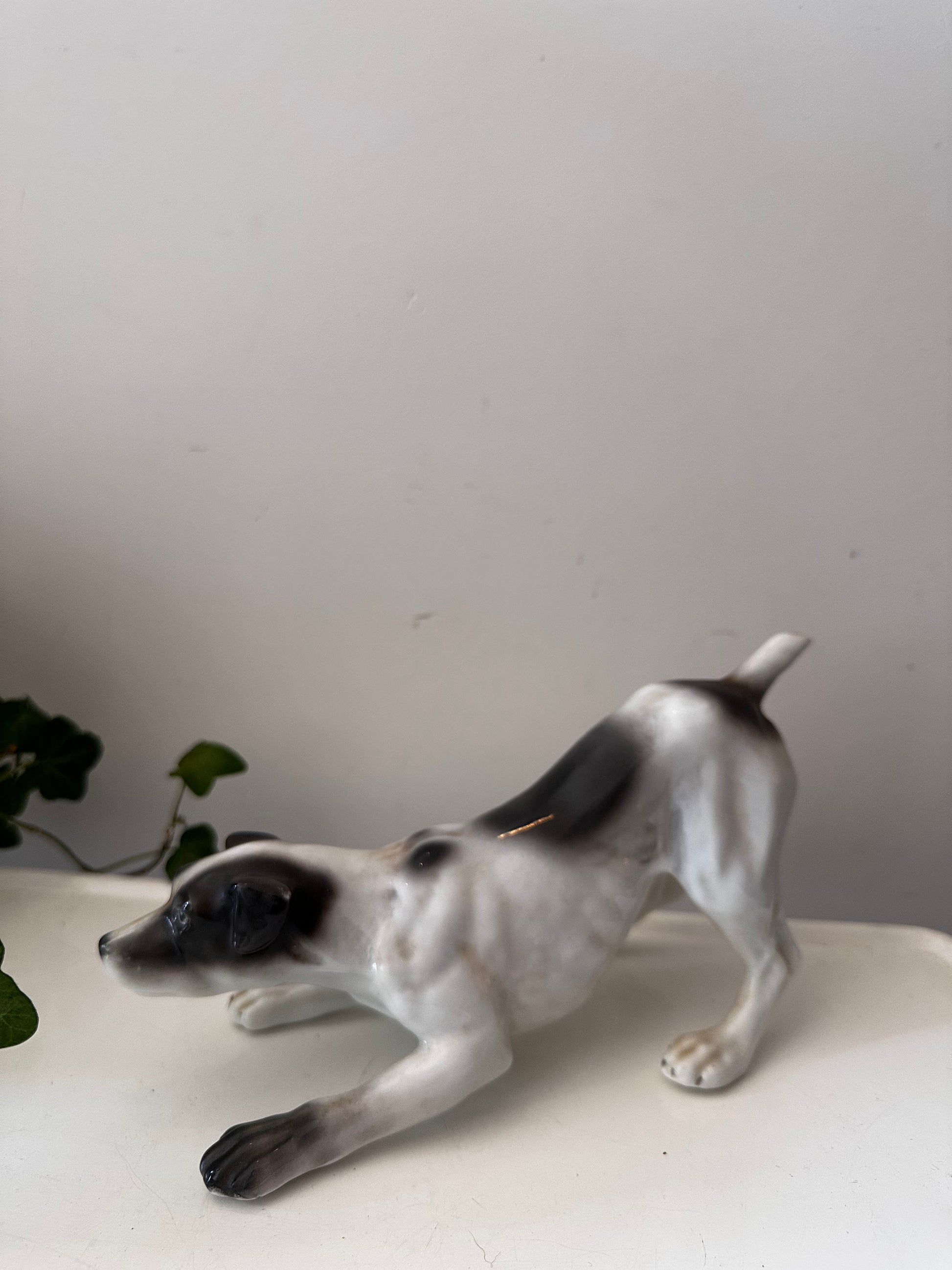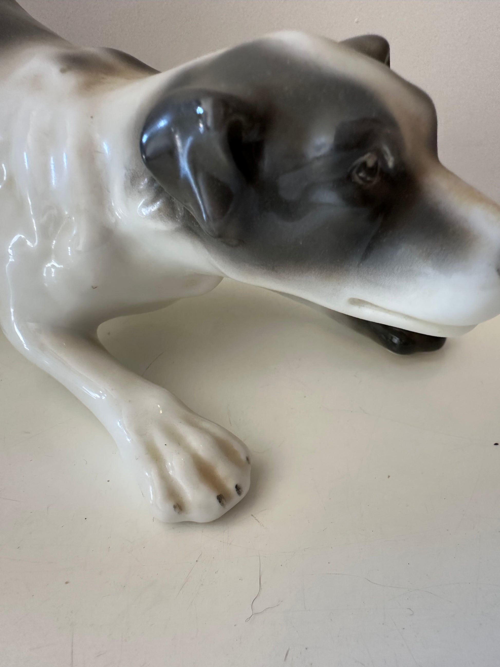 Tof porseleinen beeldje van een speurende hond in lage houding. Mooi afgewerkt in zachte grijstinten met een glanzend glazuur. In een mooie vintage staat. Op de pootjes onder zitten merkjes maar moeilijk te zien