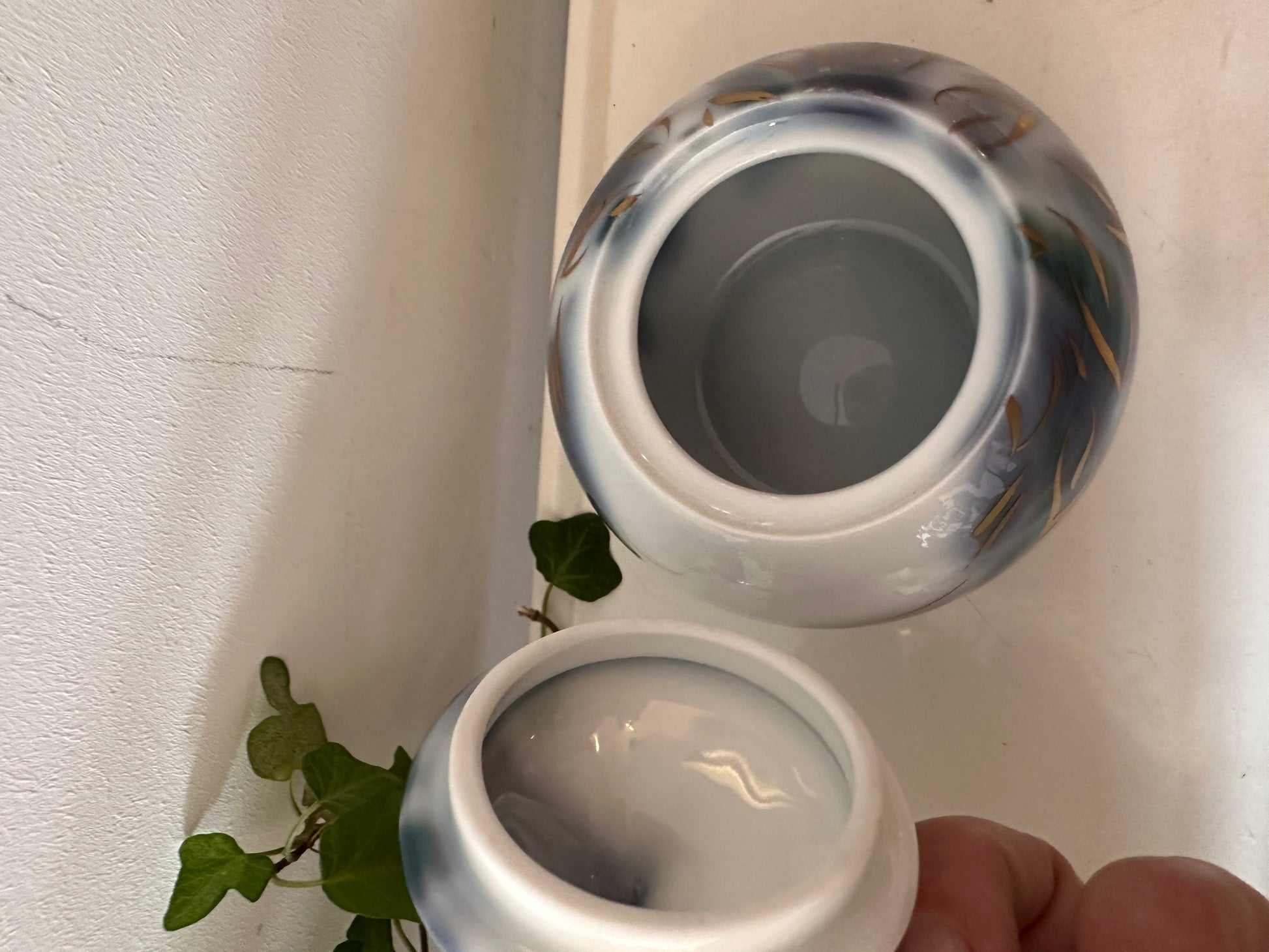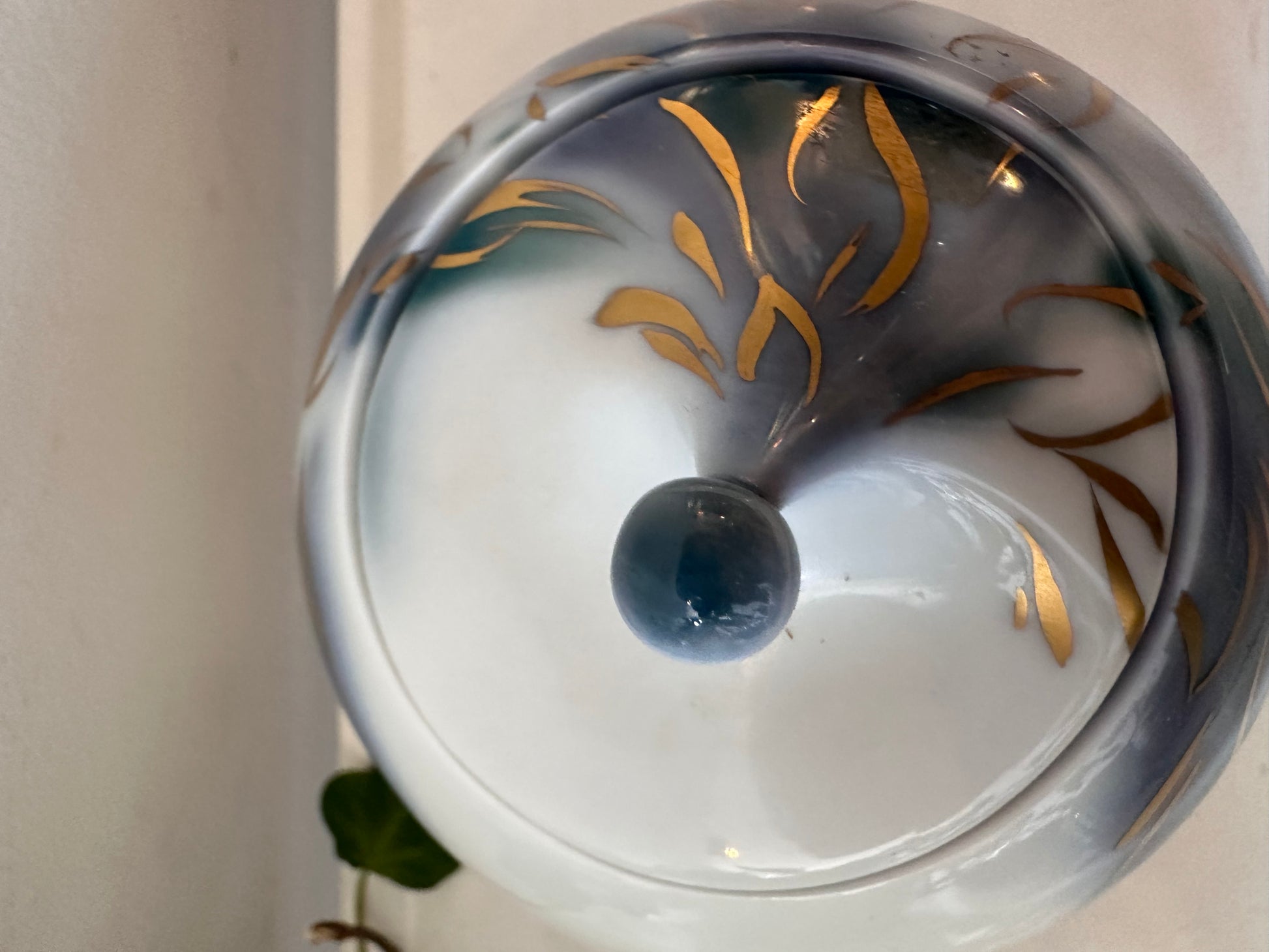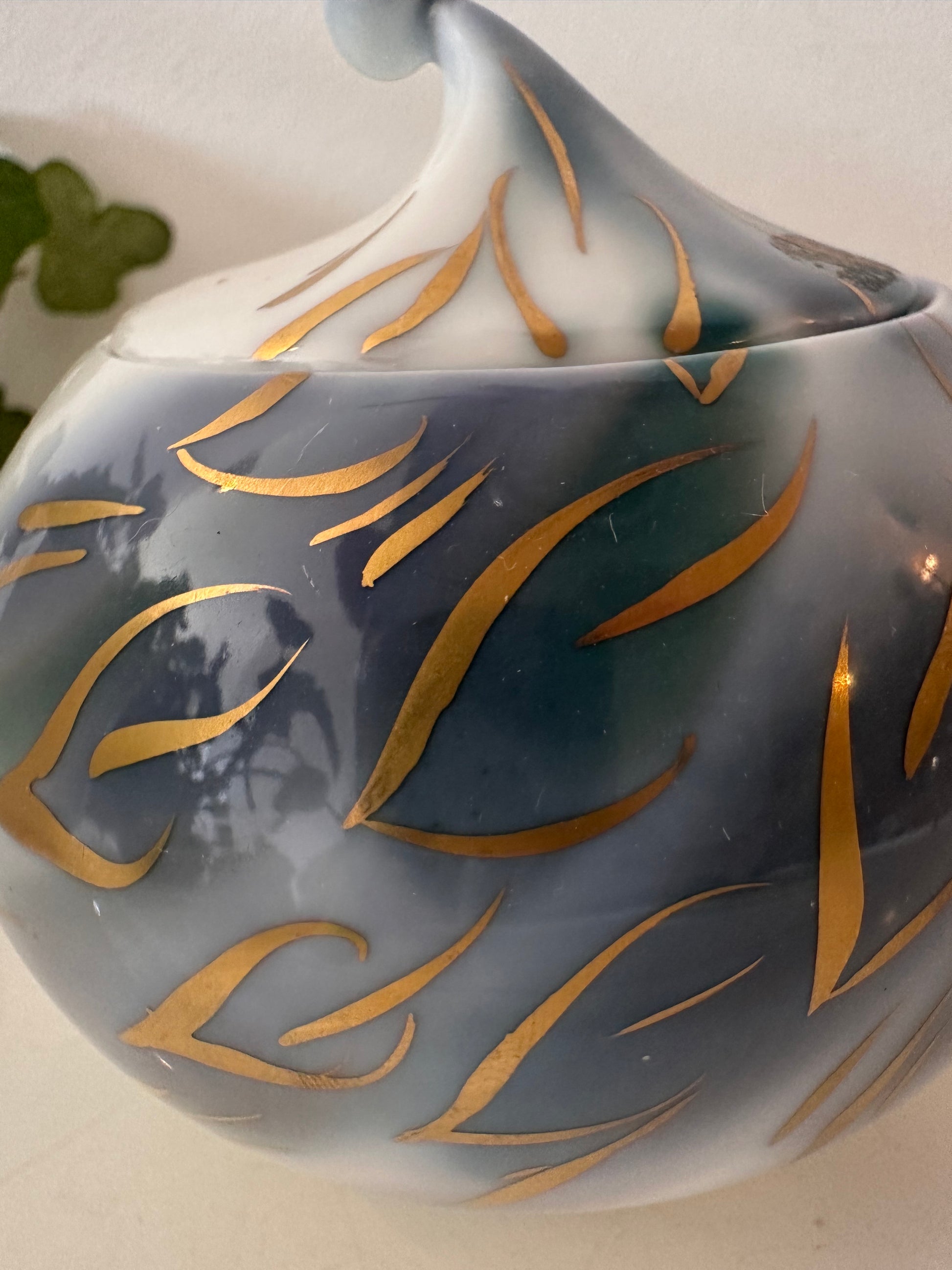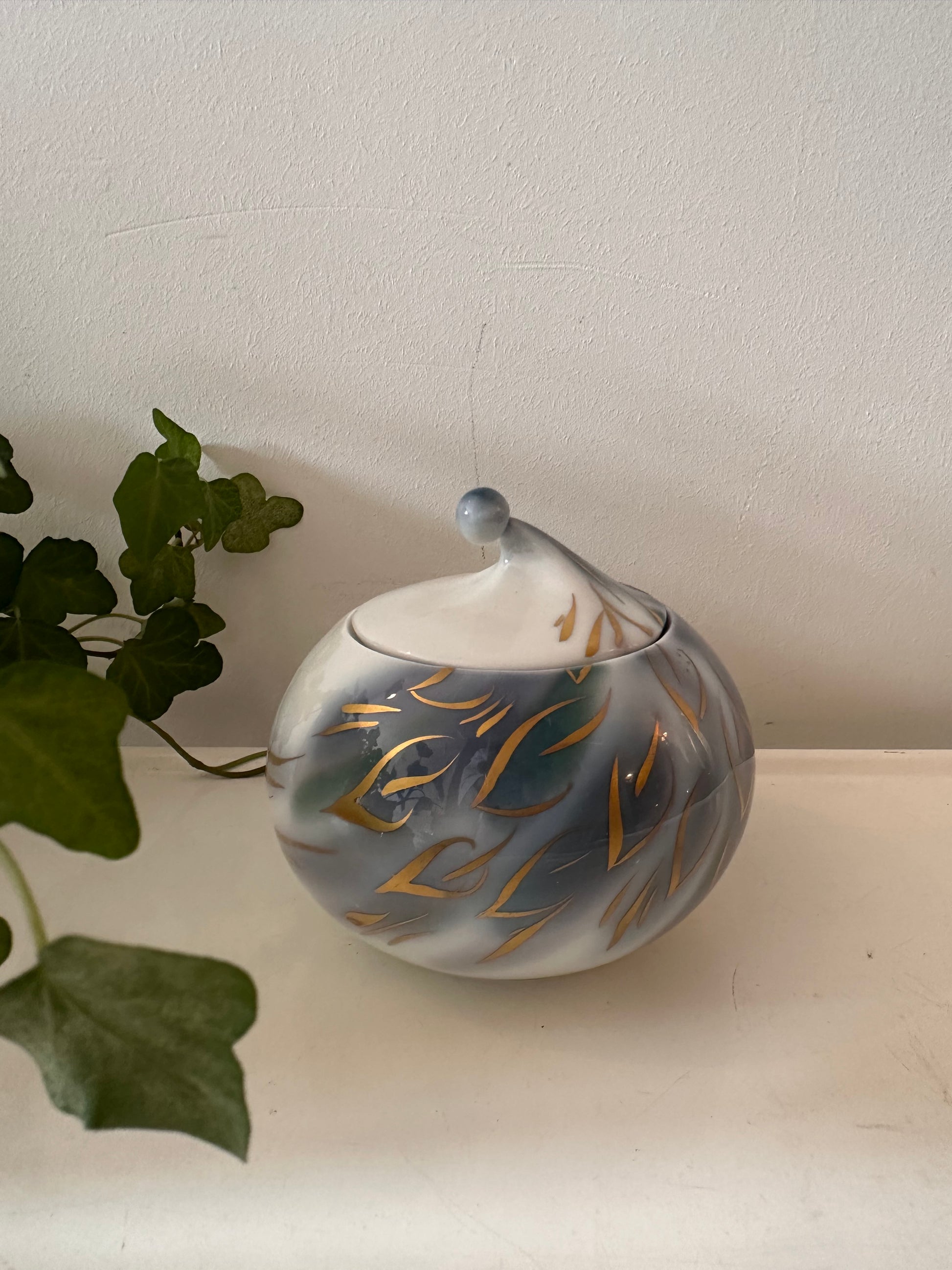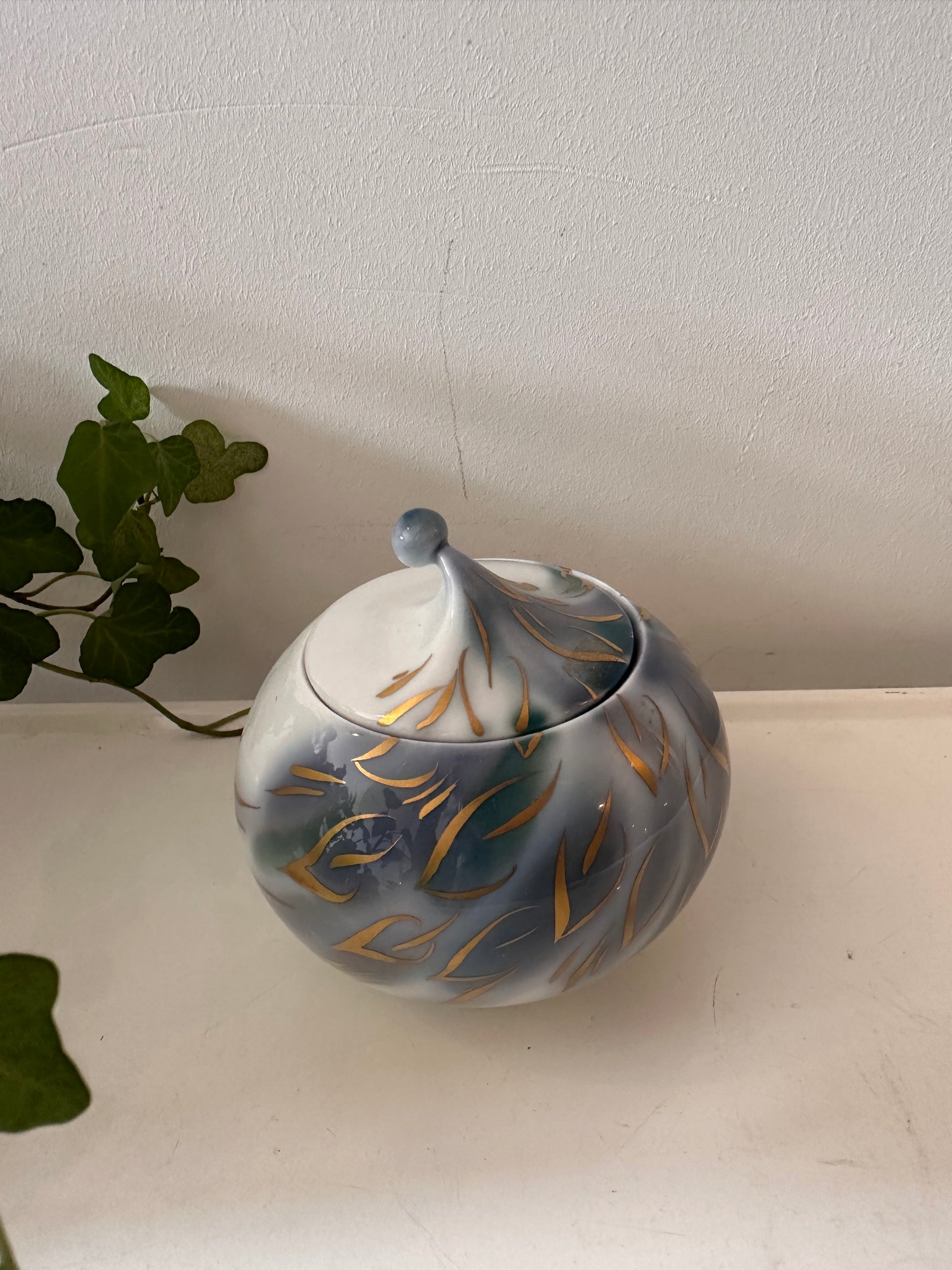 Wat een bijzondere vorm heeft dit potje – een soort zachte druppel met een puntig dopje erop. De ondergrond is wit met blauwgrijze wolken en een vleugje groen, met daar overheen zwierige gouden accenten. Gemaakt door Hutschenreuther (West Germany), dus goede kwaliteit porselein. Leuk als sier of juist om iets in te bewaren. Q201