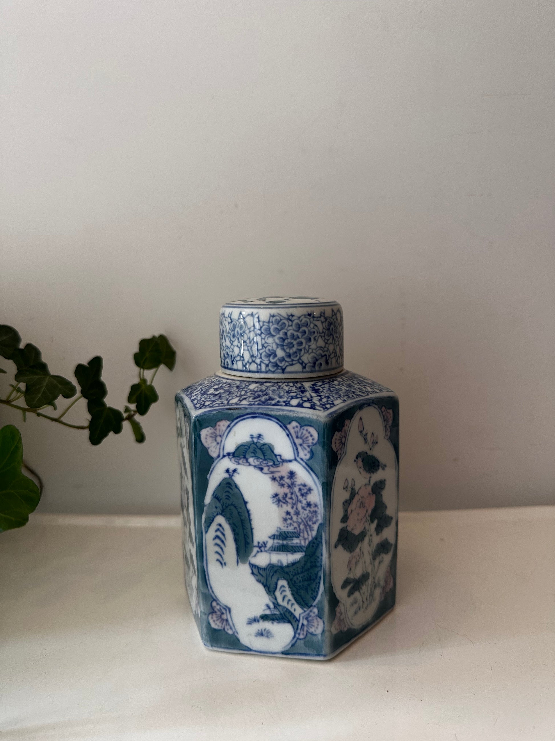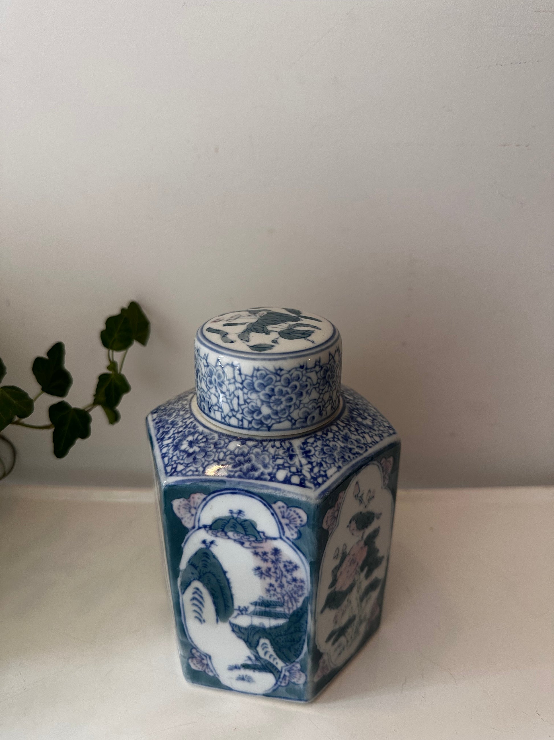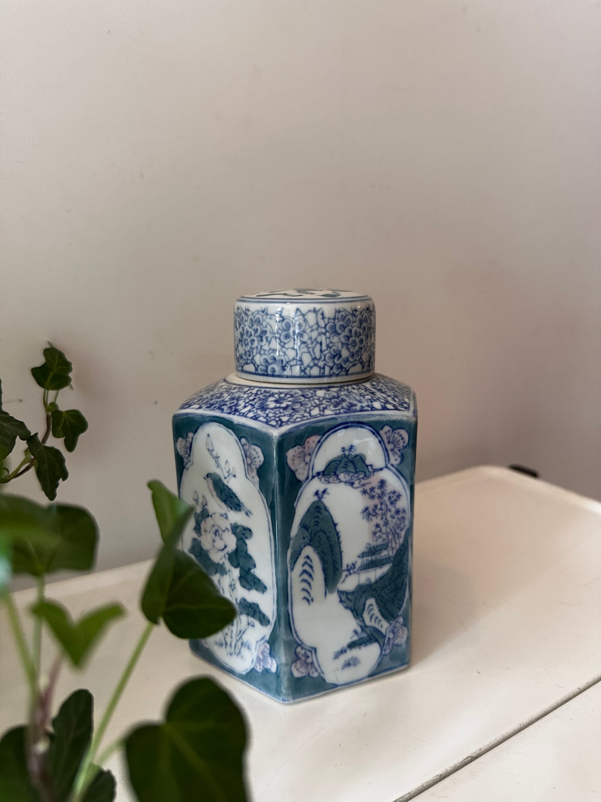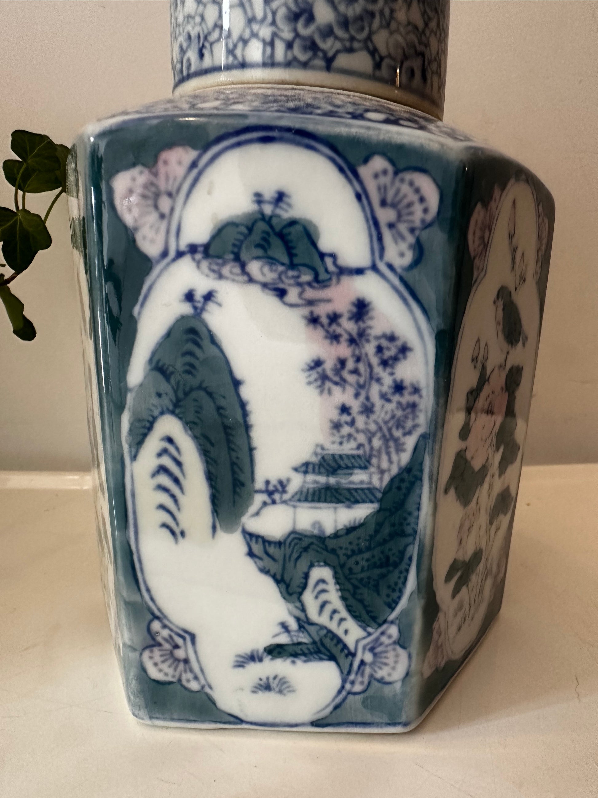 Prachtig zeshoekig busje met traditionele blauw-witte decoratie. Gedetailleerde landschappen en bloemenmotieven geven die leuke Oosterse uitstraling.
