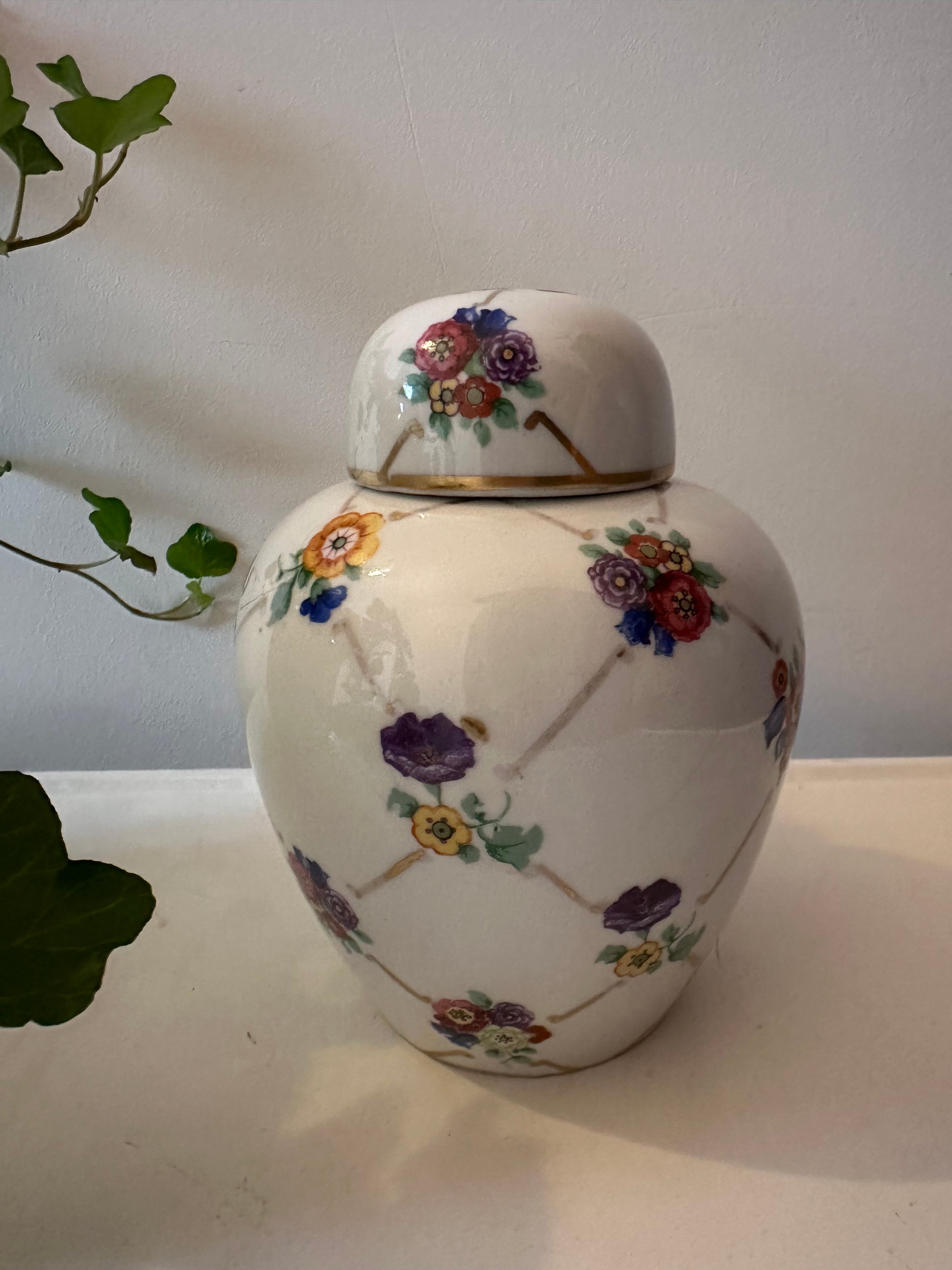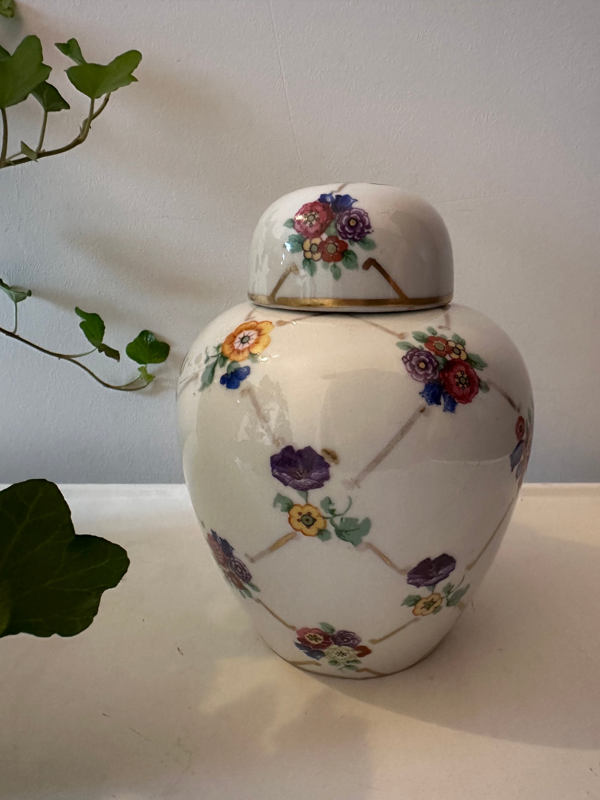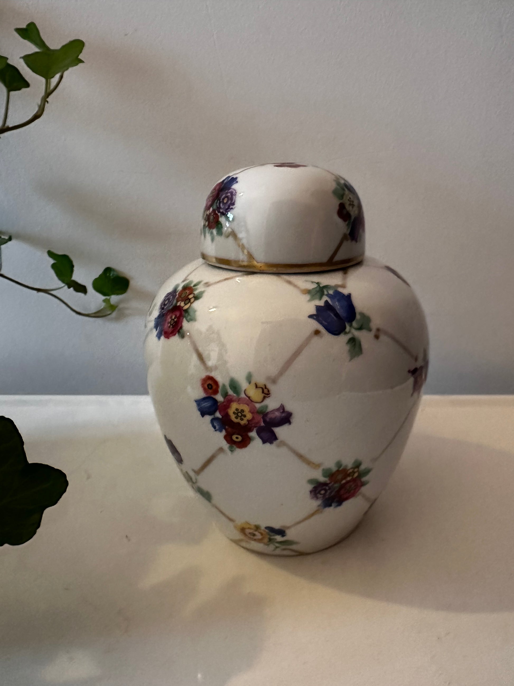 Een beauty van een dekselvaasje. Dit porseleinen vaasje is in een mooie vintage staat. Heeft romantische bloemetjes als decoratie met een goudkleurig streepje als afwerking