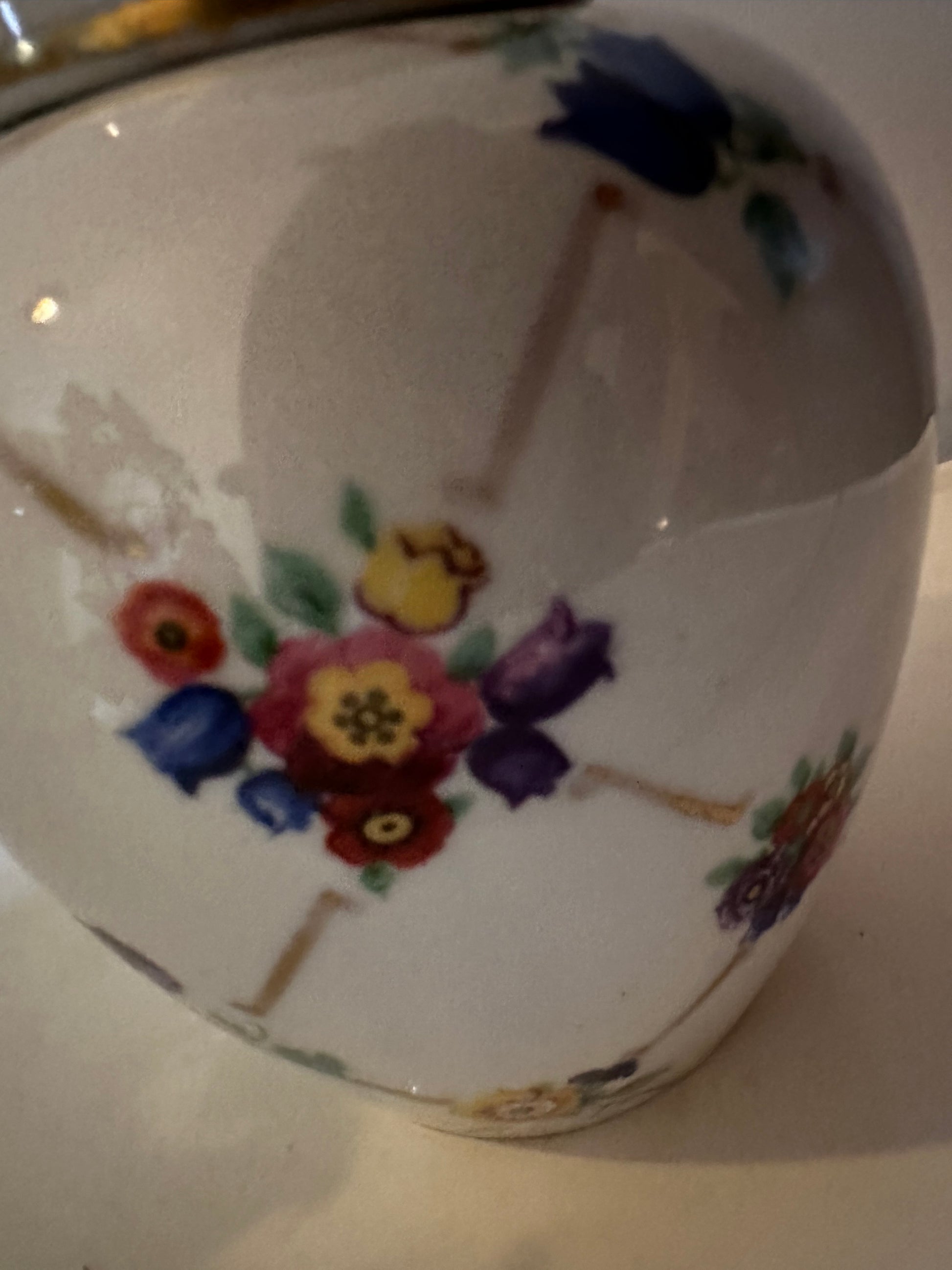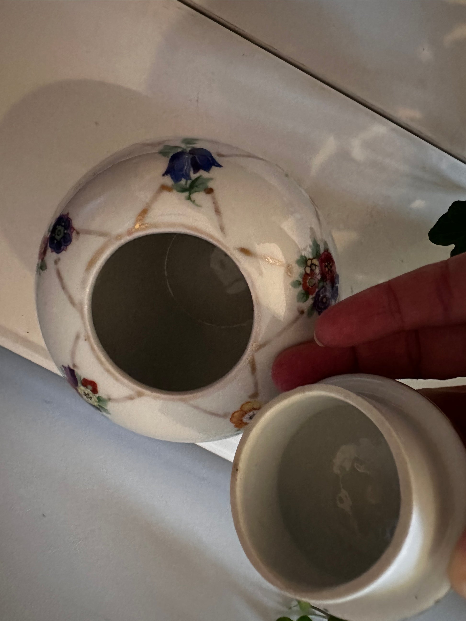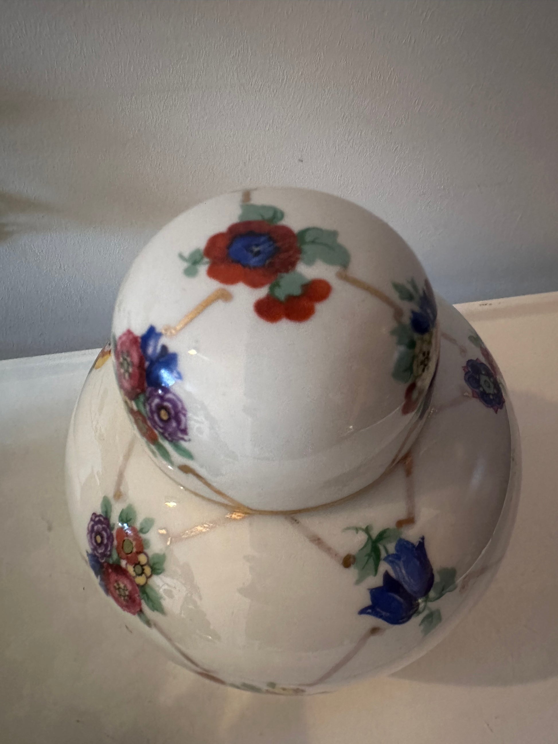 Een beauty van een dekselvaasje. Dit porseleinen vaasje is in een mooie vintage staat. Heeft romantische bloemetjes als decoratie met een goudkleurig streepje als afwerking
