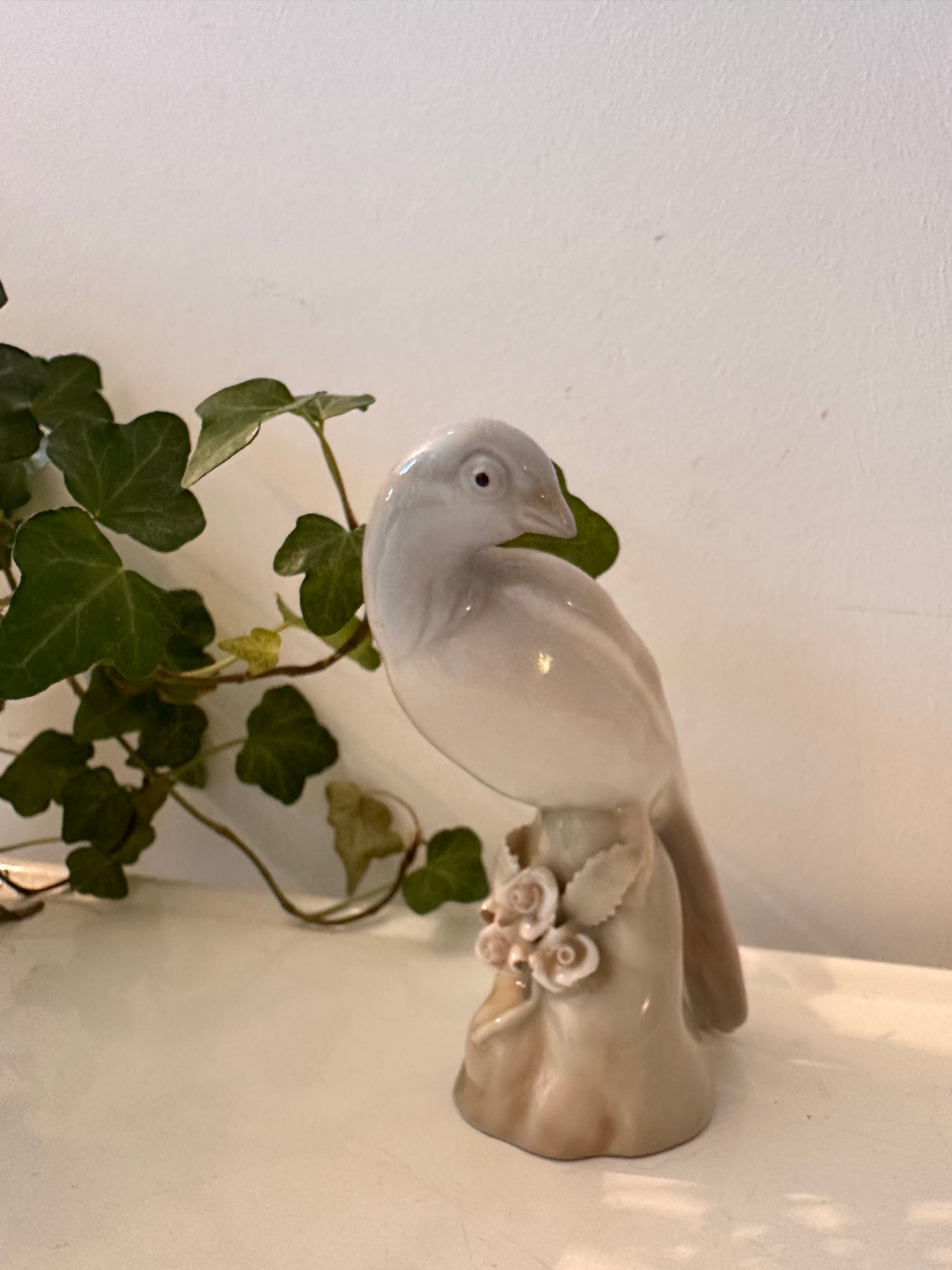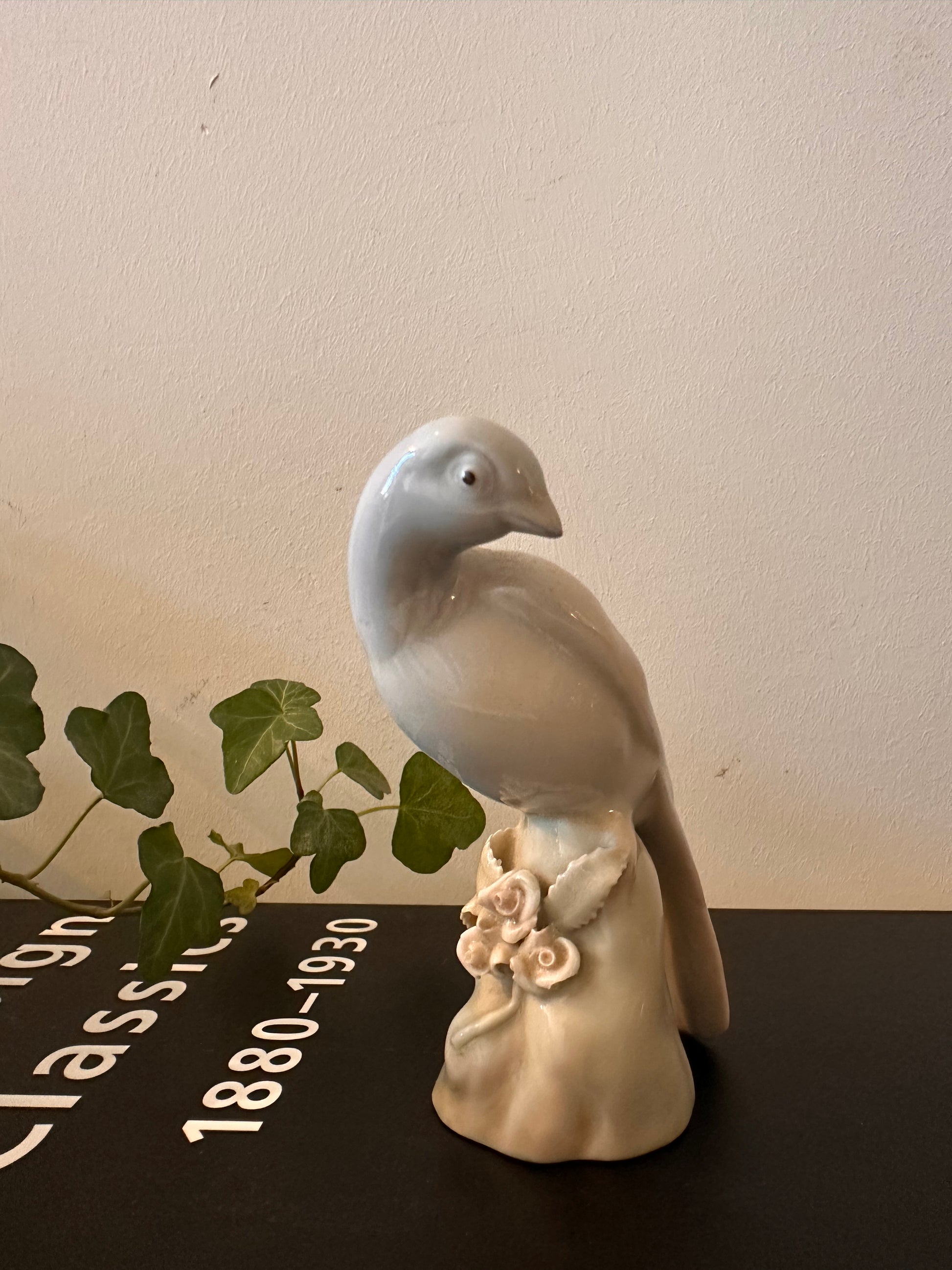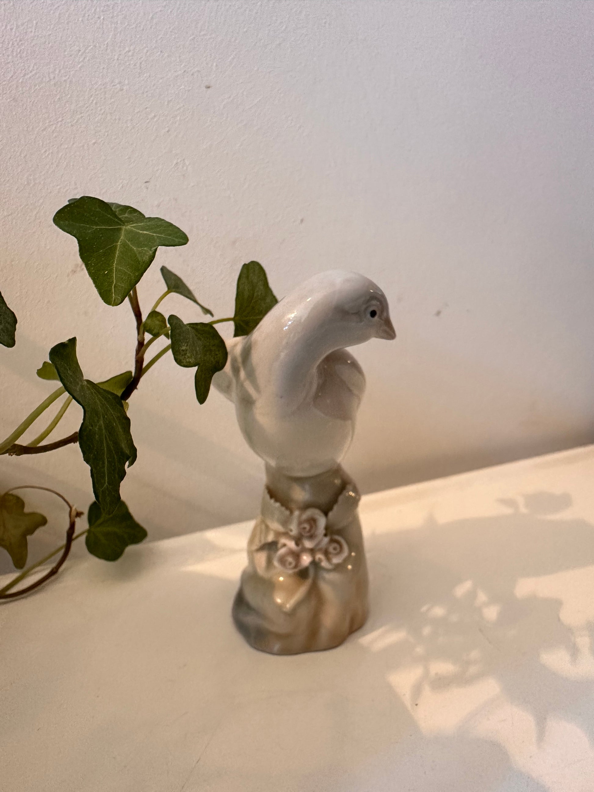 Lief wit porseleinen beeldje van een duif op een voet met roosjes. Mooi glanzend geglazuurd en subtiel van kleur, met een elegante houding. Gemaakt in Spanje, gemerkt aan de onderzijde. In een mooie vintage staat.