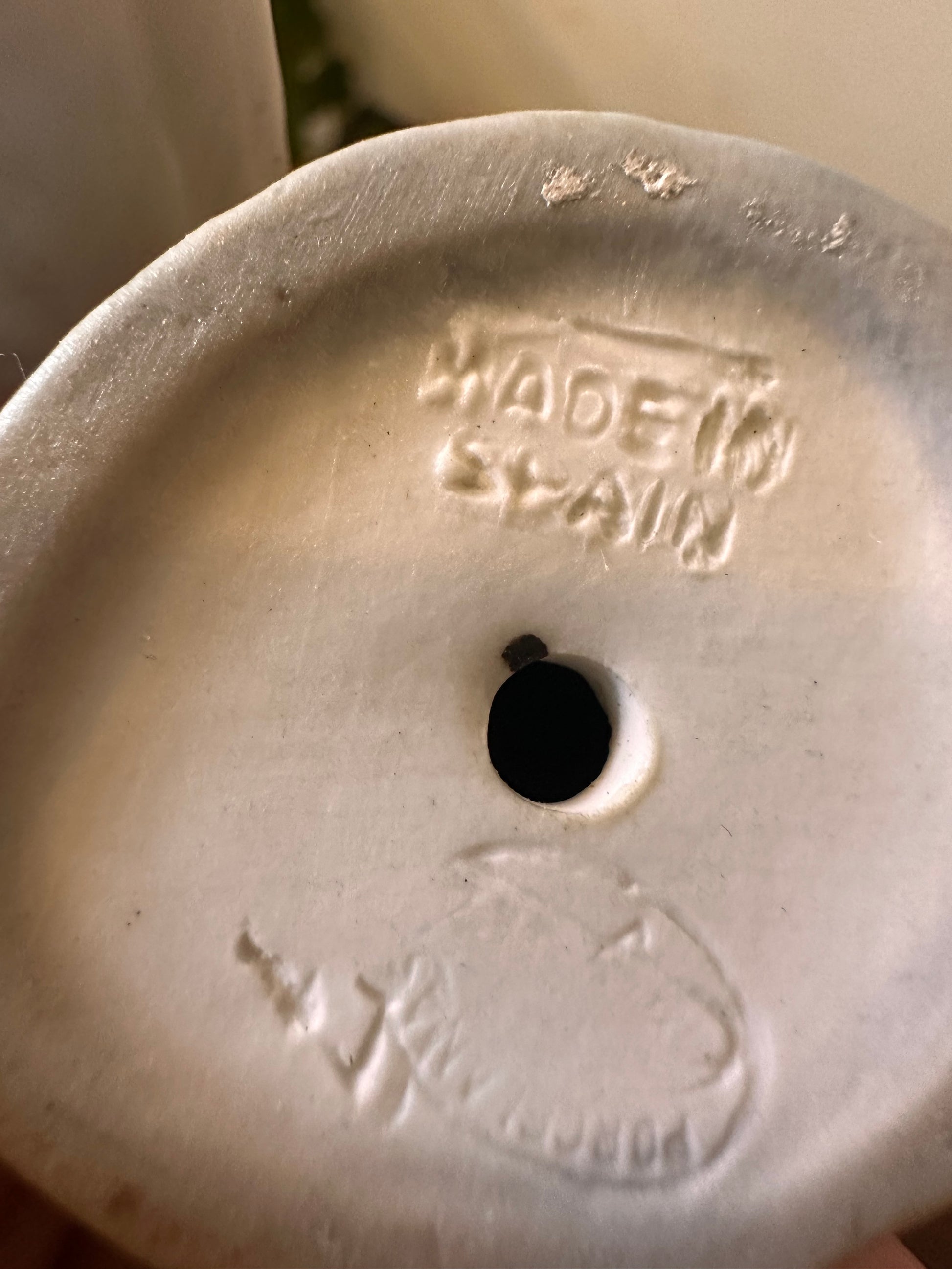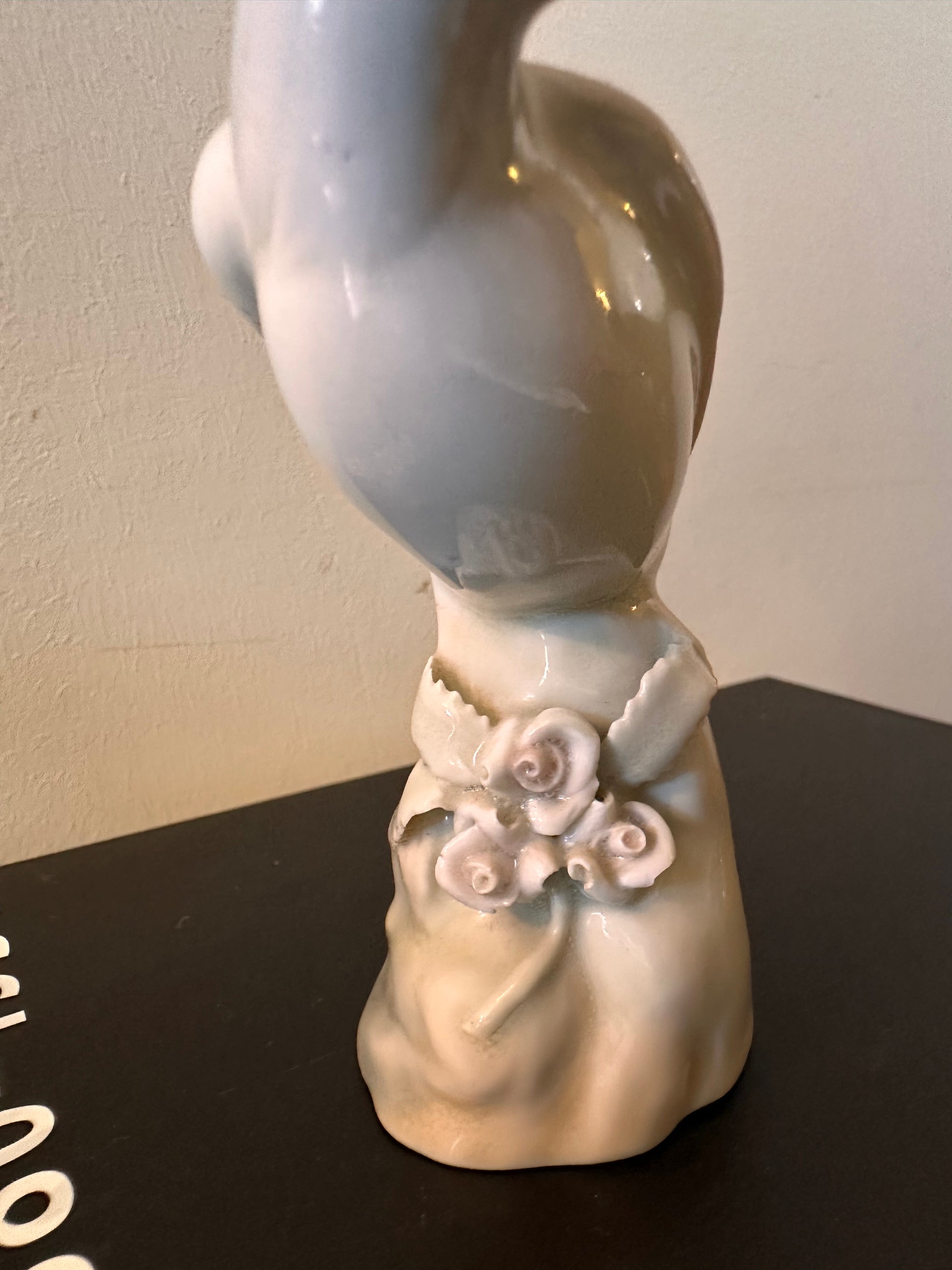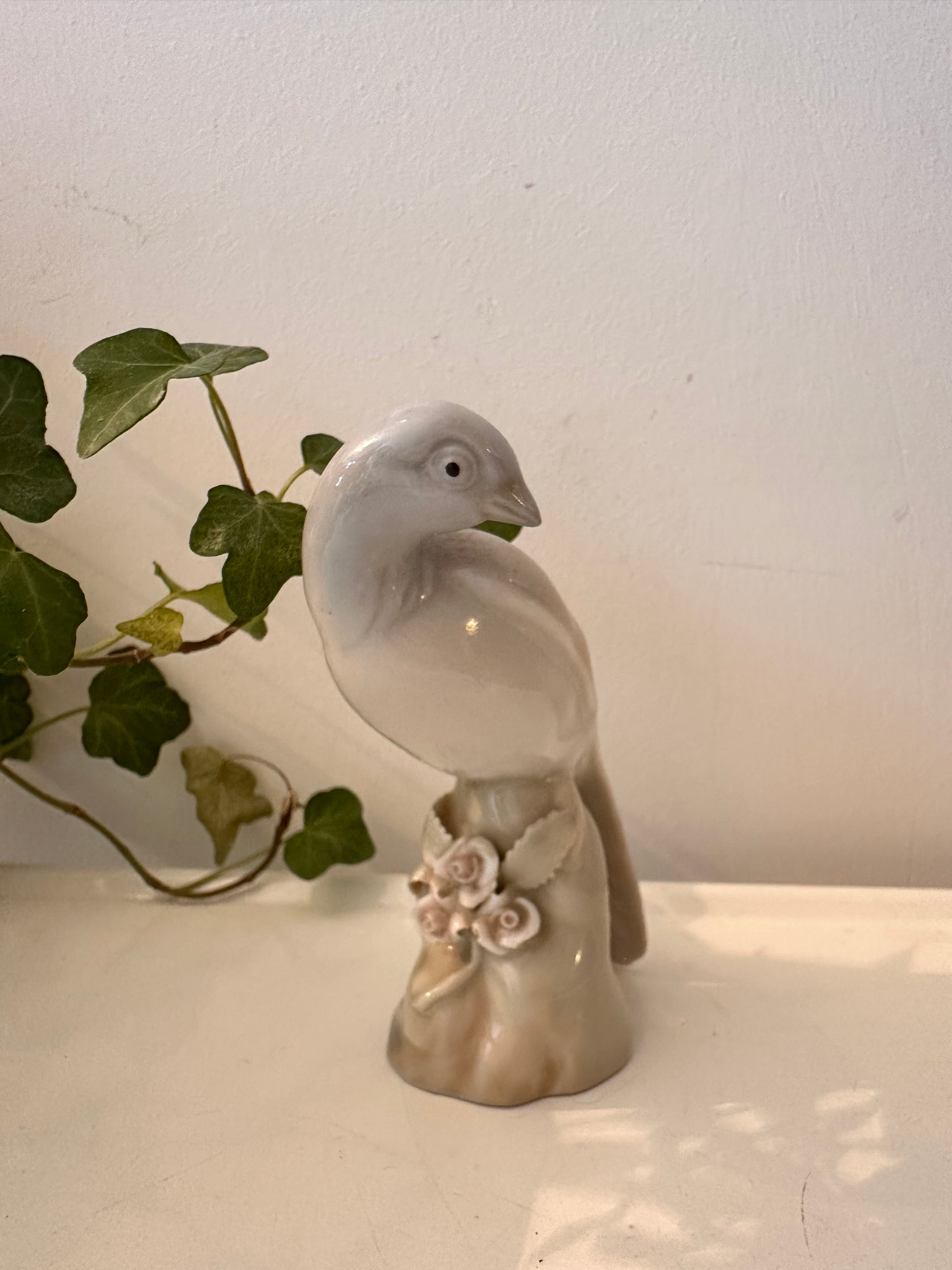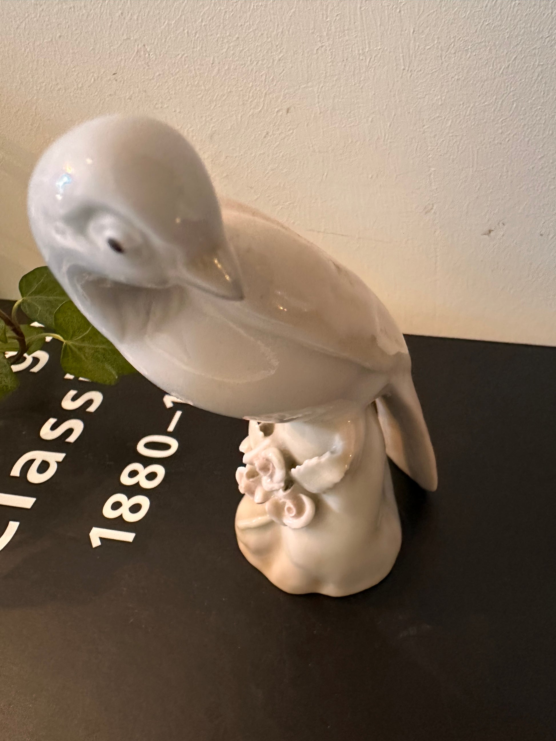 Lief wit porseleinen beeldje van een duif op een voet met roosjes. Mooi glanzend geglazuurd en subtiel van kleur, met een elegante houding. Gemaakt in Spanje, gemerkt aan de onderzijde. In een mooie vintage staat.