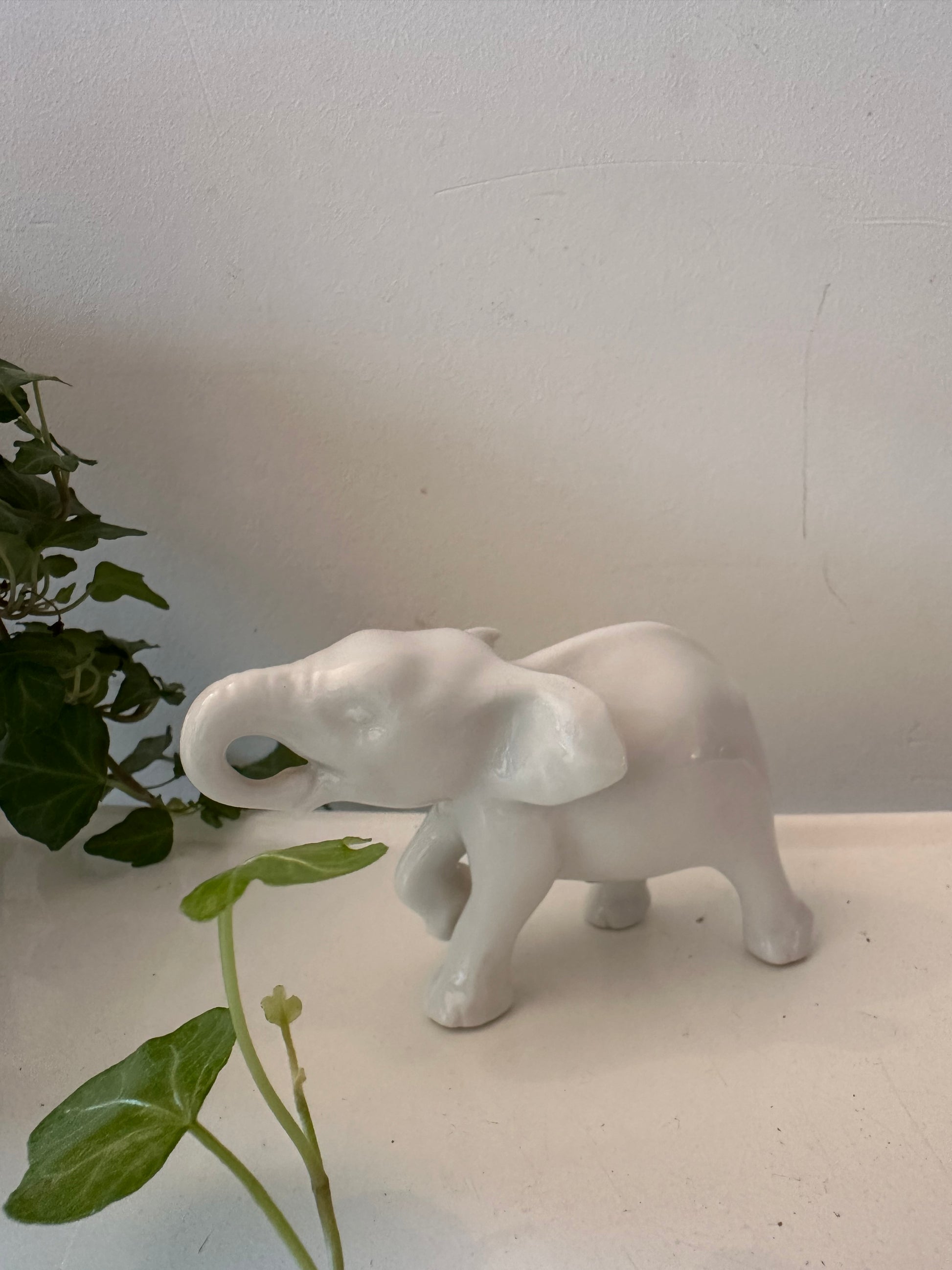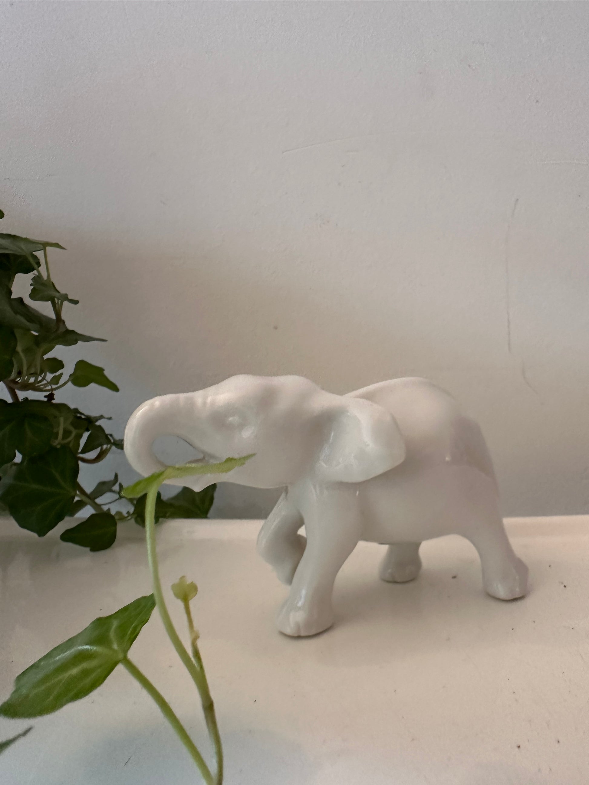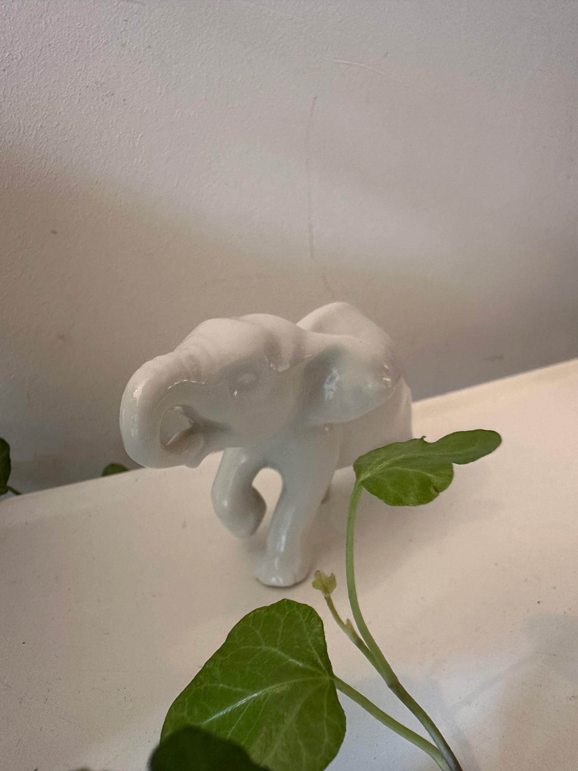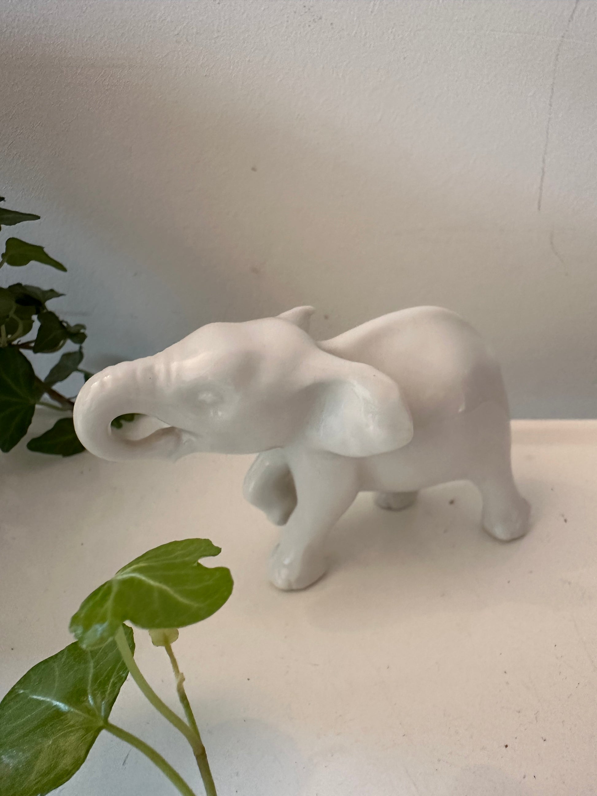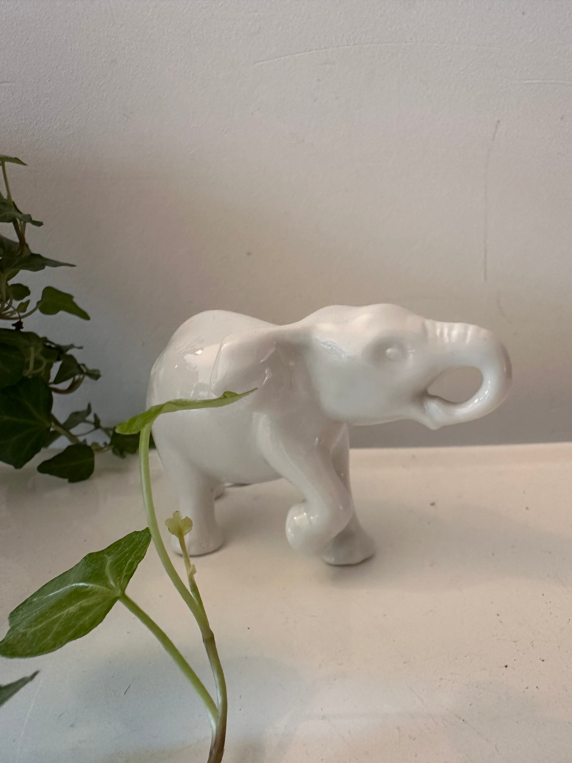 Superleuk wit olifantje van porselein — subtiel glanzend met een sierlijke houding en omhooggerichte slurf (gelukssymbool 💫). Mooi als klein detail op een plankje of bij een verzameling wit keramiek. Q549