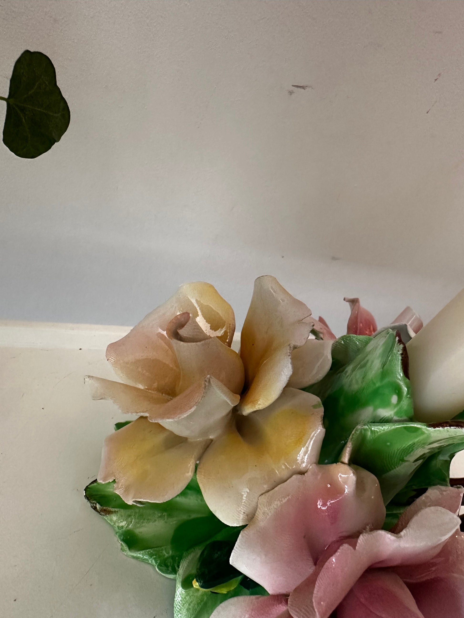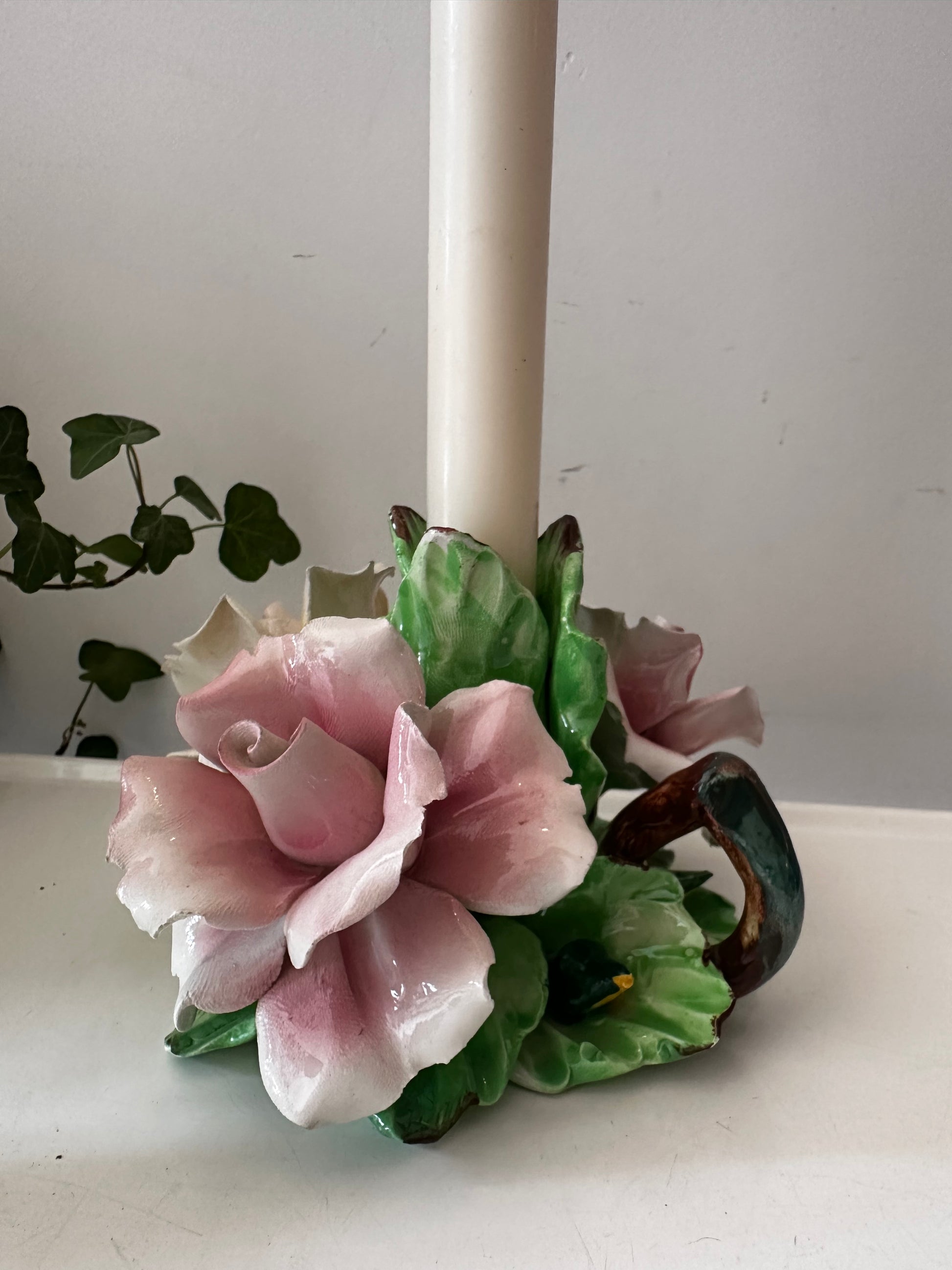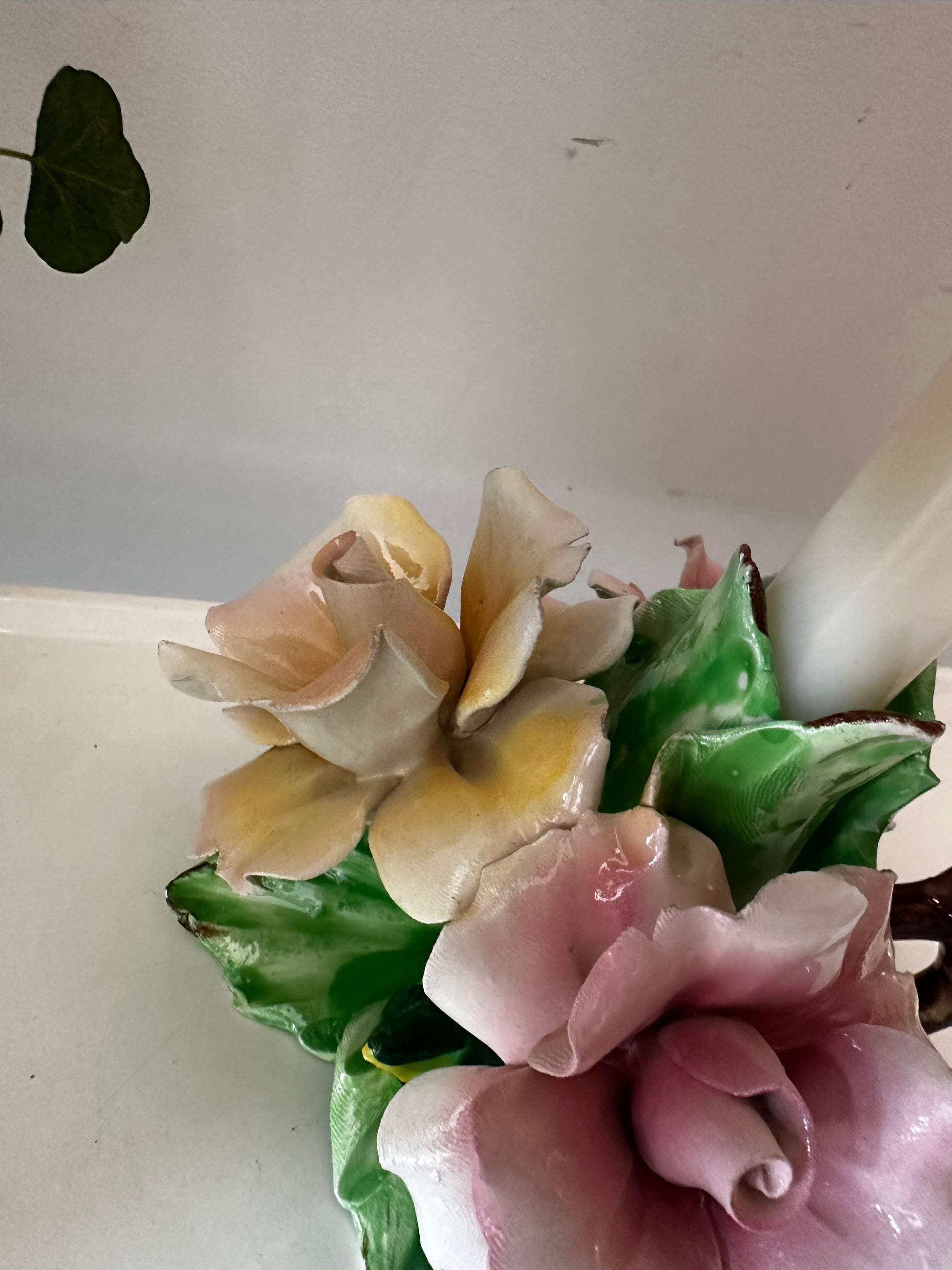 Prachtige porseleinen kandelaar vol sierlijke bloemen in zachte tinten roze, crème en geel. Gemaakt in de stijl van Capodimonte, met veel detail en glans in het blad- en bloemdecor. In een mooie vintage staat en geschikt voor een smalle dinerkaars.