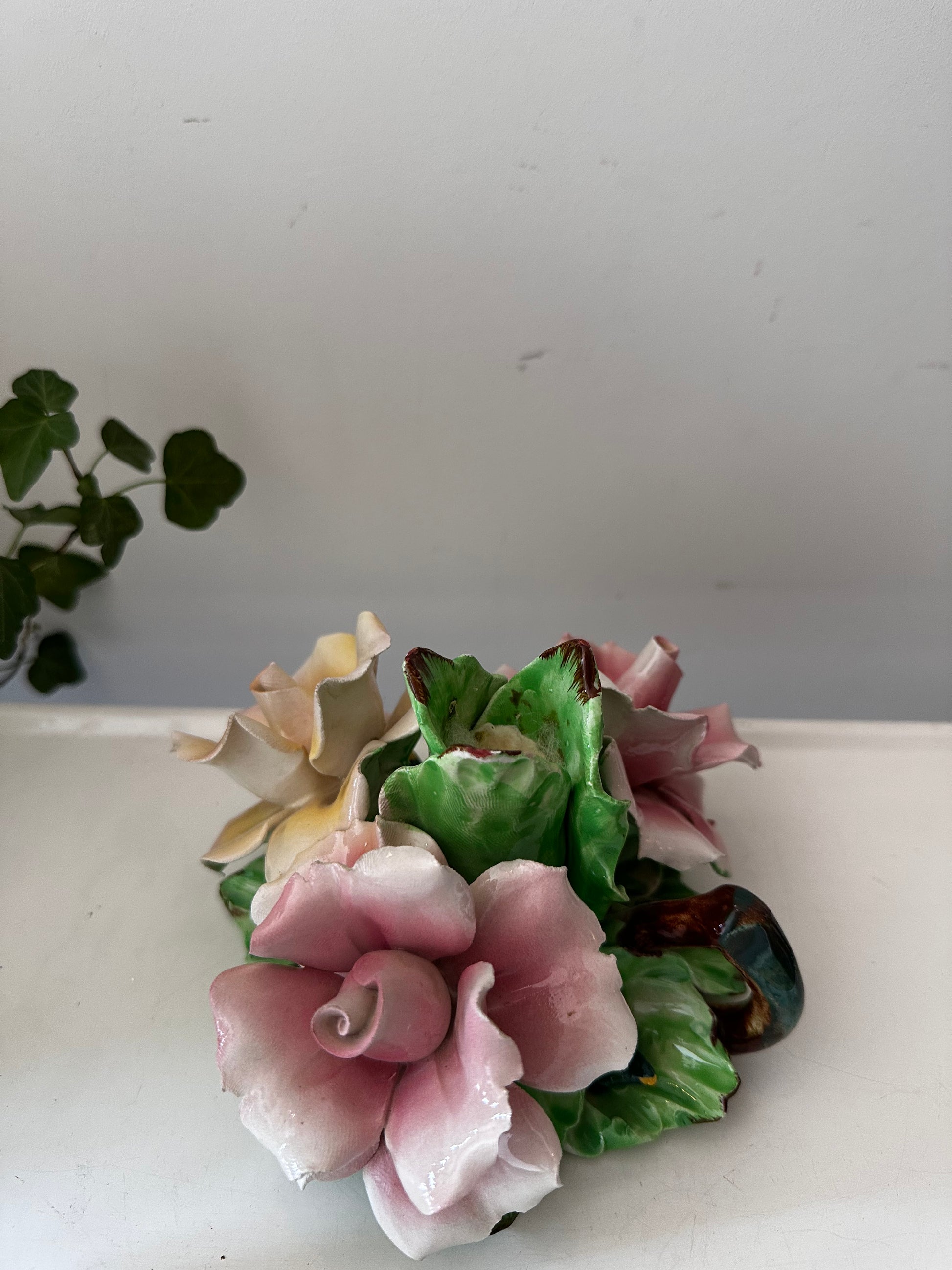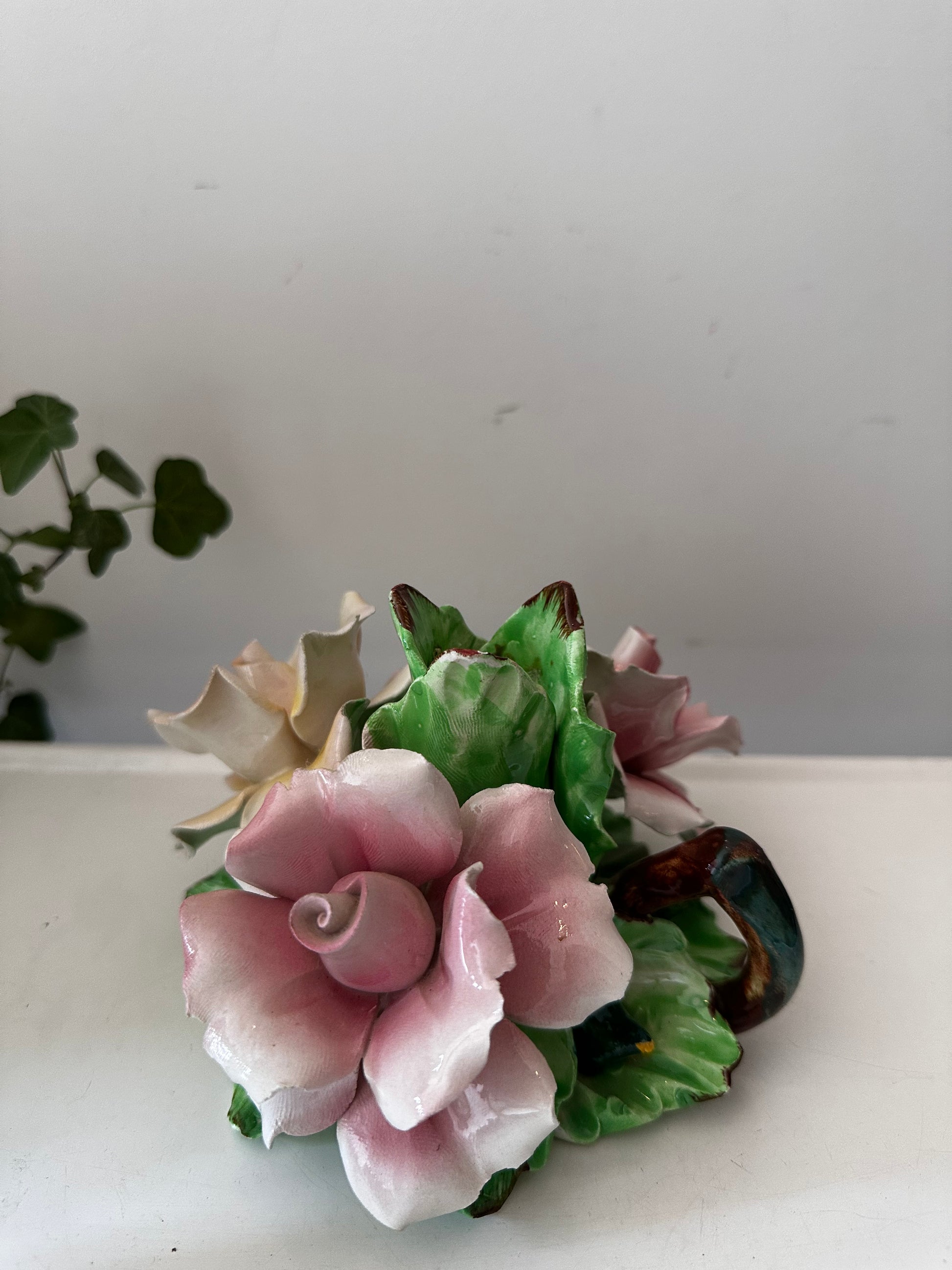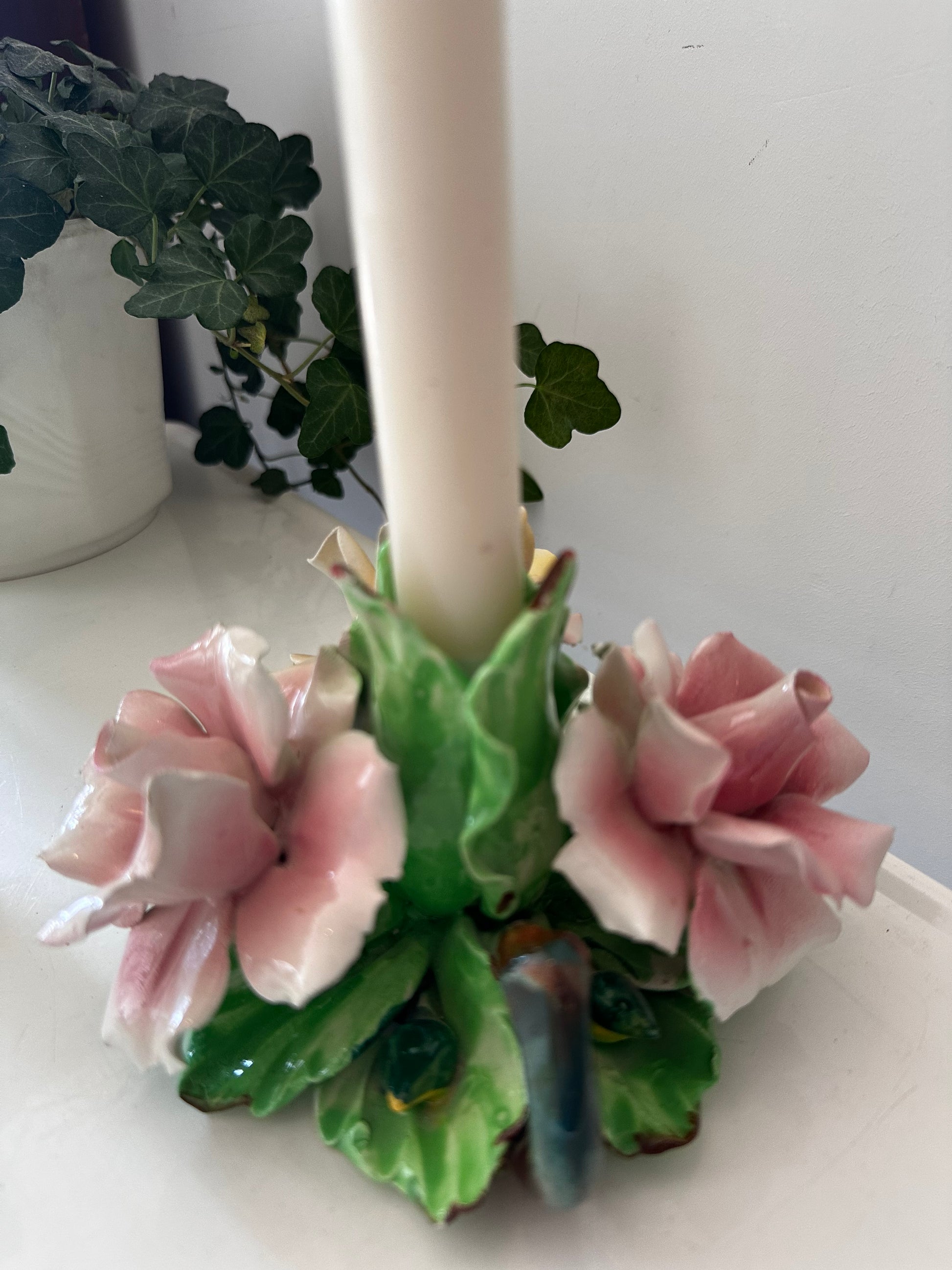 Prachtige porseleinen kandelaar vol sierlijke bloemen in zachte tinten roze, crème en geel. Gemaakt in de stijl van Capodimonte, met veel detail en glans in het blad- en bloemdecor. In een mooie vintage staat en geschikt voor een smalle dinerkaars.