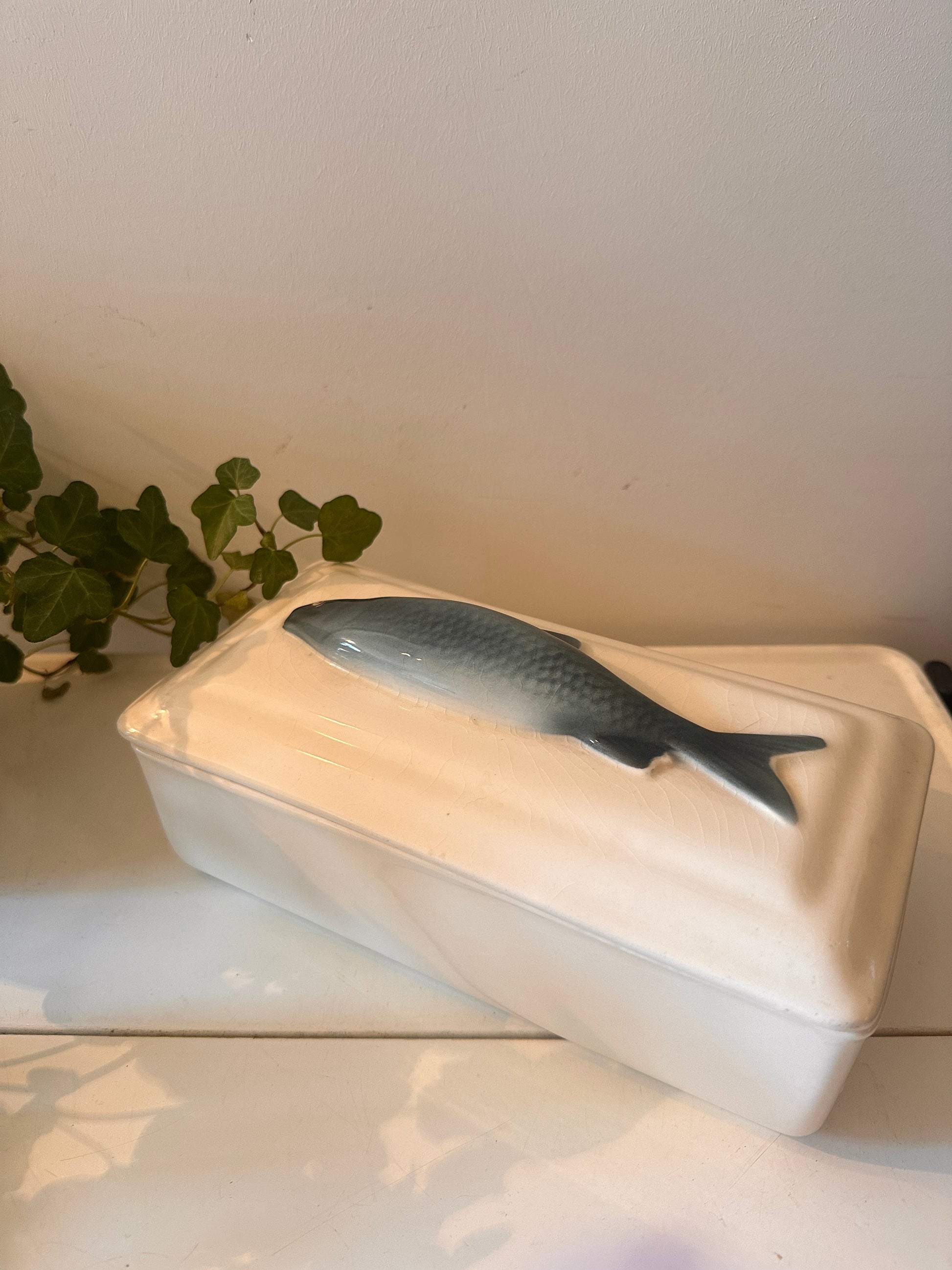 Porseleinen terrine met vis op de deksel