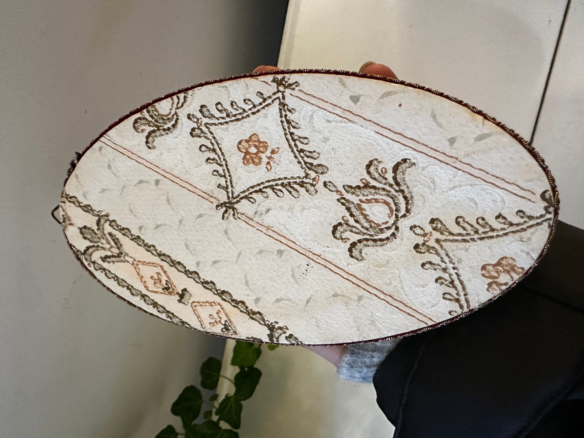 Ovaal wandpaneel bekleed met bordeauxrood fluweel, met daarop een handgemaakte bloemencompositie van keramiek in zachte tinten. Mooi klein formaat. Q729