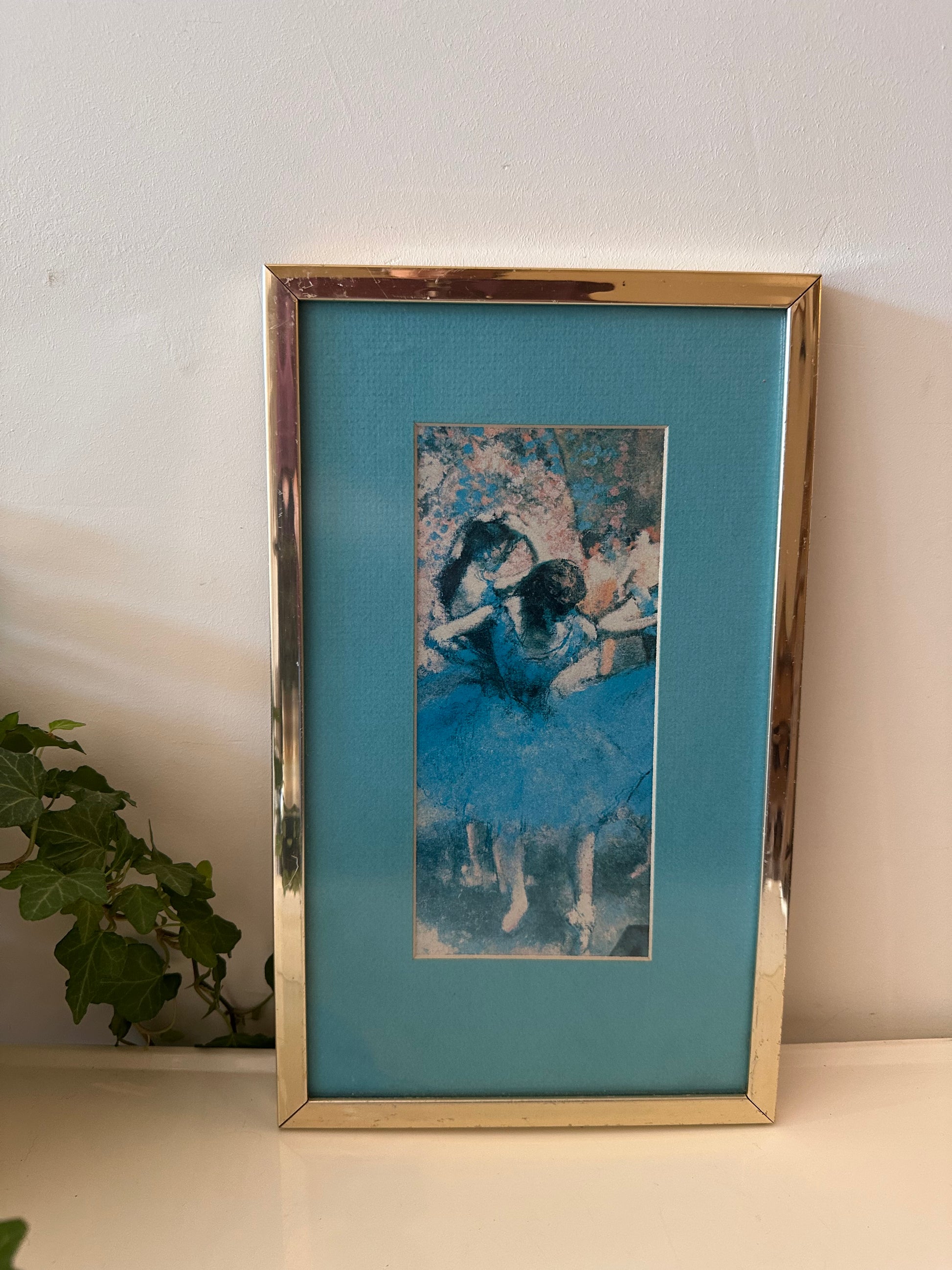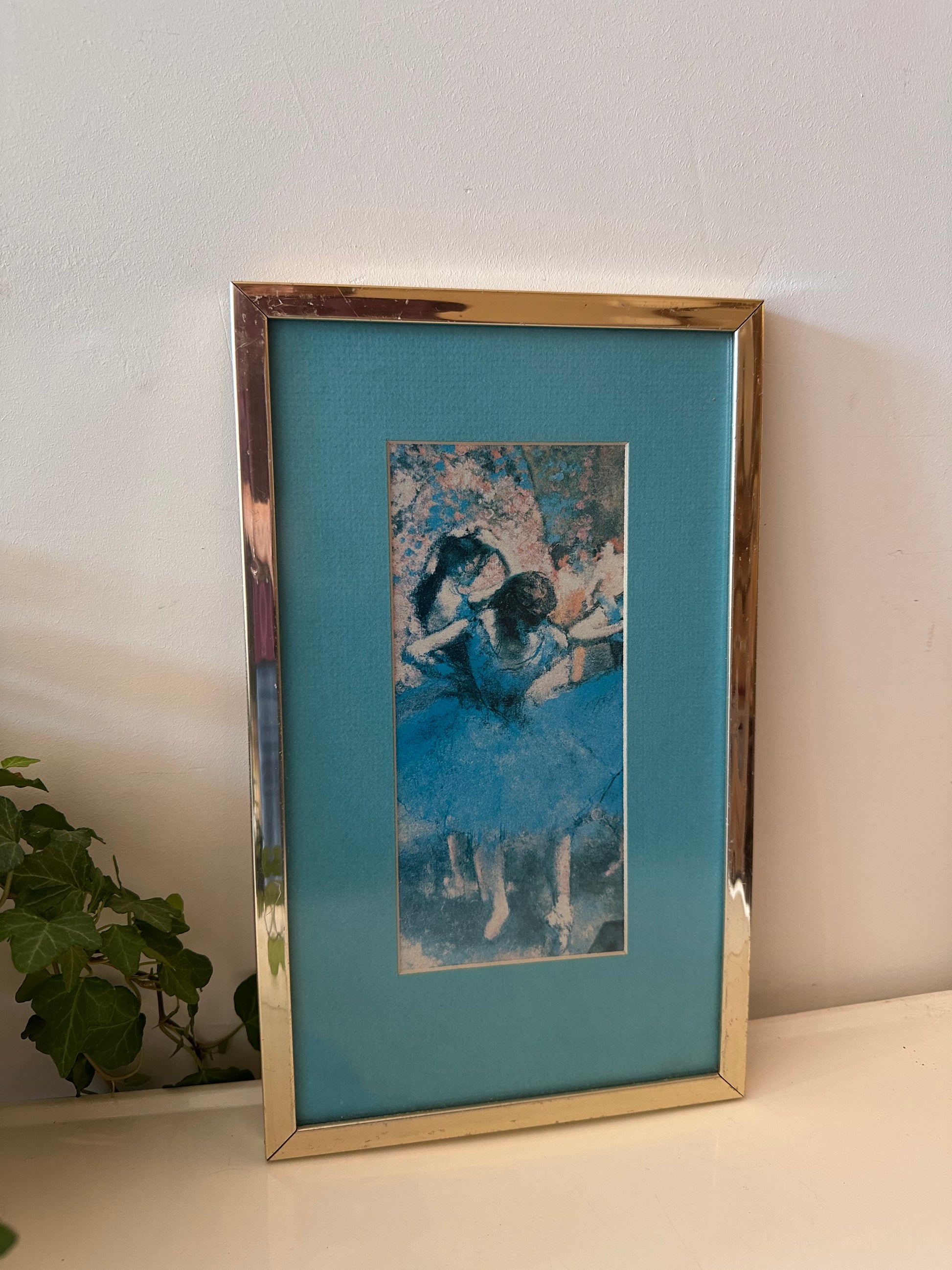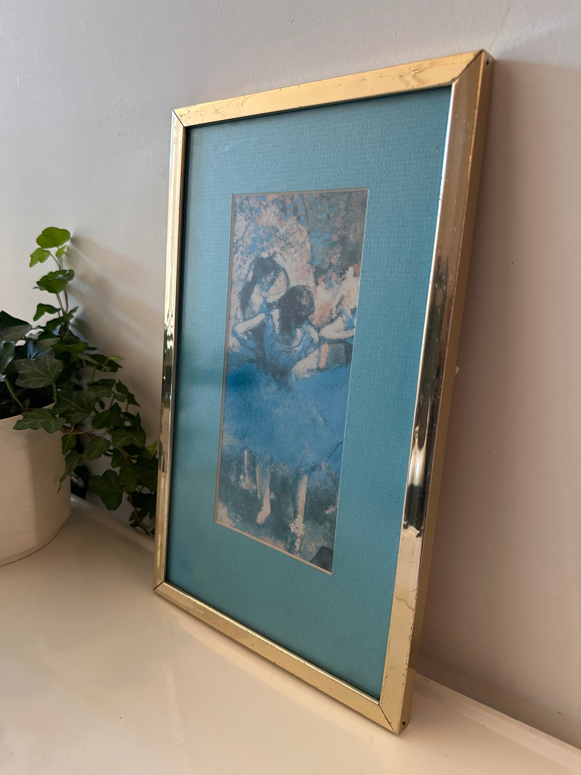 Charmant kunstwerkje met een reproductie naar Edgar Degas, bekend om zijn impressionistische schilderijen van ballerina’s. Dit werk in blauwtinten is ingelijst met een glimmende metalen rand en passe-partout in dezelfde kleur.