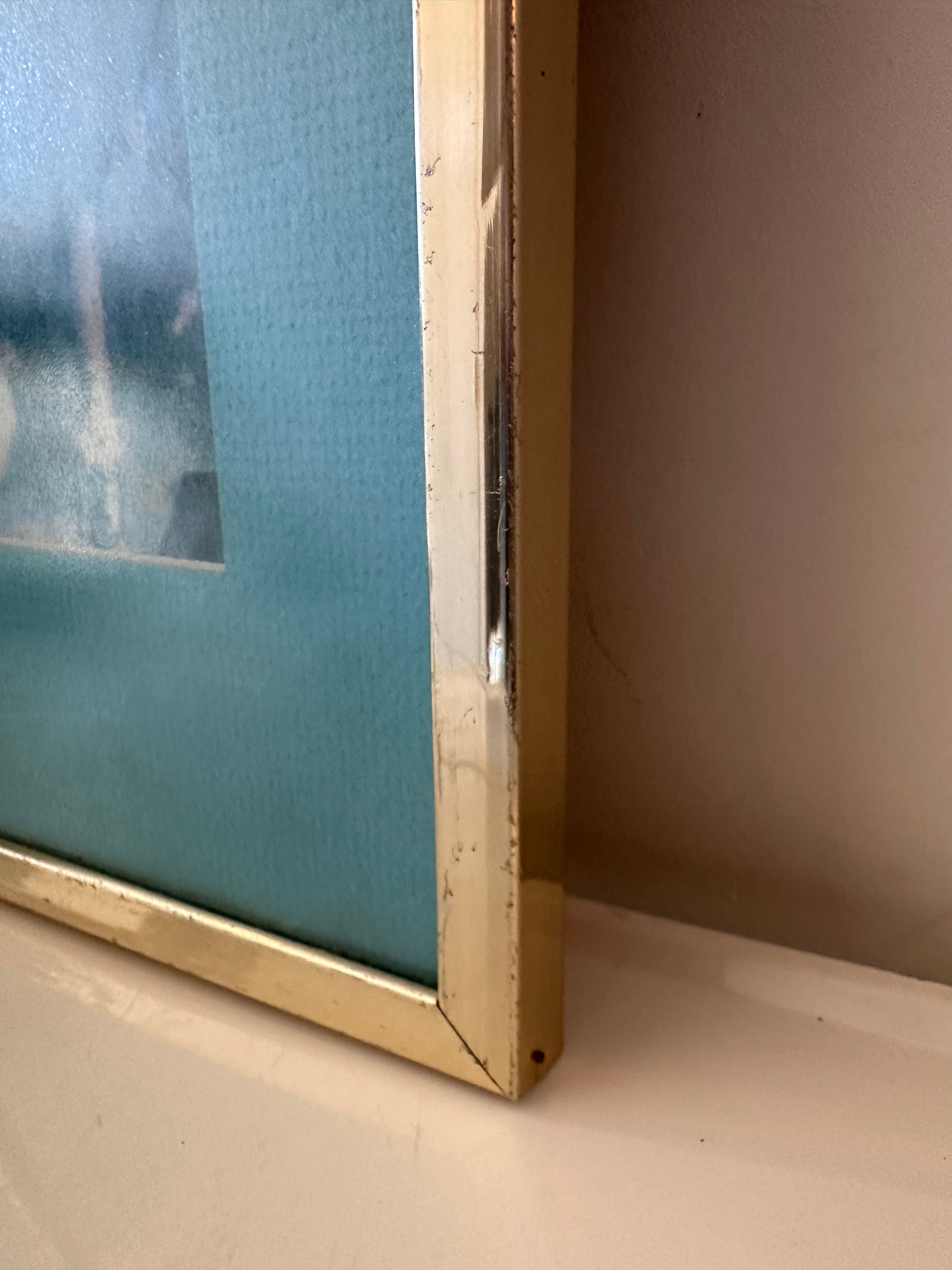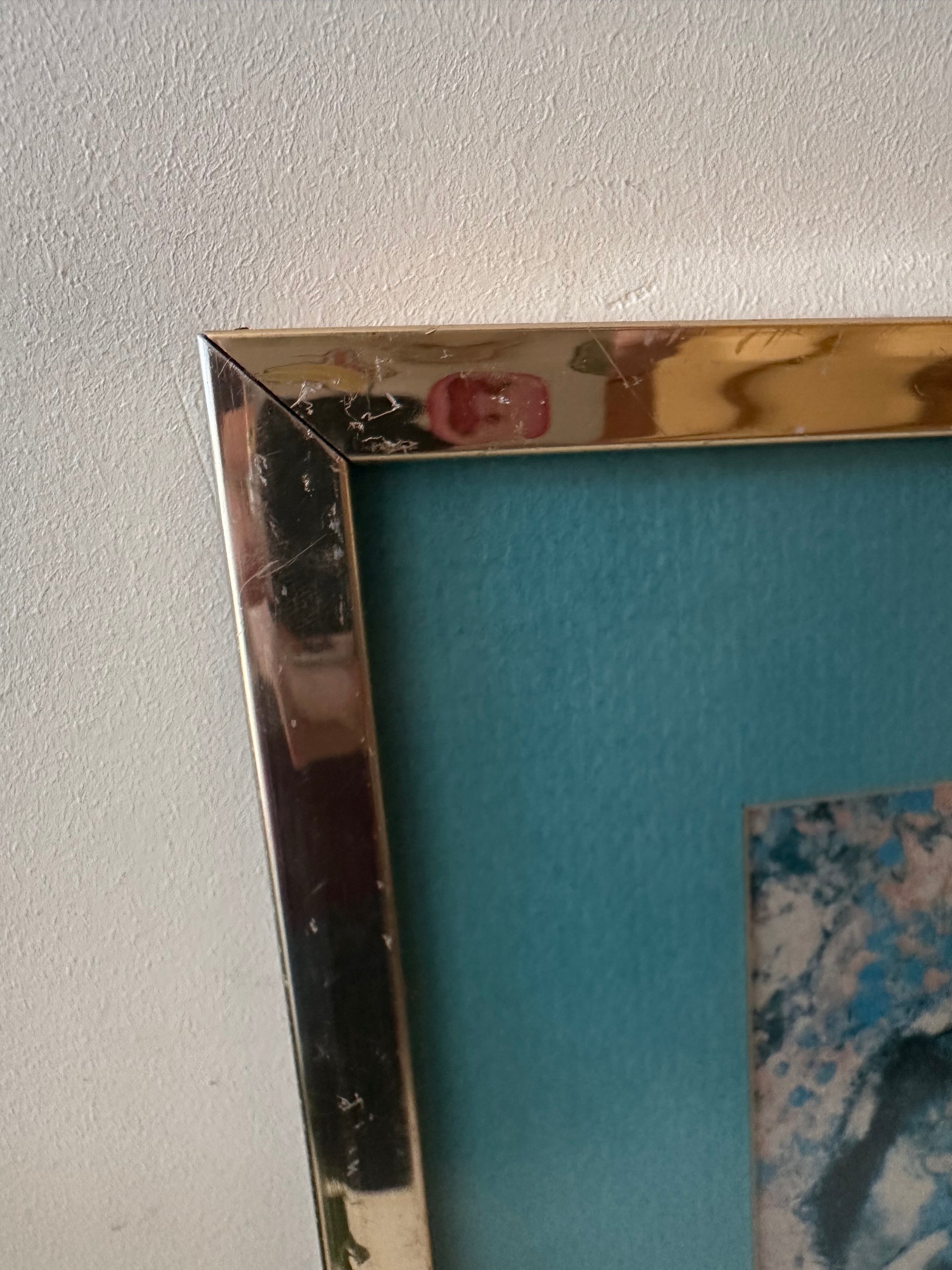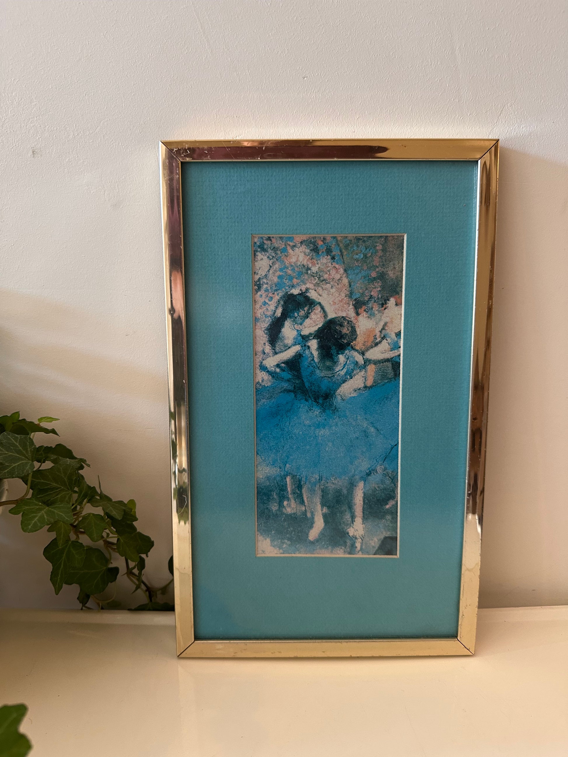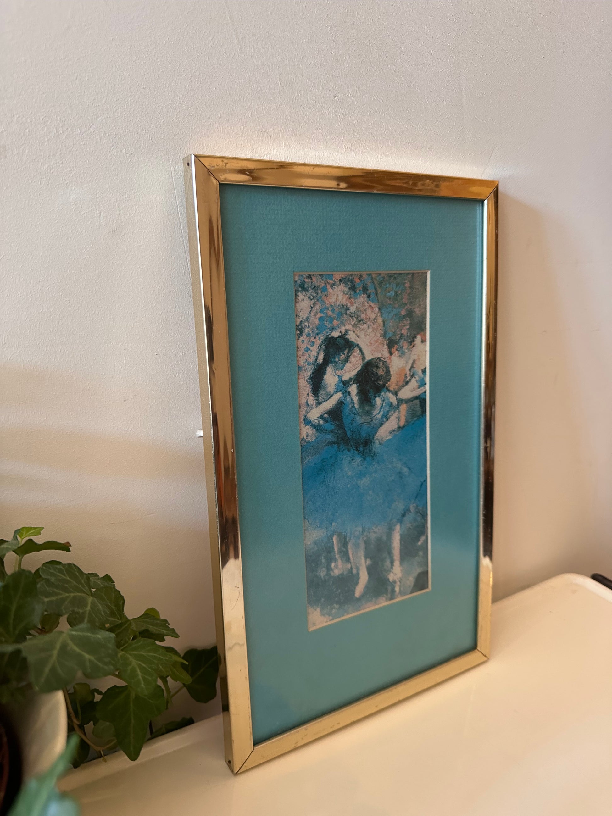 Charmant kunstwerkje met een reproductie naar Edgar Degas, bekend om zijn impressionistische schilderijen van ballerina’s. Dit werk in blauwtinten is ingelijst met een glimmende metalen rand en passe-partout in dezelfde kleur.