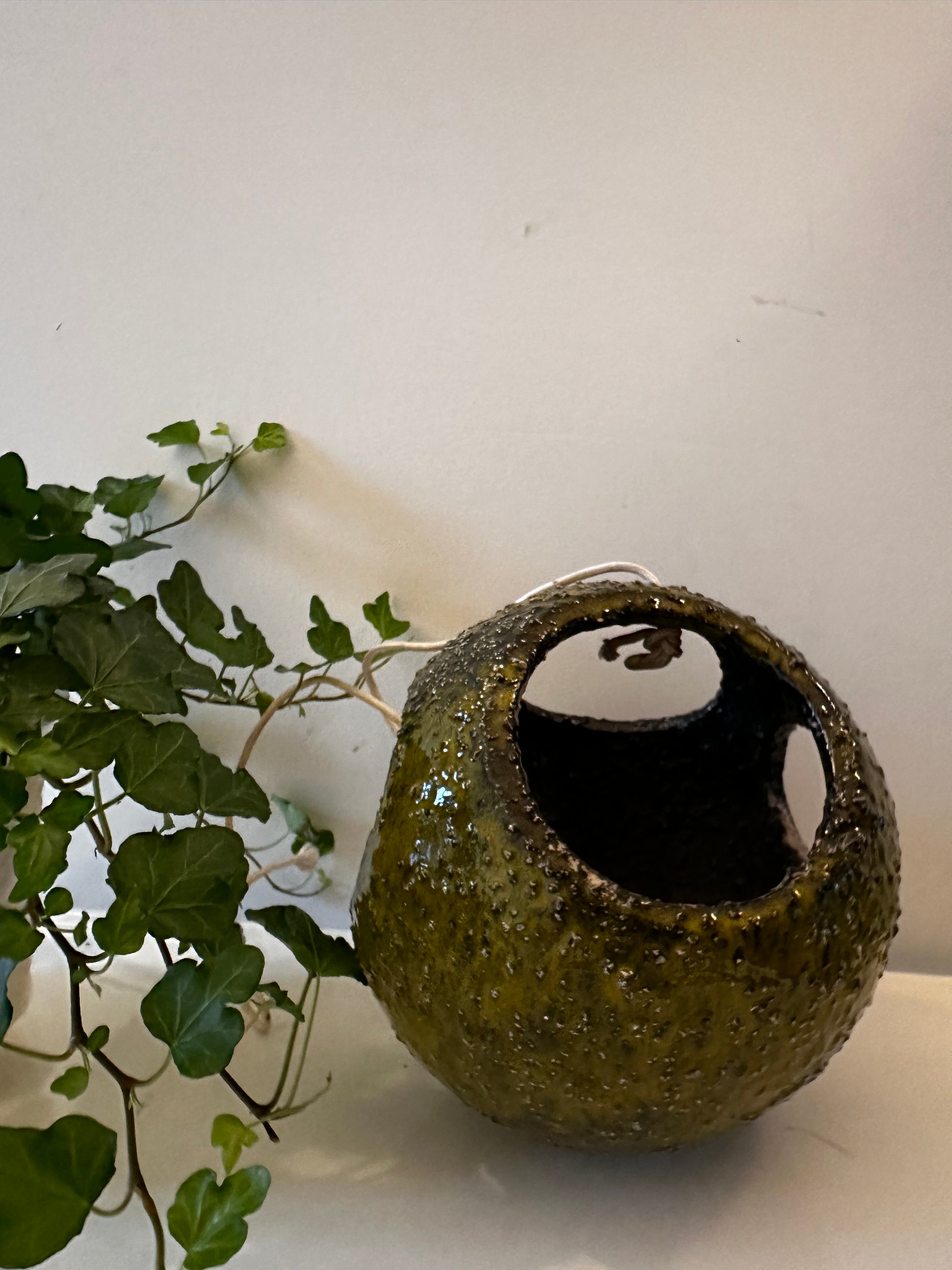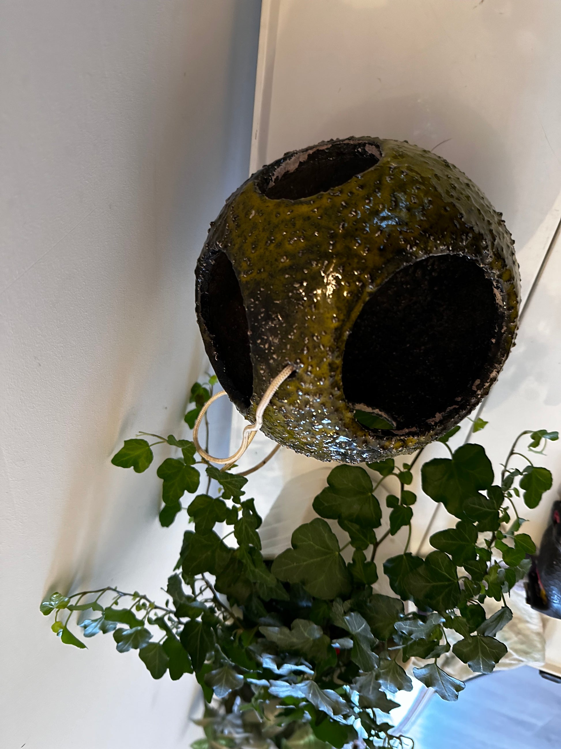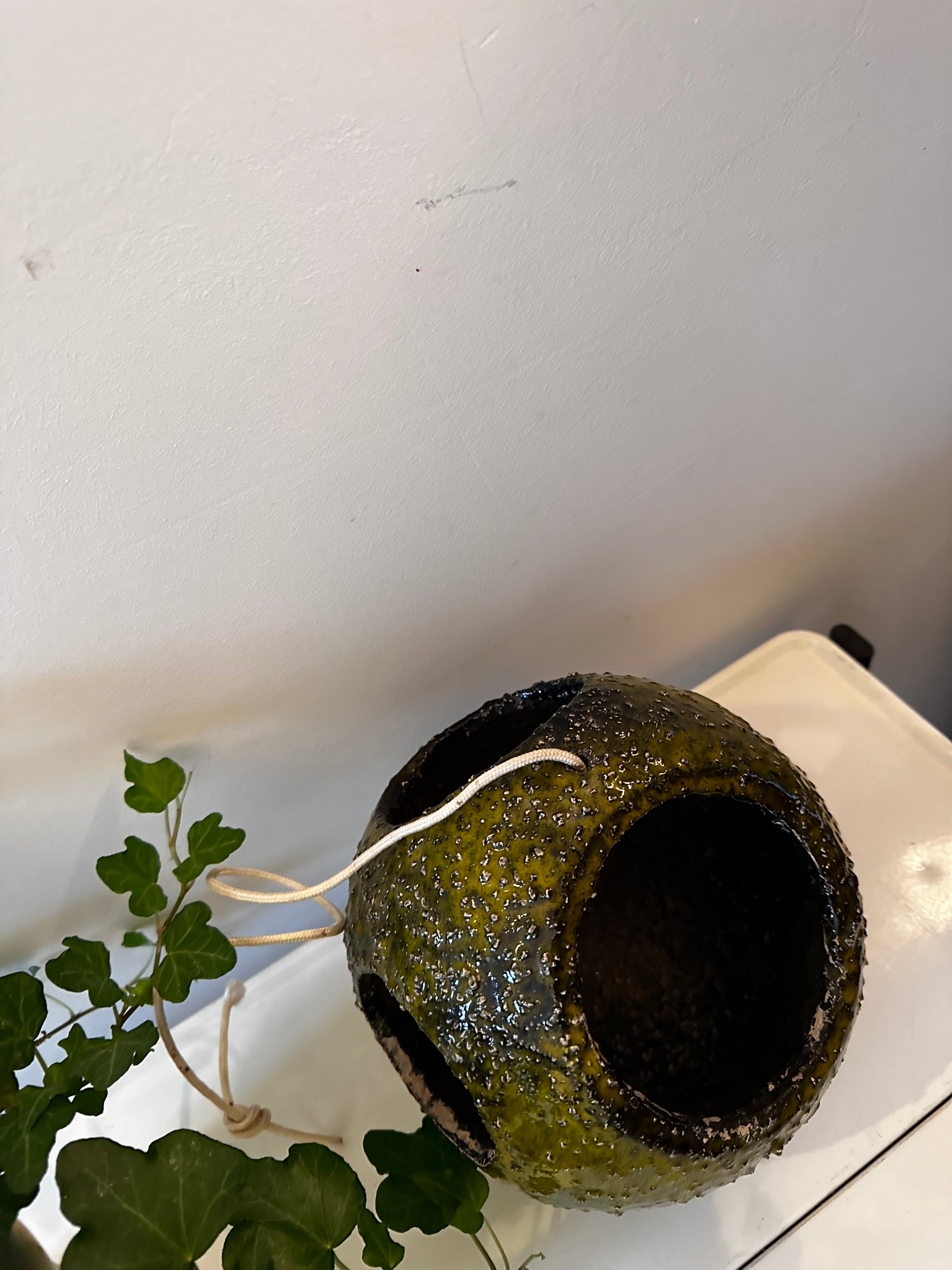 Een toffe retro plantenhangers. Deze keramieken plantenhangers dateert jaren 70. De plantenhanger heeft een groene kleur met donkere ondergrond, en een “stekelig” design. De plantenhanger heeft 4 openingen 2 grote en twee kleine.