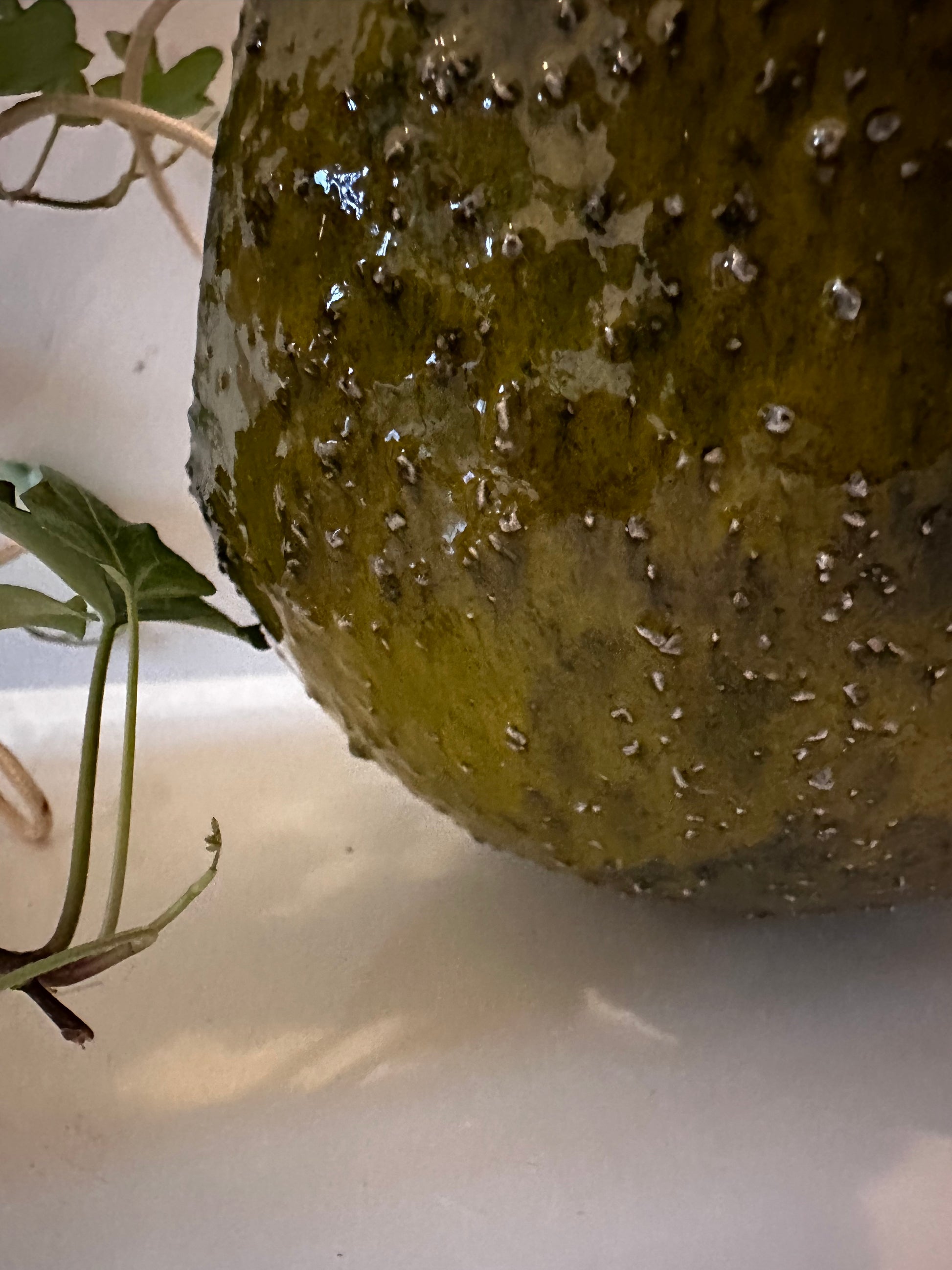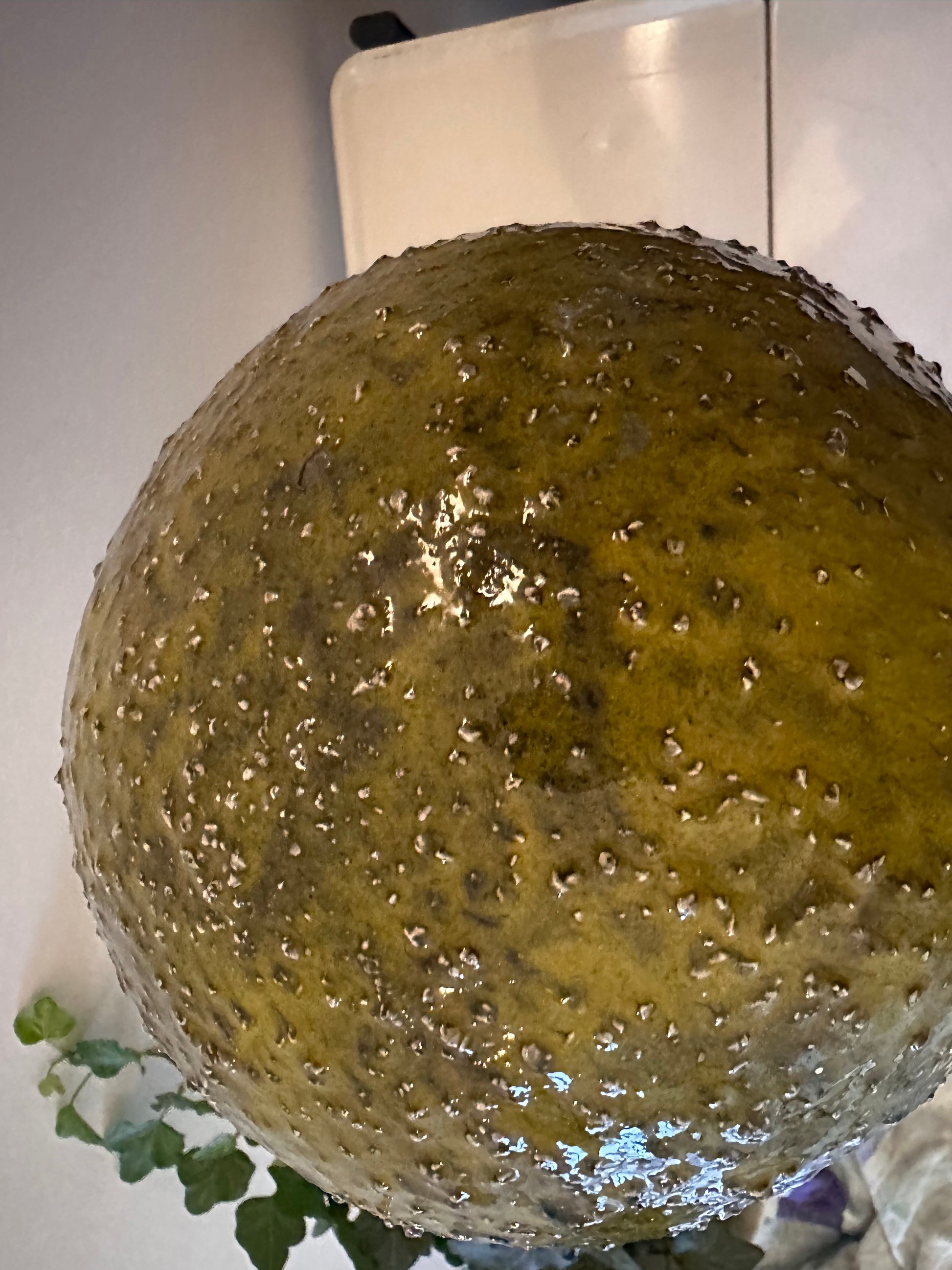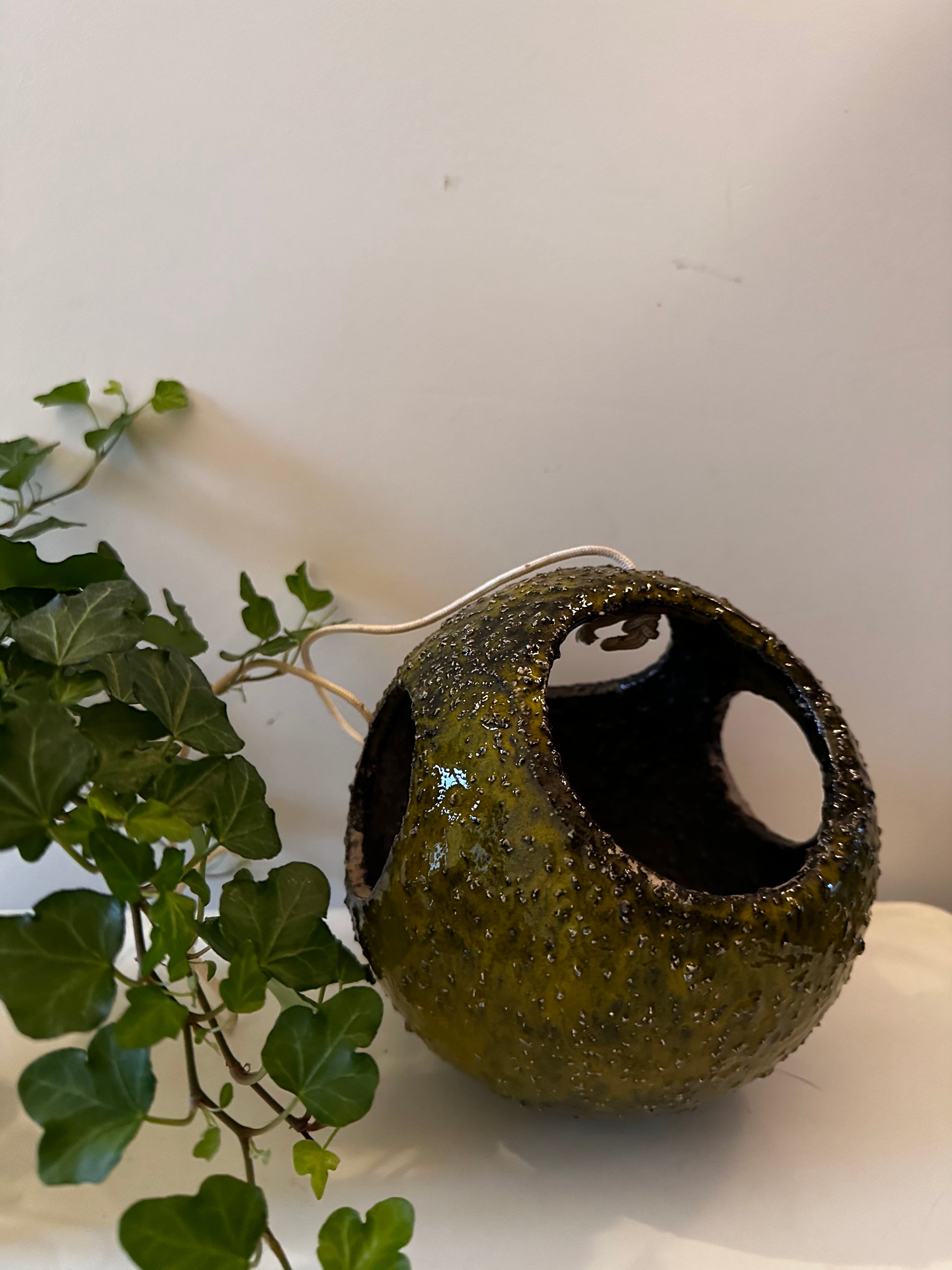 Een toffe retro plantenhangers. Deze keramieken plantenhangers dateert jaren 70. De plantenhanger heeft een groene kleur met donkere ondergrond, en een “stekelig” design. De plantenhanger heeft 4 openingen 2 grote en twee kleine.