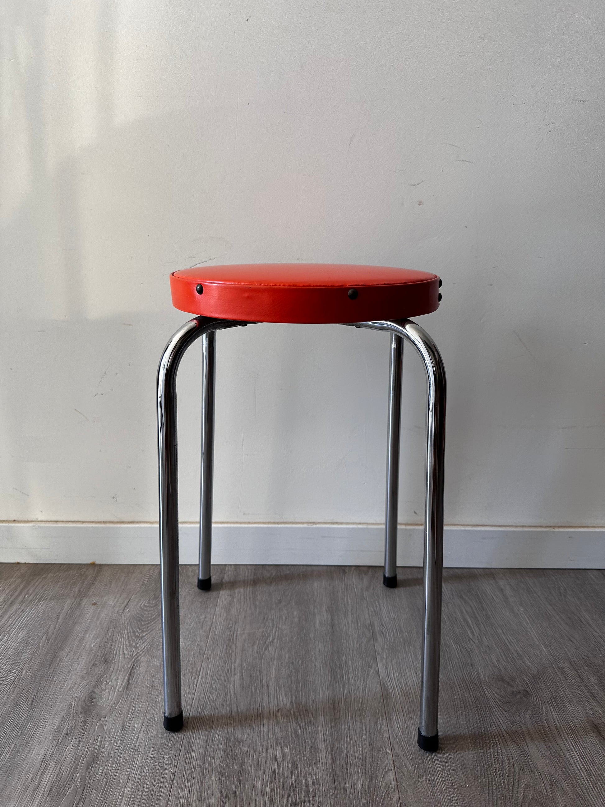 Te gekke retro krukje uit de jaren 70. Krukje met een ronde oranje zitting van skai bekleding. Kruk staat op 4 chrome pootjes met onderop zwarte nopjes. Krukje is in een supermooie vintage staat!