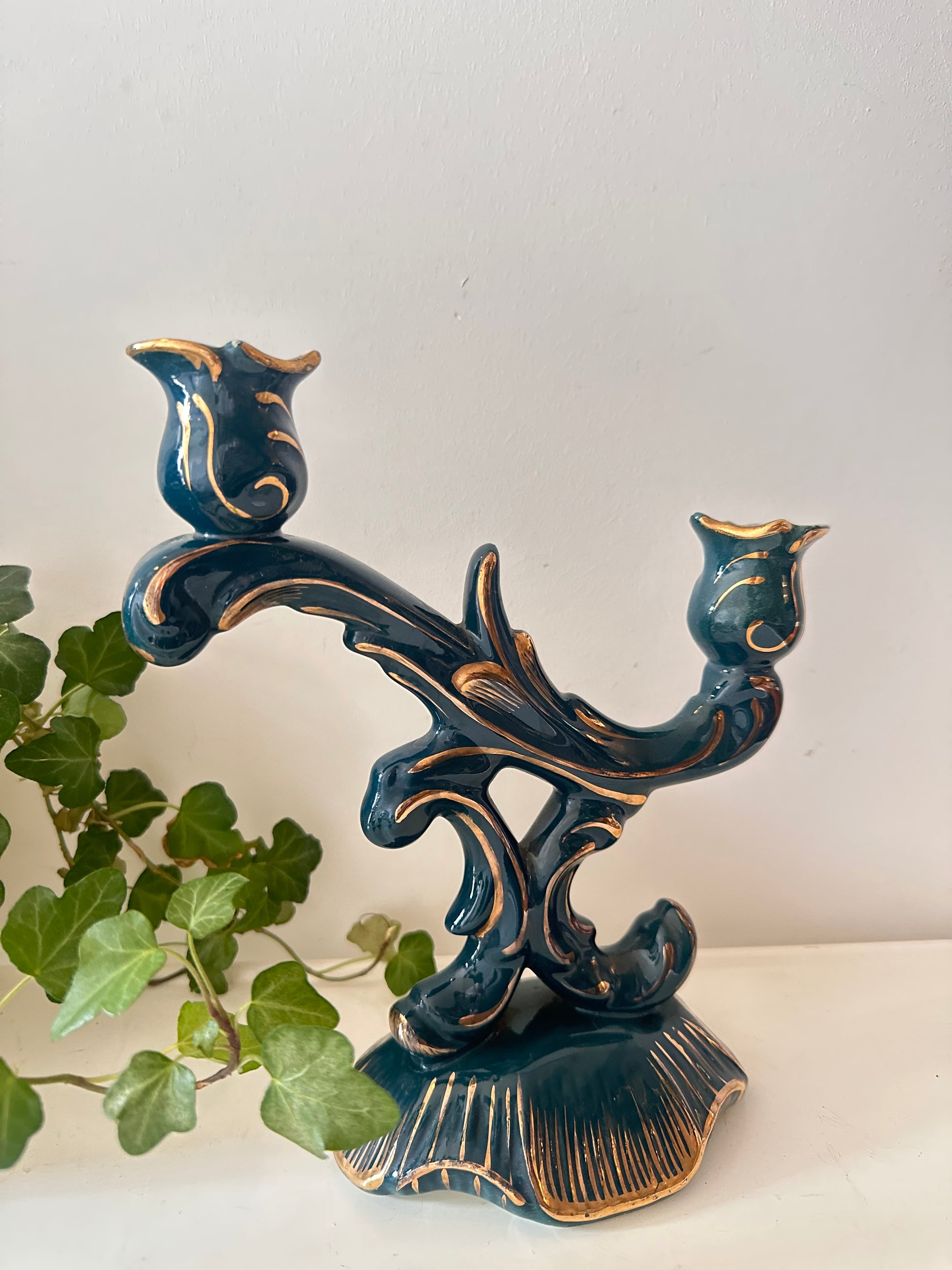Opvallend keramieken kandelaar in diepe petrolkleur met sierlijke rococo-krullen en handgeschilderde gouden accenten. Een beetje kitsch en een beetje chic. In een mooie vintage staat.