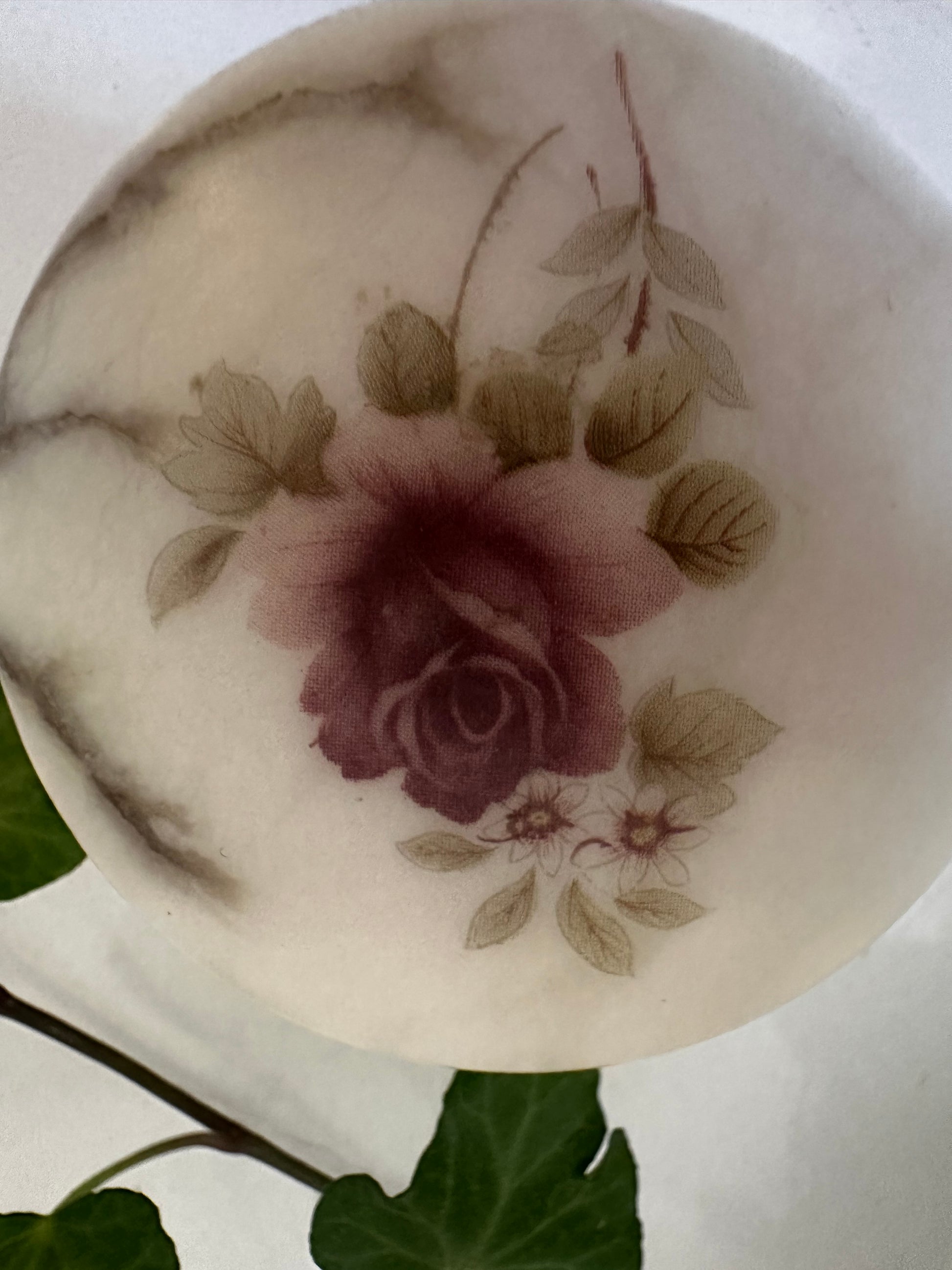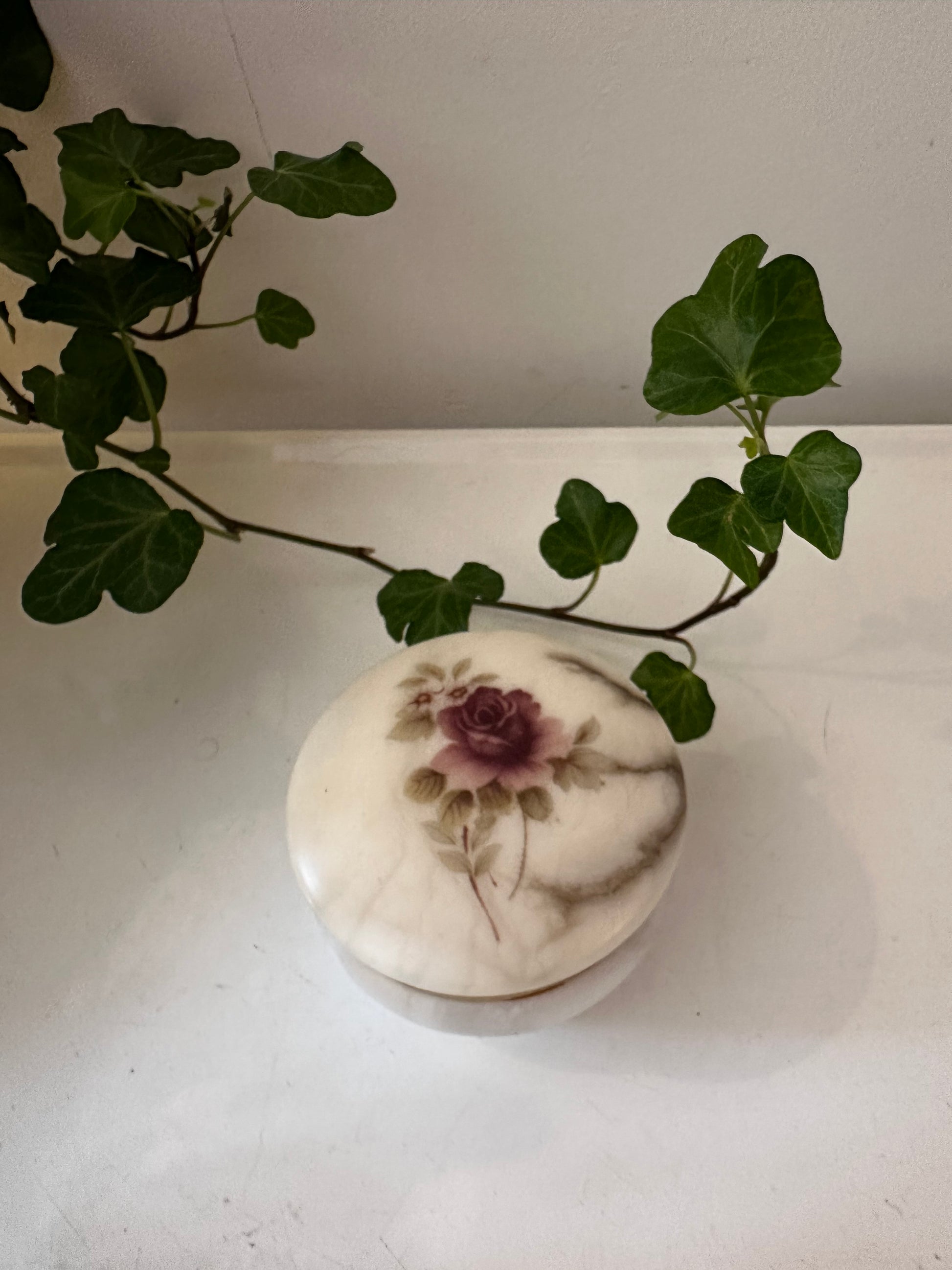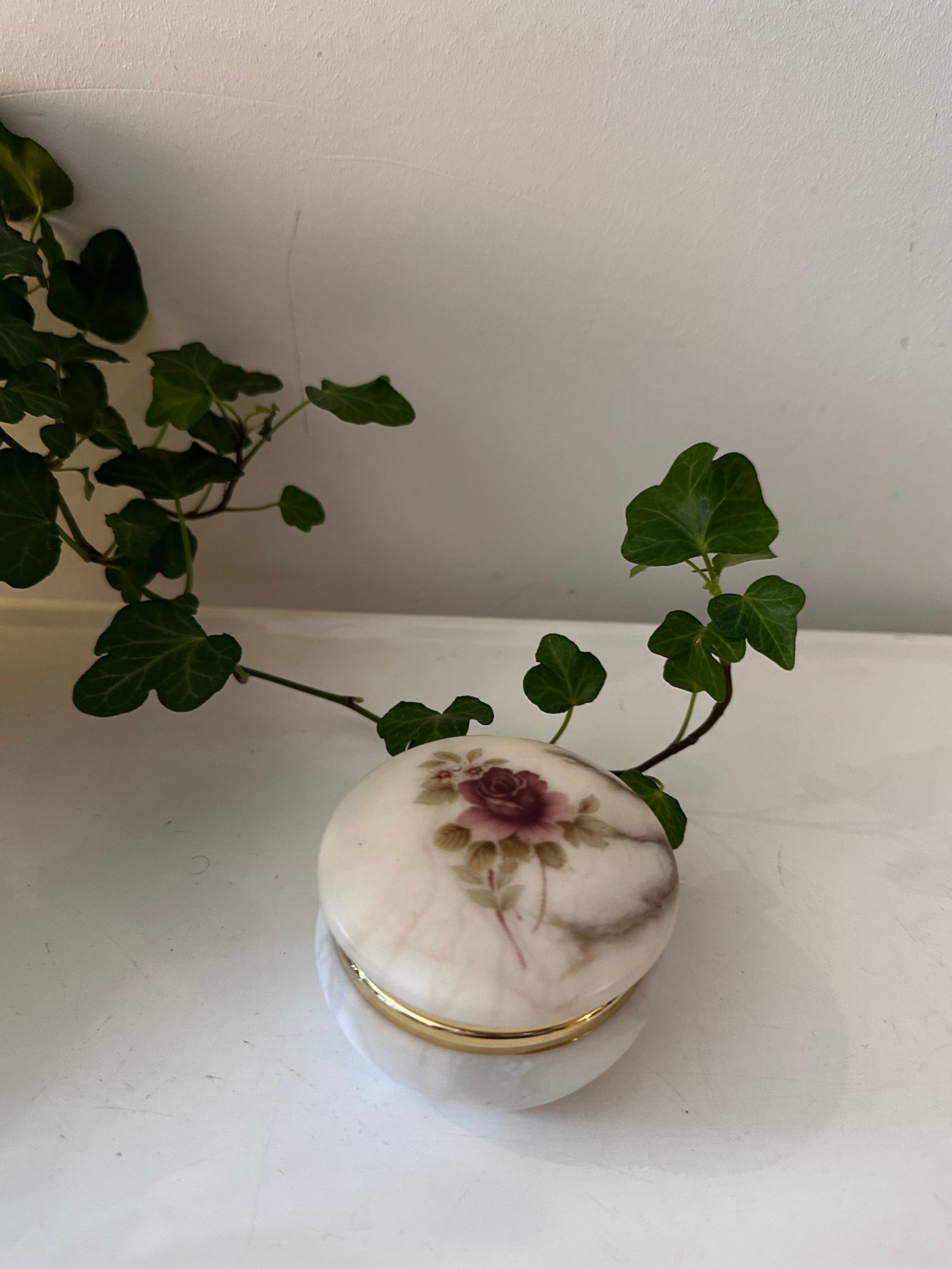 Prachtig vintage bewaardoosje met een romantische uitstraling. Dit ronde kistje heeft een marmerlook en is in een supermooie vintage staat. Op het dekseltje een decoratie van een roos, omlijst met een messing randje. Perfect voor sieraden of kleine schatten. Q770