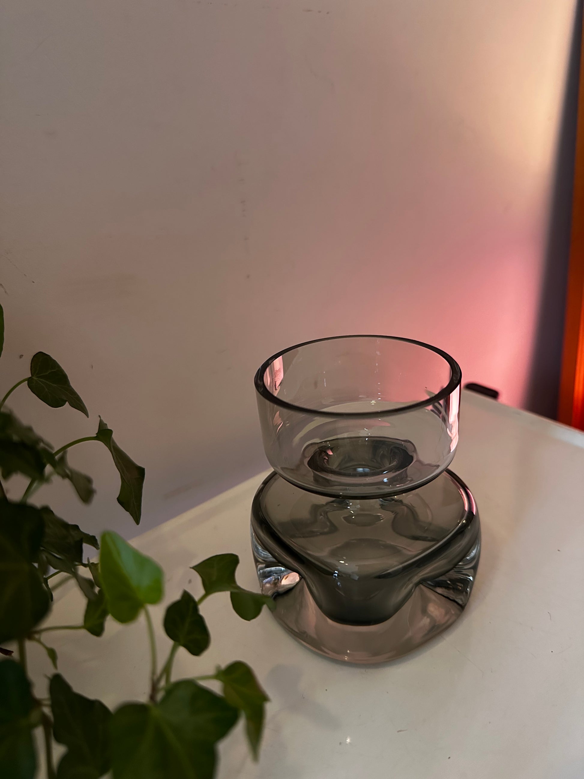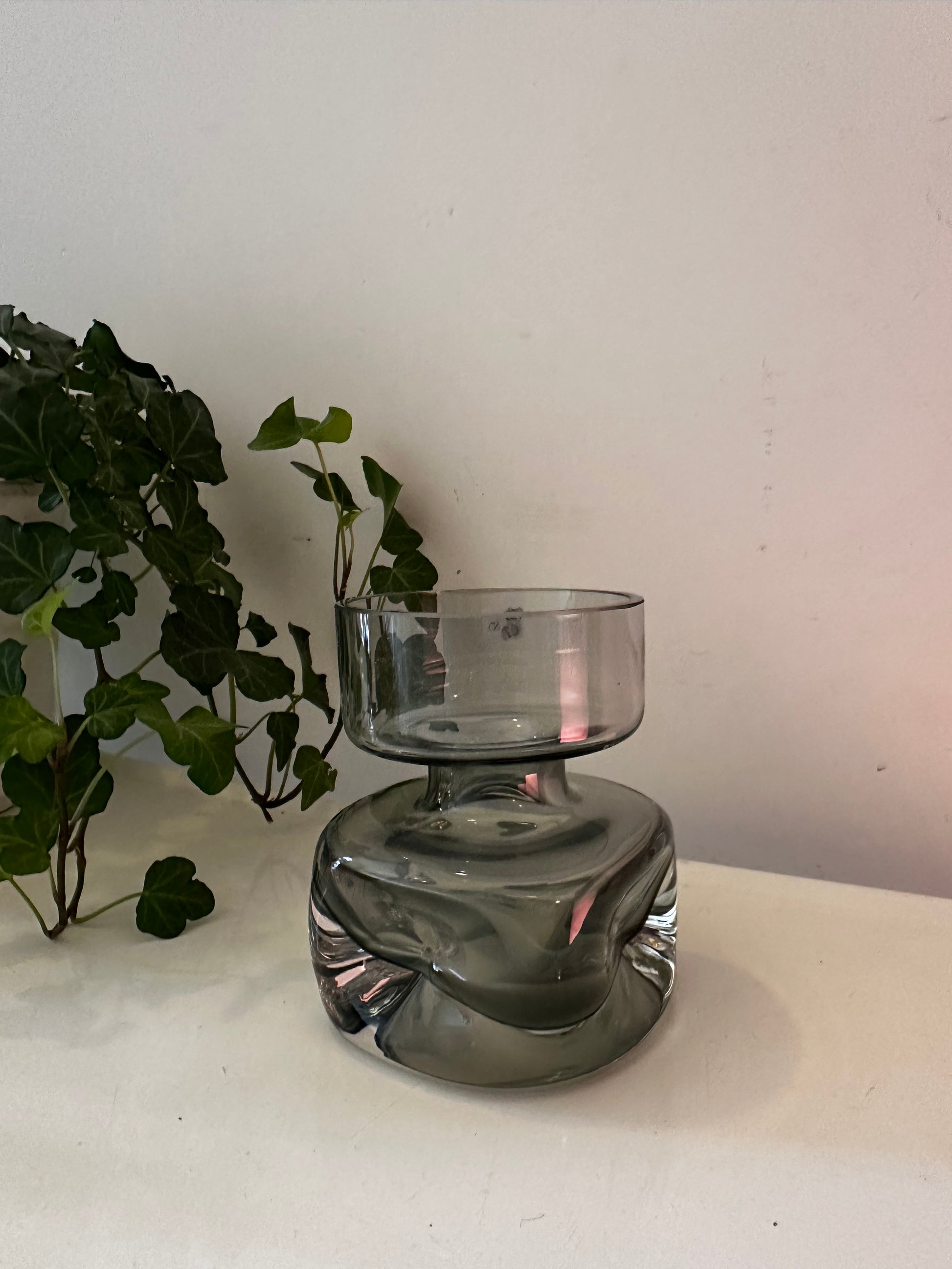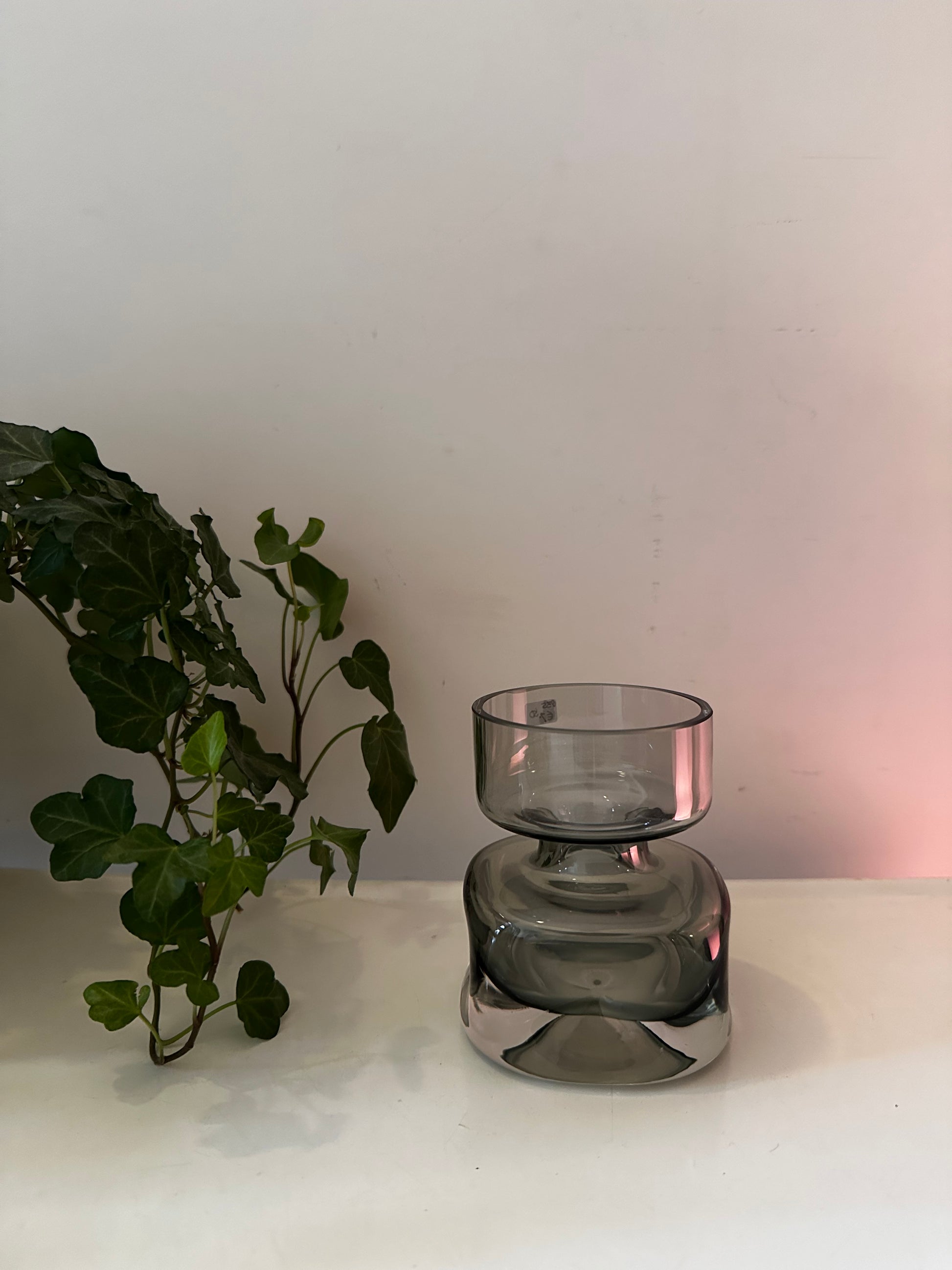 Bijzonder vaasje van rookglas, met een aparte eigen vorm. Mooi dik glas met die subtiele grijze waas die zo typisch is voor vintage rookglas. Er is ook nog een bijpassend hoger model te koop