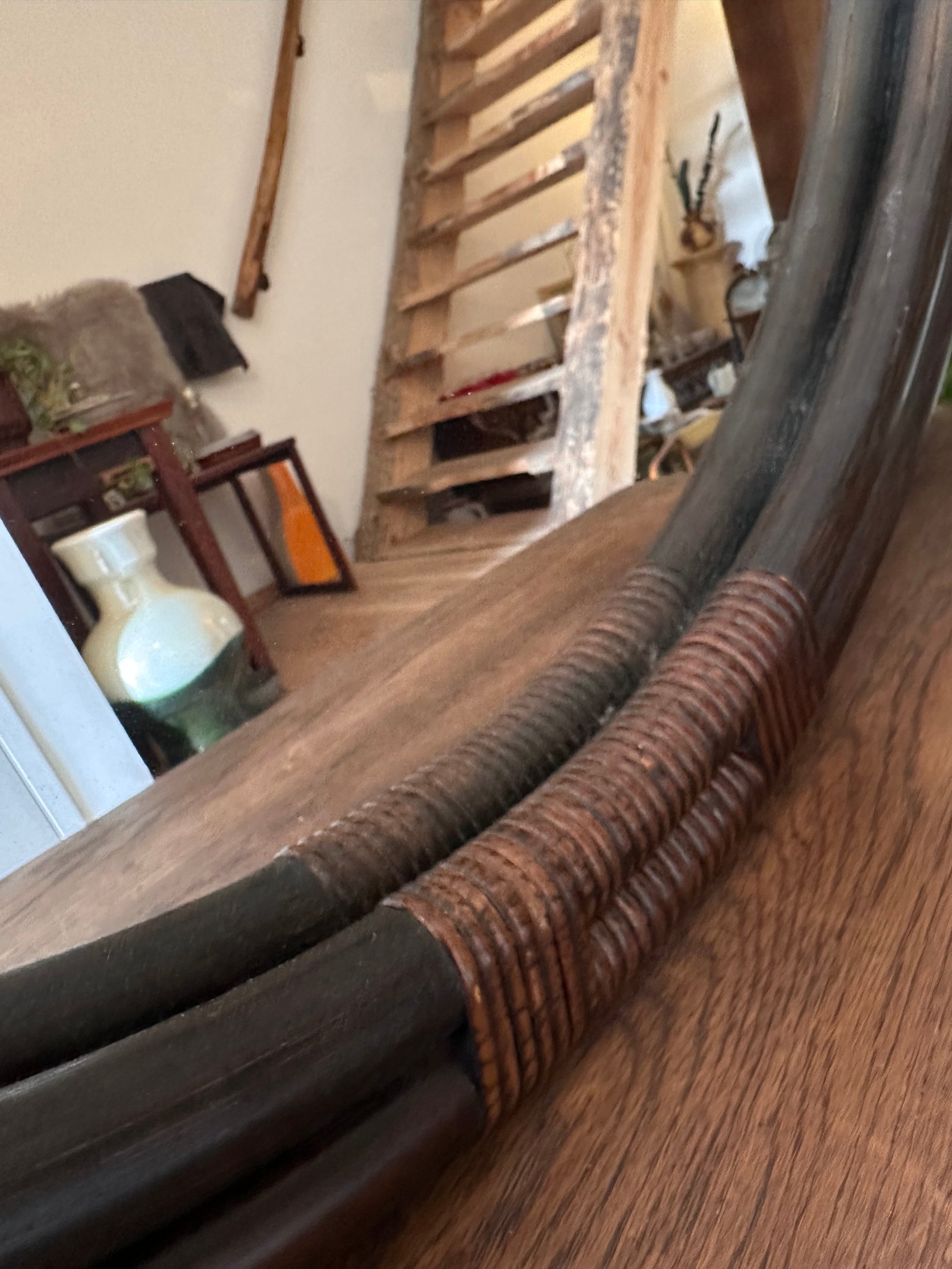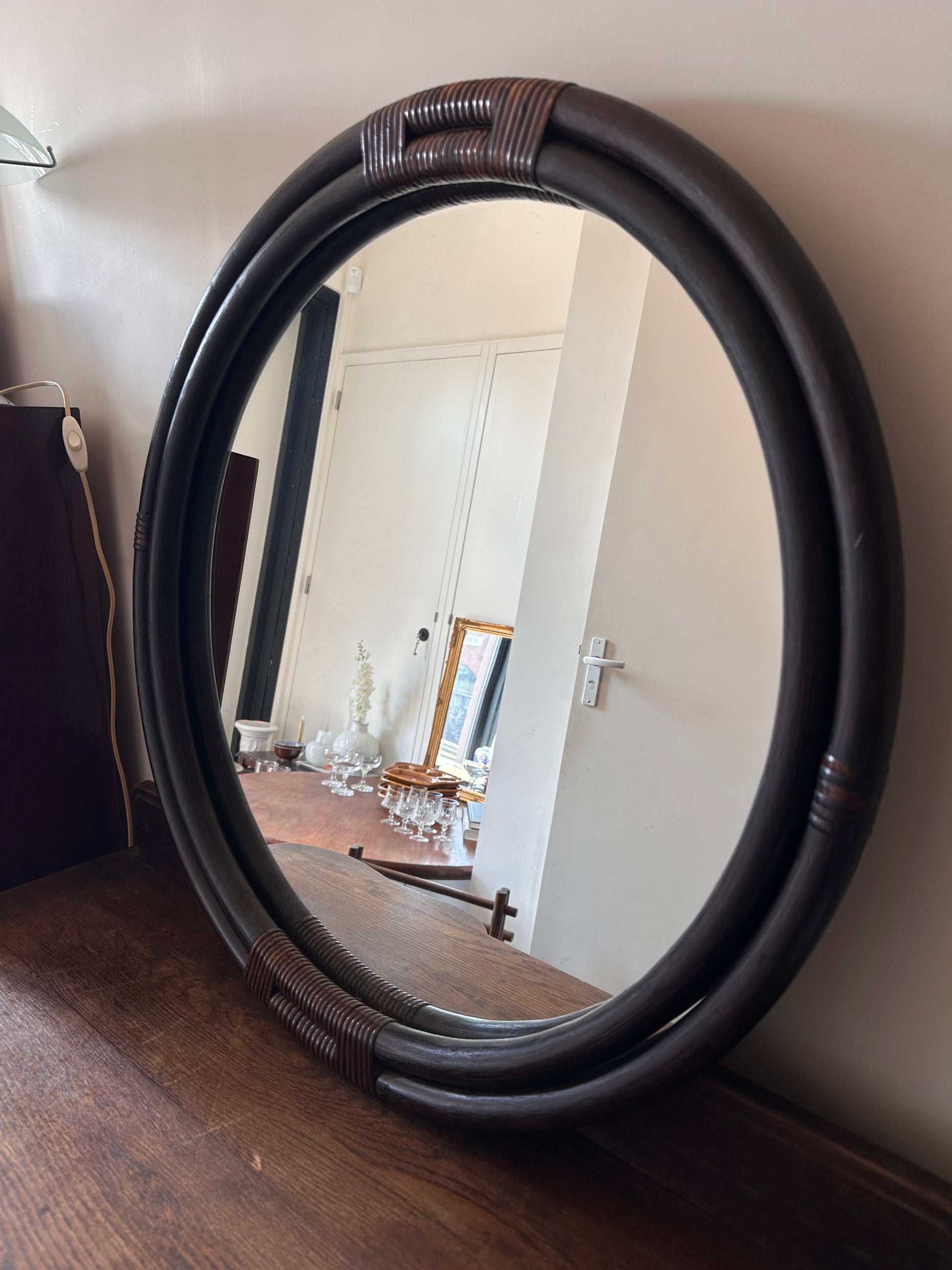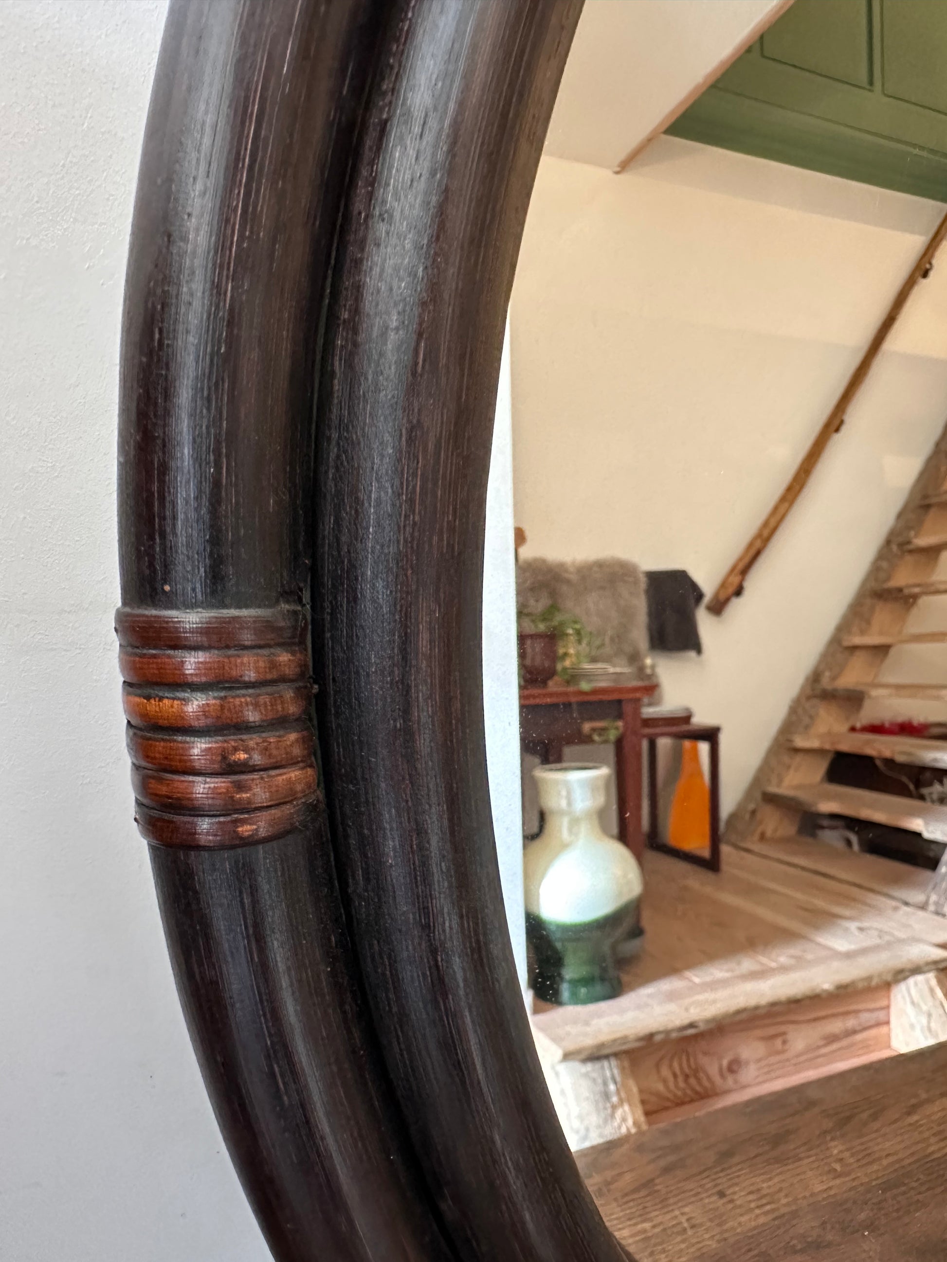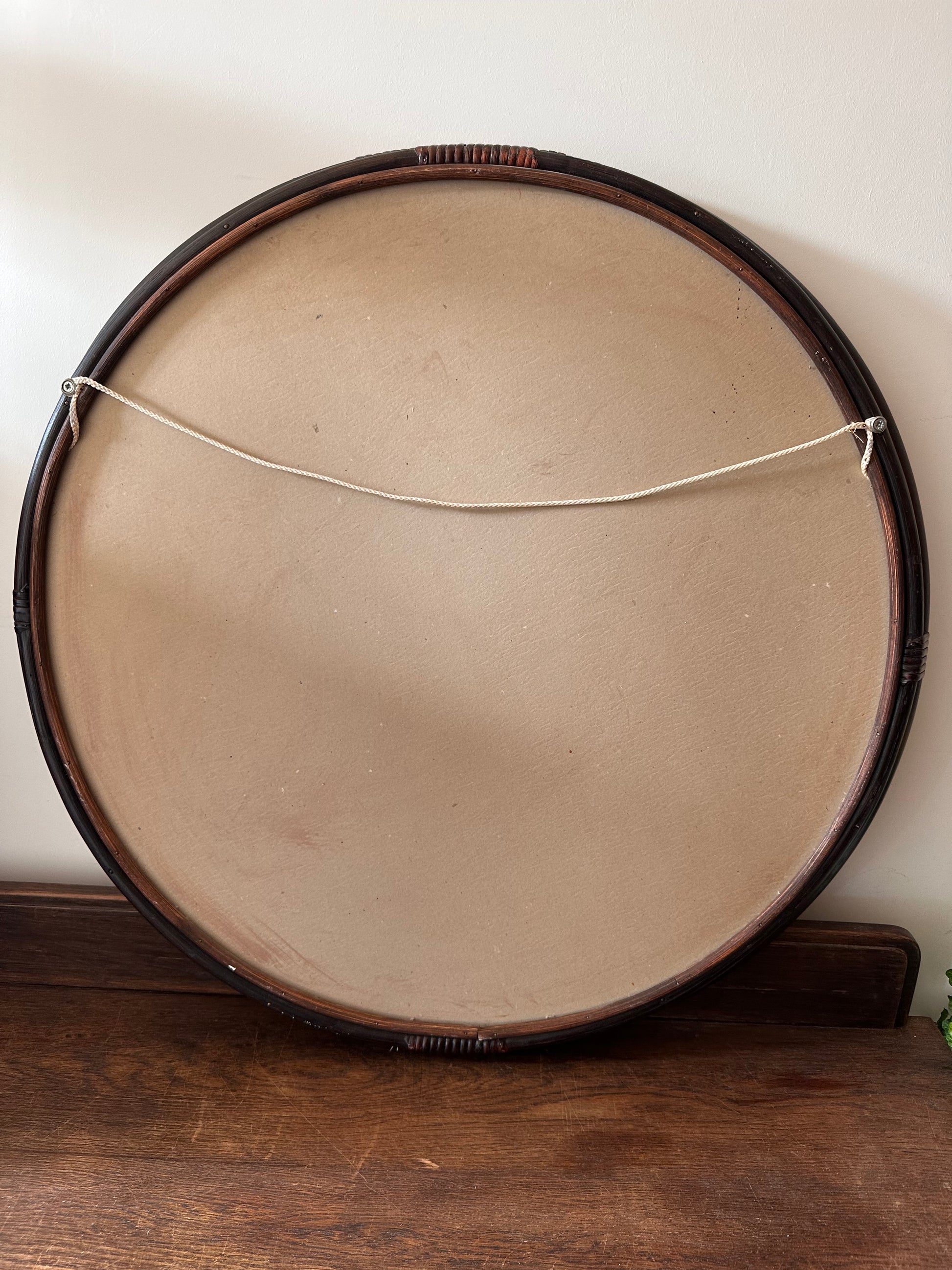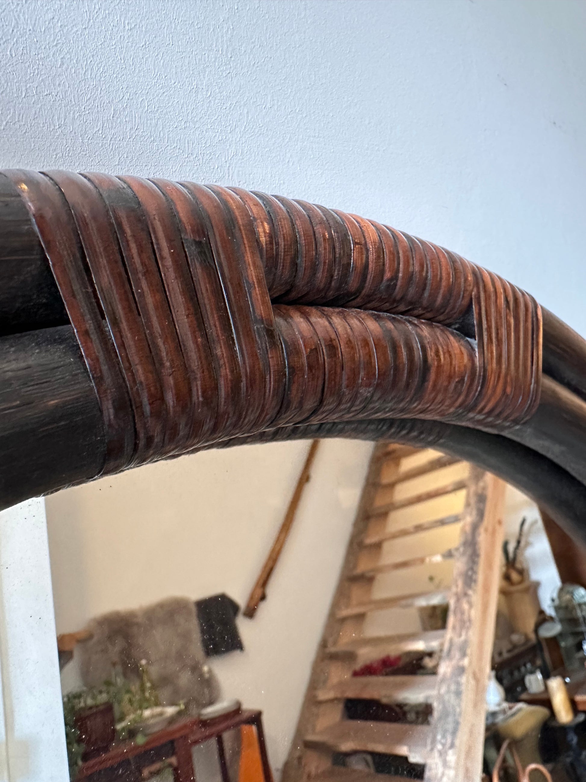Prachtige ronde spiegel met een donker rotan frame en gedetailleerde omwikkelingen. Een echte jaren 70 klassieker die meteen warmte toevoegt aan je interieur. Mooi boven een dressoir, in de hal of als statement piece in de woonkamer. Q421