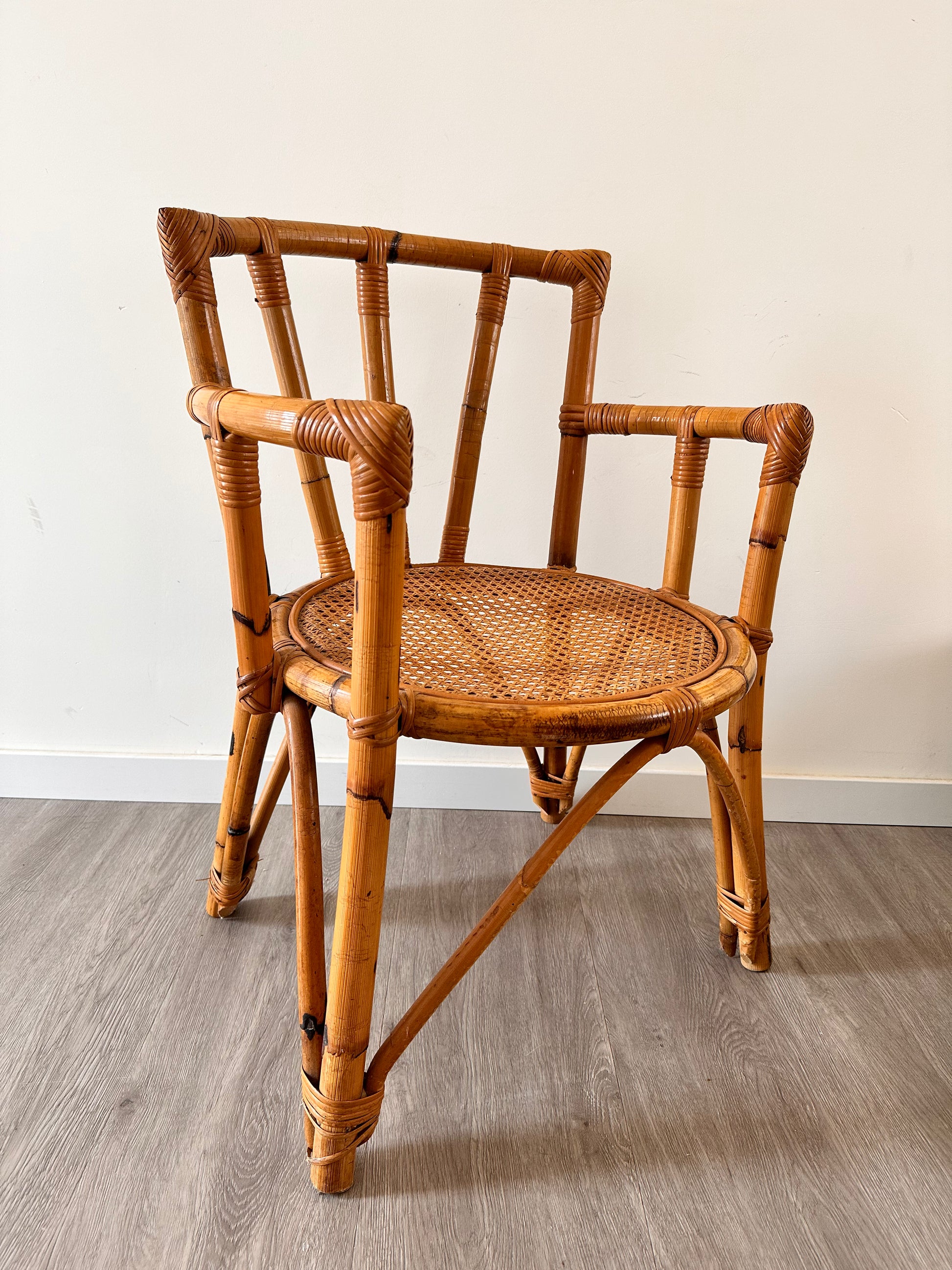 Een nog supermooie rotan stoel. Deze stoel is in een nog hele mooie vintage staat. Mooie details bij de armleuning. Zitting is een soort rotan raster en helemaal in tact. Afkomstig uit Spanje