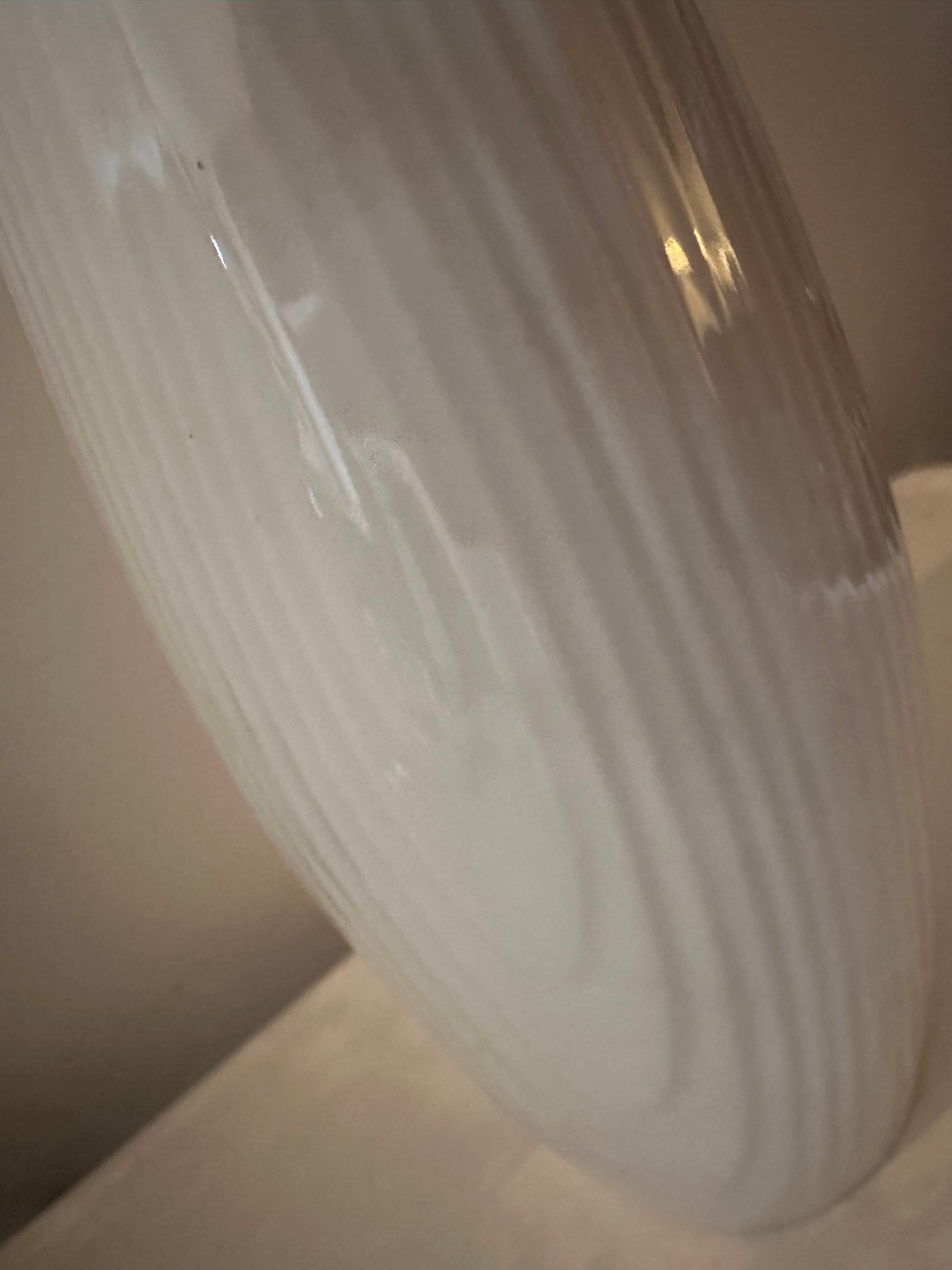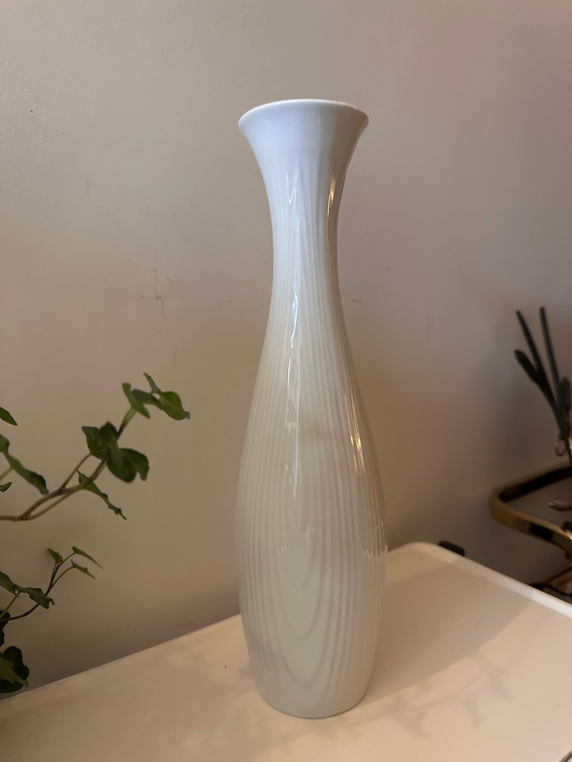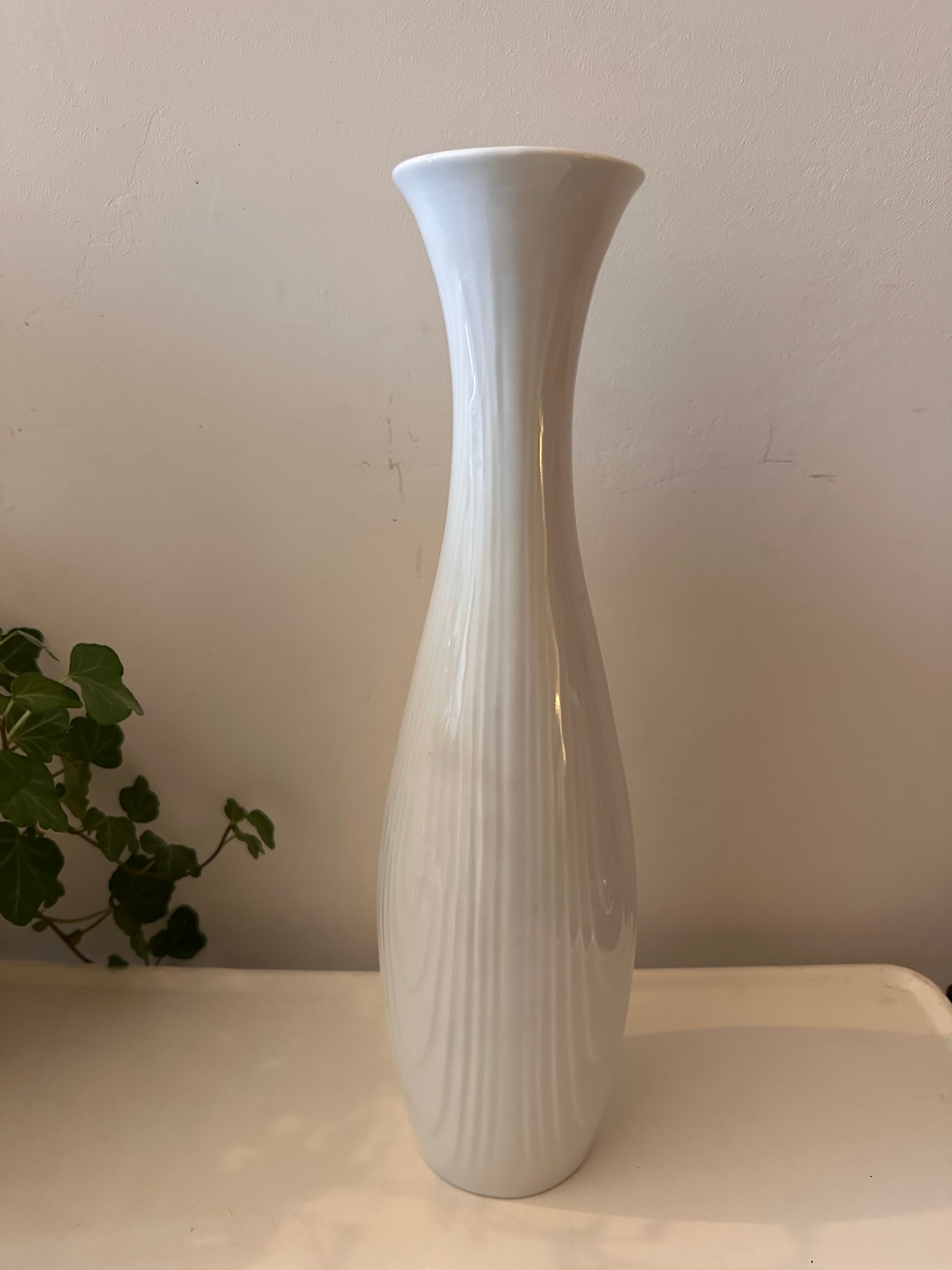 Supermooie slanke vaas met reliëf en een zachte glans in het porselein. Minimalistisch design, Duits vakwerk uit de jaren 60-70 – en handgemaakt volgens het stempel aan de onderzijde. Staat mooi solo of met een paar losse takken erin. Q574
