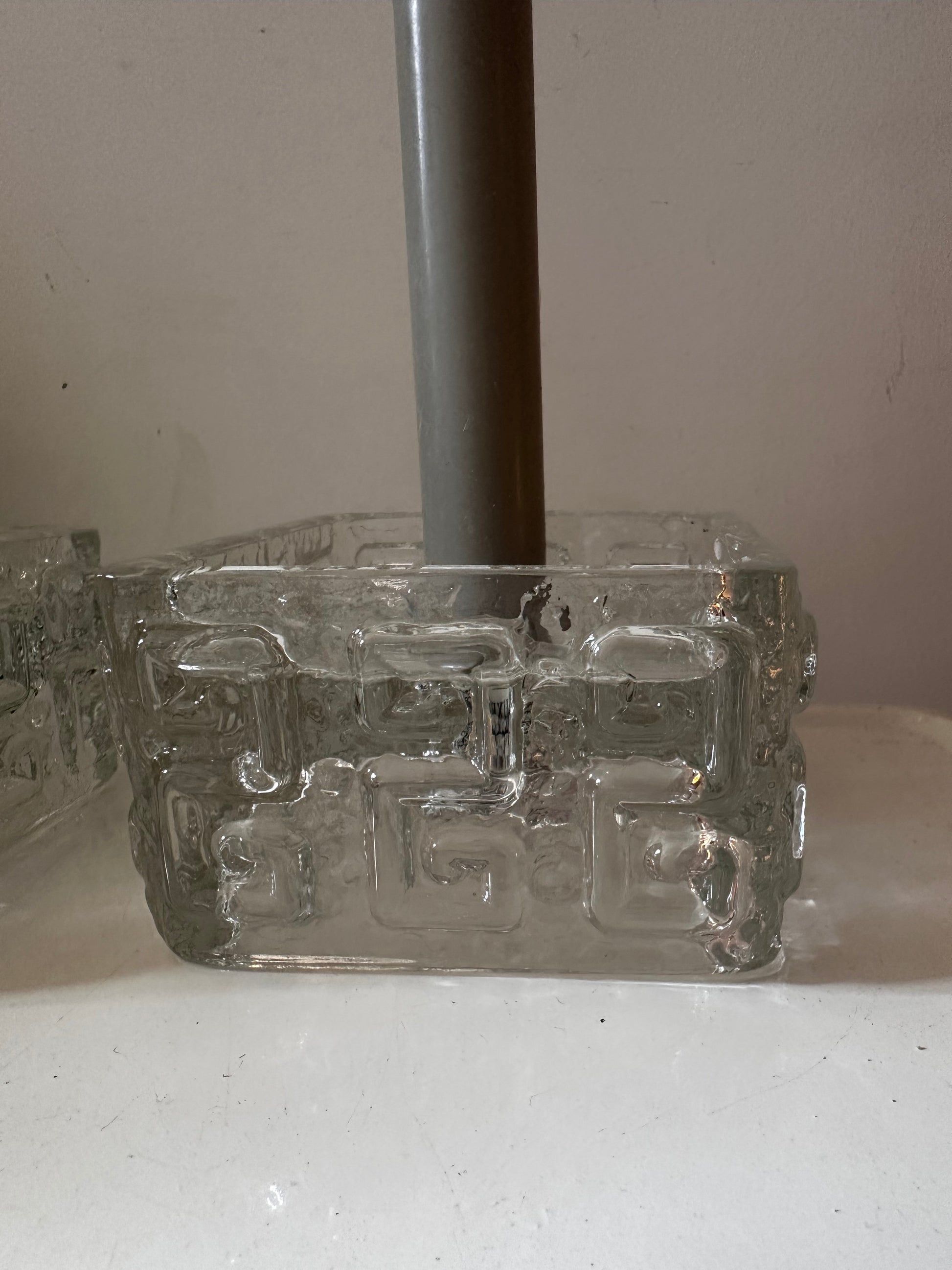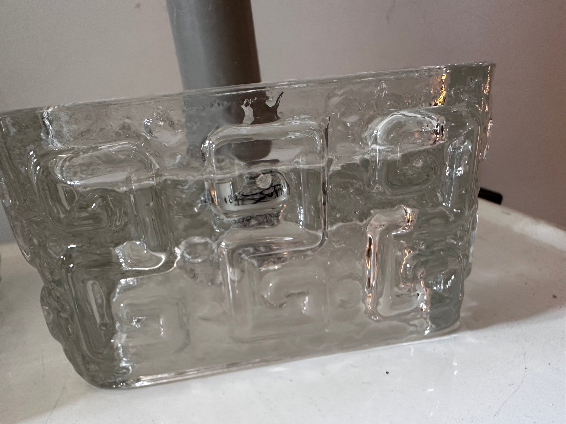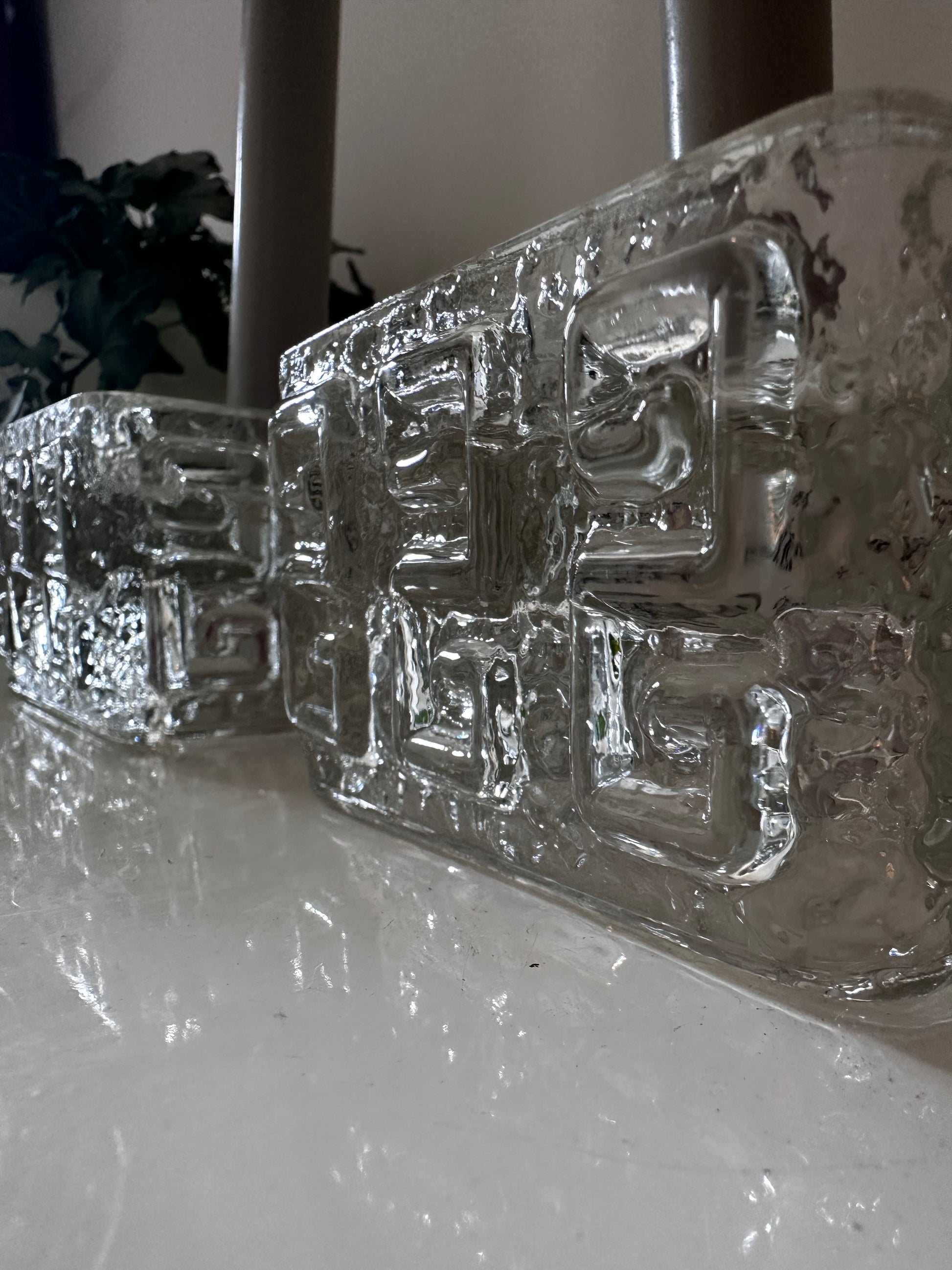 Twee robuuste kandelaars van helder glas met een grafisch reliëf en ijsblok-look. Typische seventies, Scandinavisch design – minimalistisch, maar opvallend. Prachtig met kaarsen, maar ook gewoon als object.