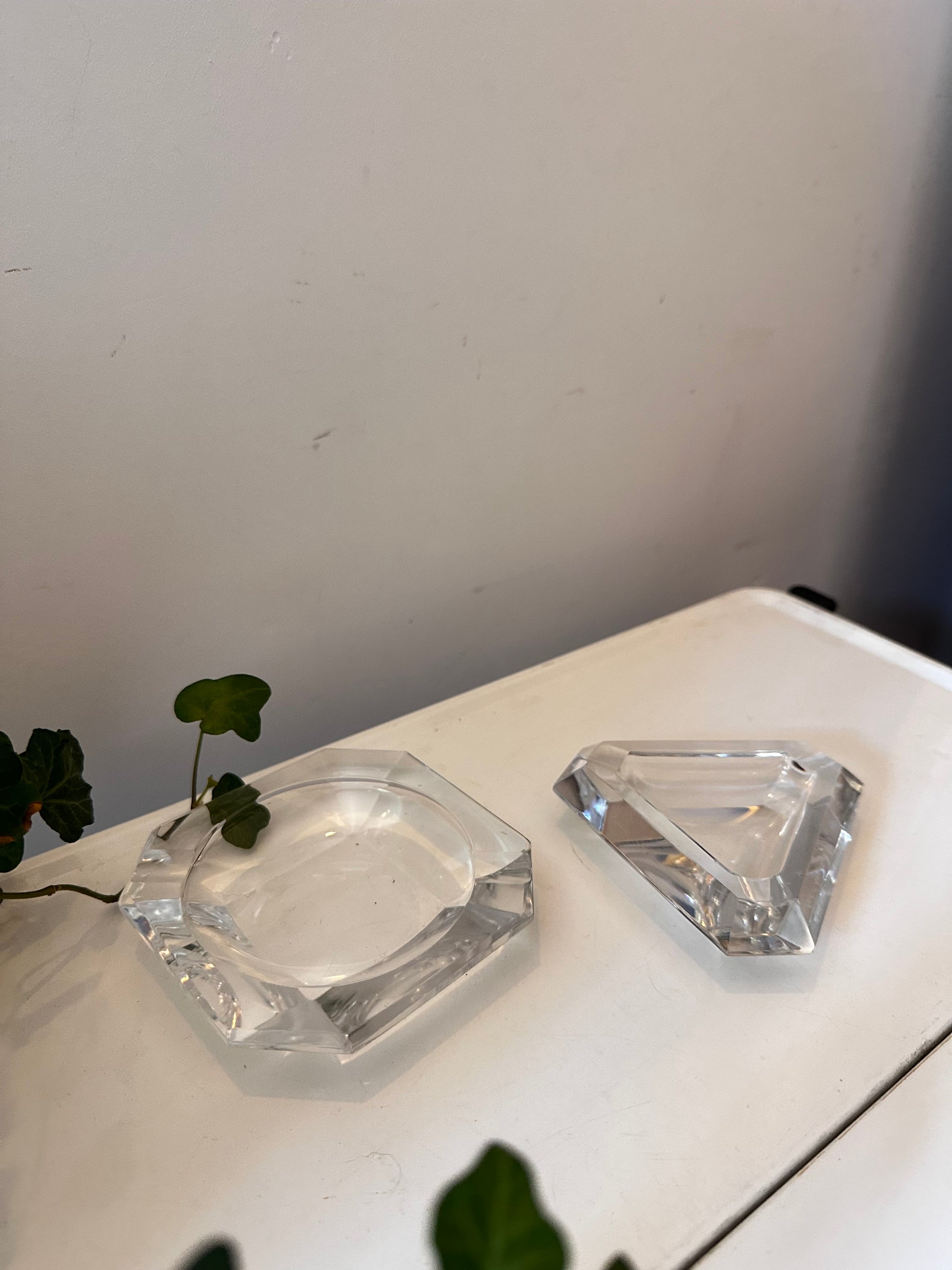 Prachtige vintage set van twee zware kristallen asbakjes met facetgeslepen randen. De ene is driehoekig, de andere heeft een zeshoekige (bijna vierkante) vorm. Ze zijn mooi helder van kleur en hebben een luxe uitstraling . Beide in mooie staat. Q965