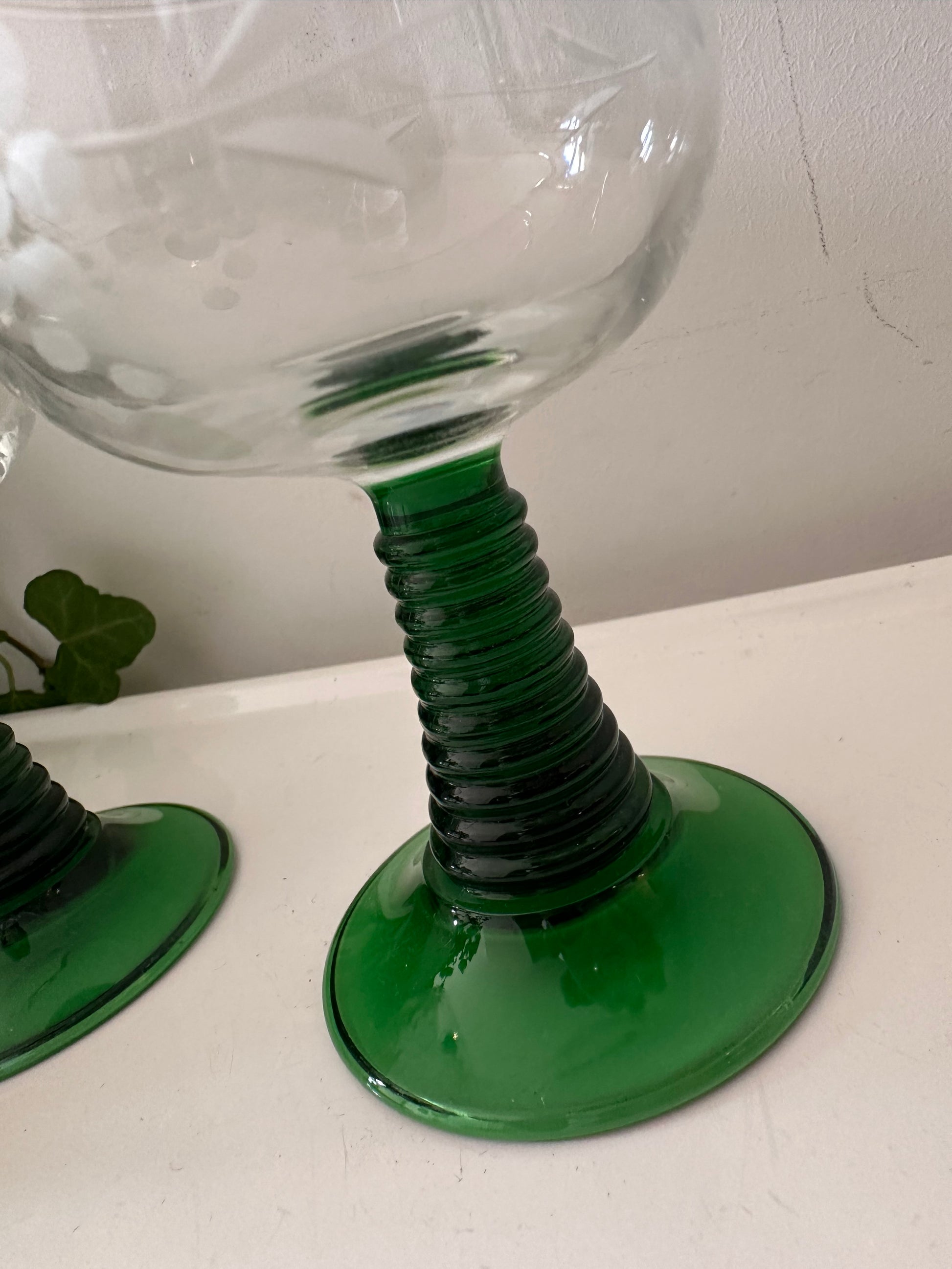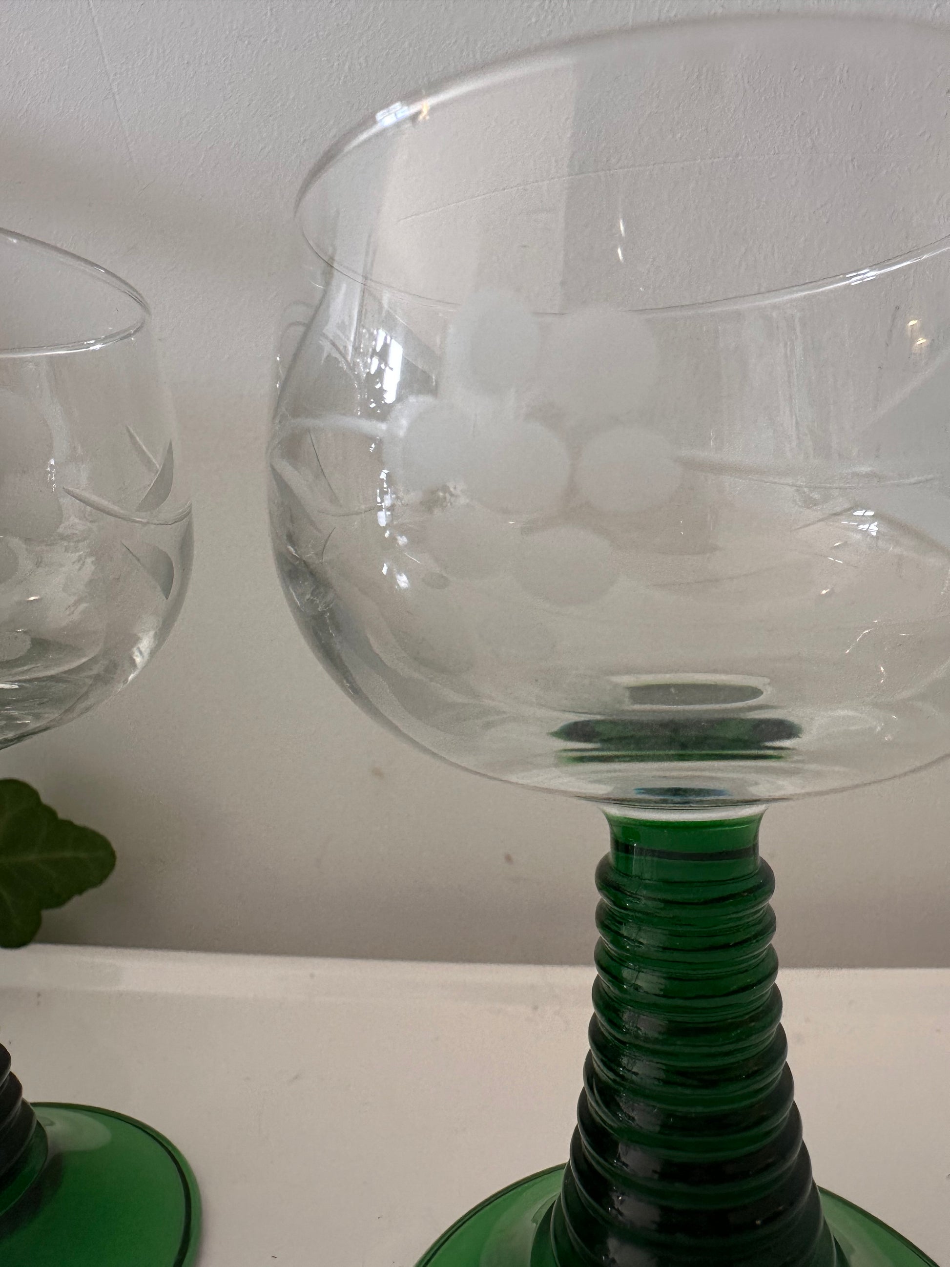Typische Duitse wijnglazen met die herkenbare groene spiraalvoet en brede kelk. Deze Roemers zijn rond de jaren 60–70 gemaakt en hebben een handgeslepen druiventros gravure. Ideaal voor witte wijn of gewoon als sfeervol glaswerk met een retro uitstraling. Q417