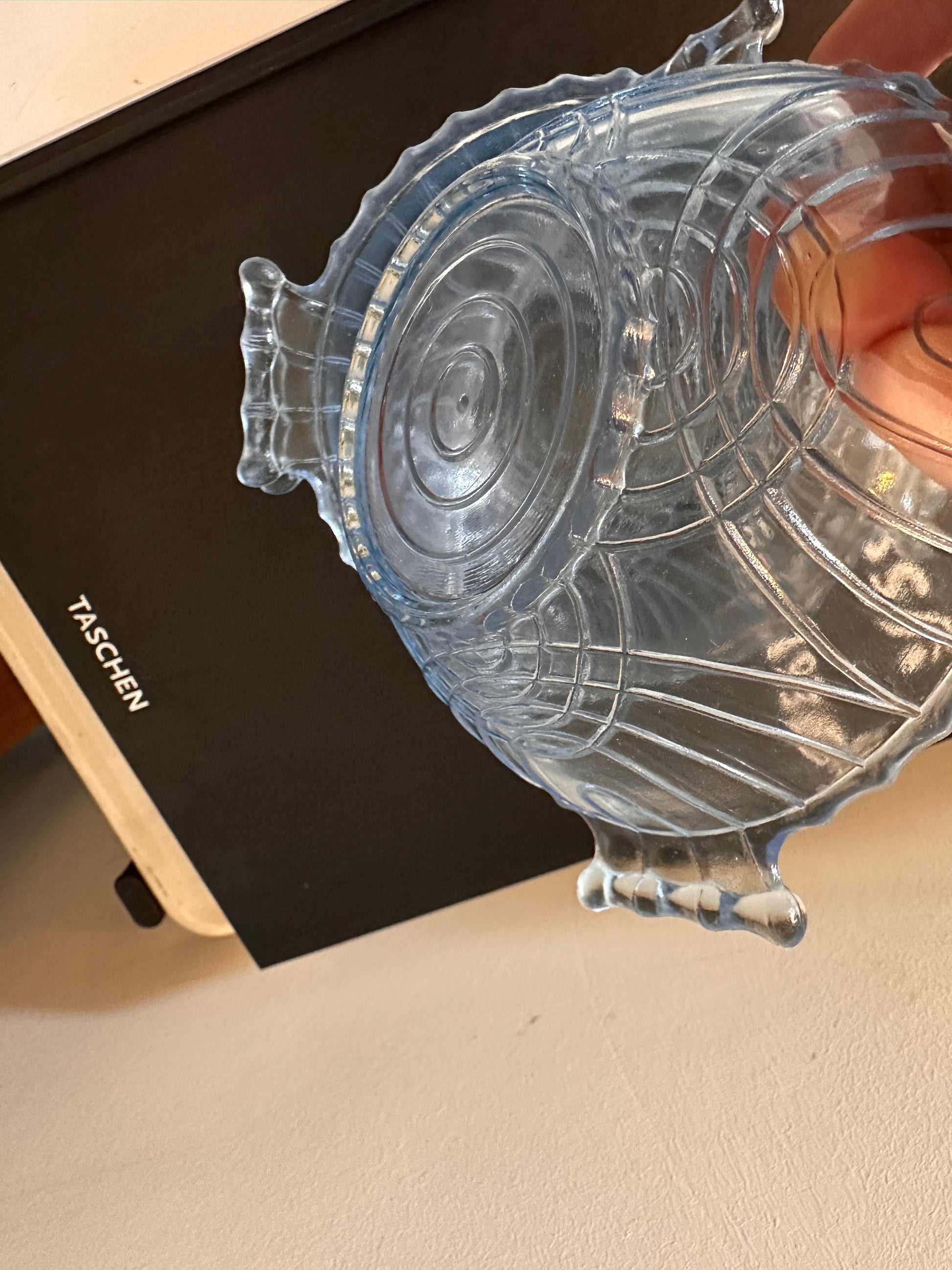 Hoe leuk zijn deze? Lichtblauw glas, gek geribbeld motief en van die grappige handvatjes. Ideaal voor een bolletje ijs, wat nootjes of gewoon omdat ze té cute zijn. In toffe vintage staat. Q210