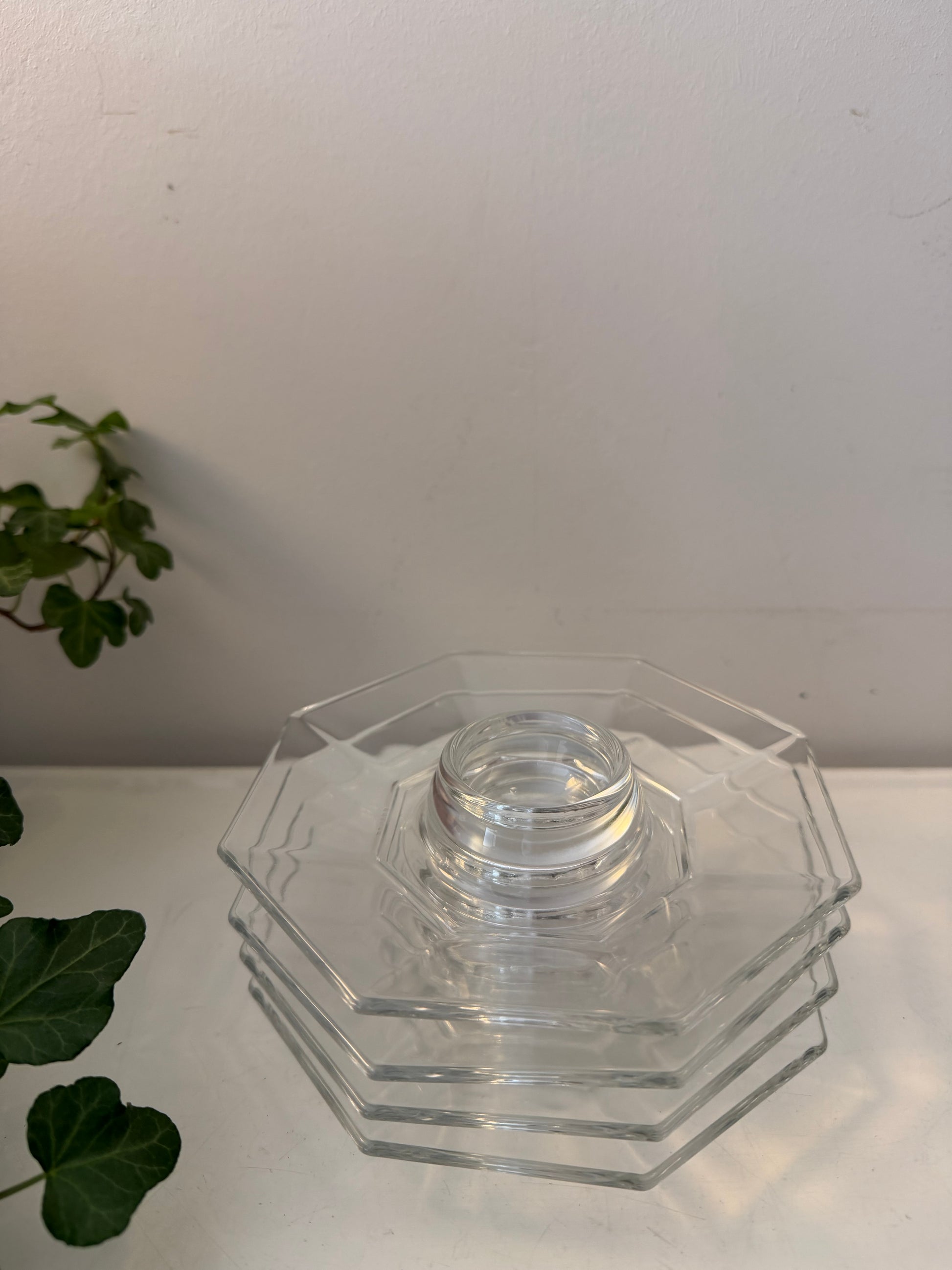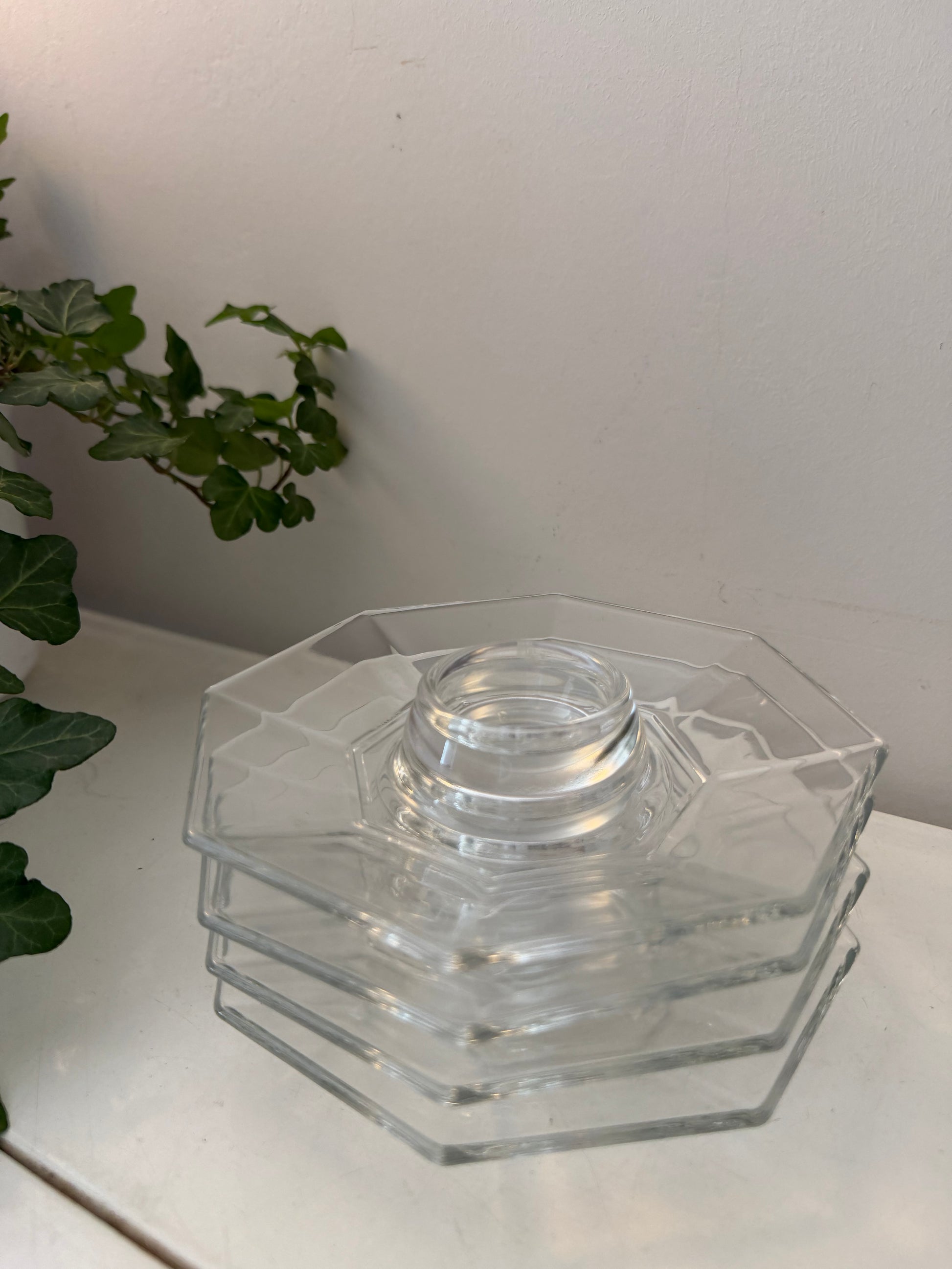 Strakke, heldere glazen eierdopjes met een achthoekige vorm en een mooi gelaagde opbouw. Zwaar uitgevoerd glas met een centraal rond houdertje voor het ei. Minimalistisch design met een duidelijke jaren 70 / early 80 uitstraling. Mooi stapelbaar ook. Q827