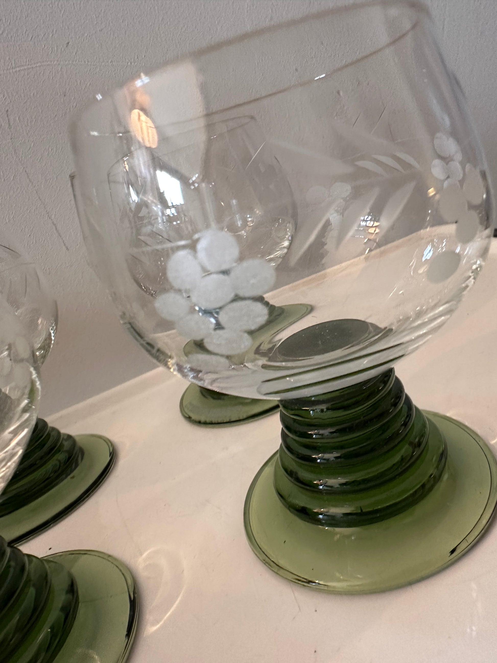 Super toffe glazen met een geëtst bloemmotief in het glas — superleuk model. De voet is gesigneerd met een naam in het glas gegraveerd. Klein model en perfect formaatje voor likeur, port of dessertwijn. Q552