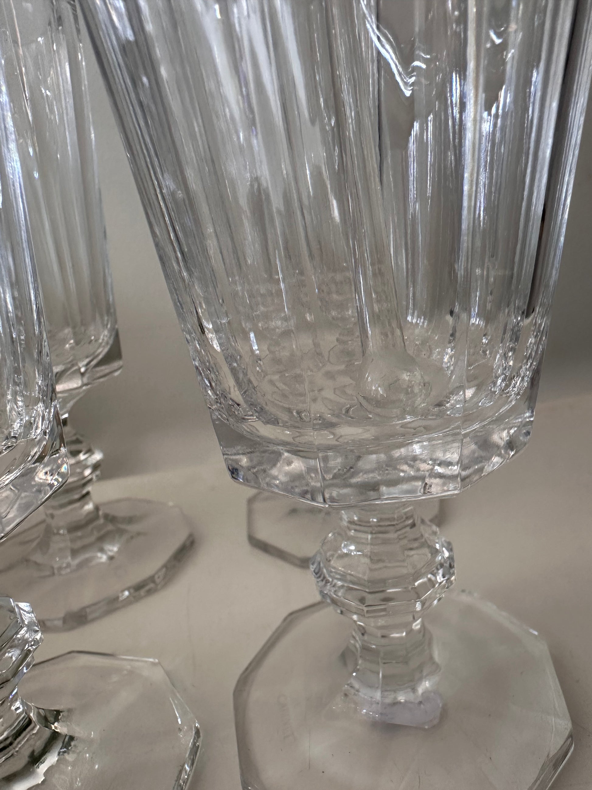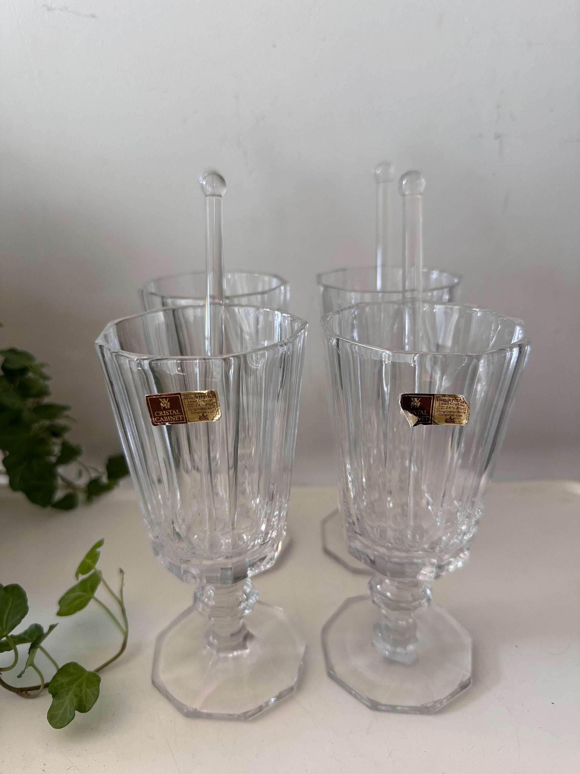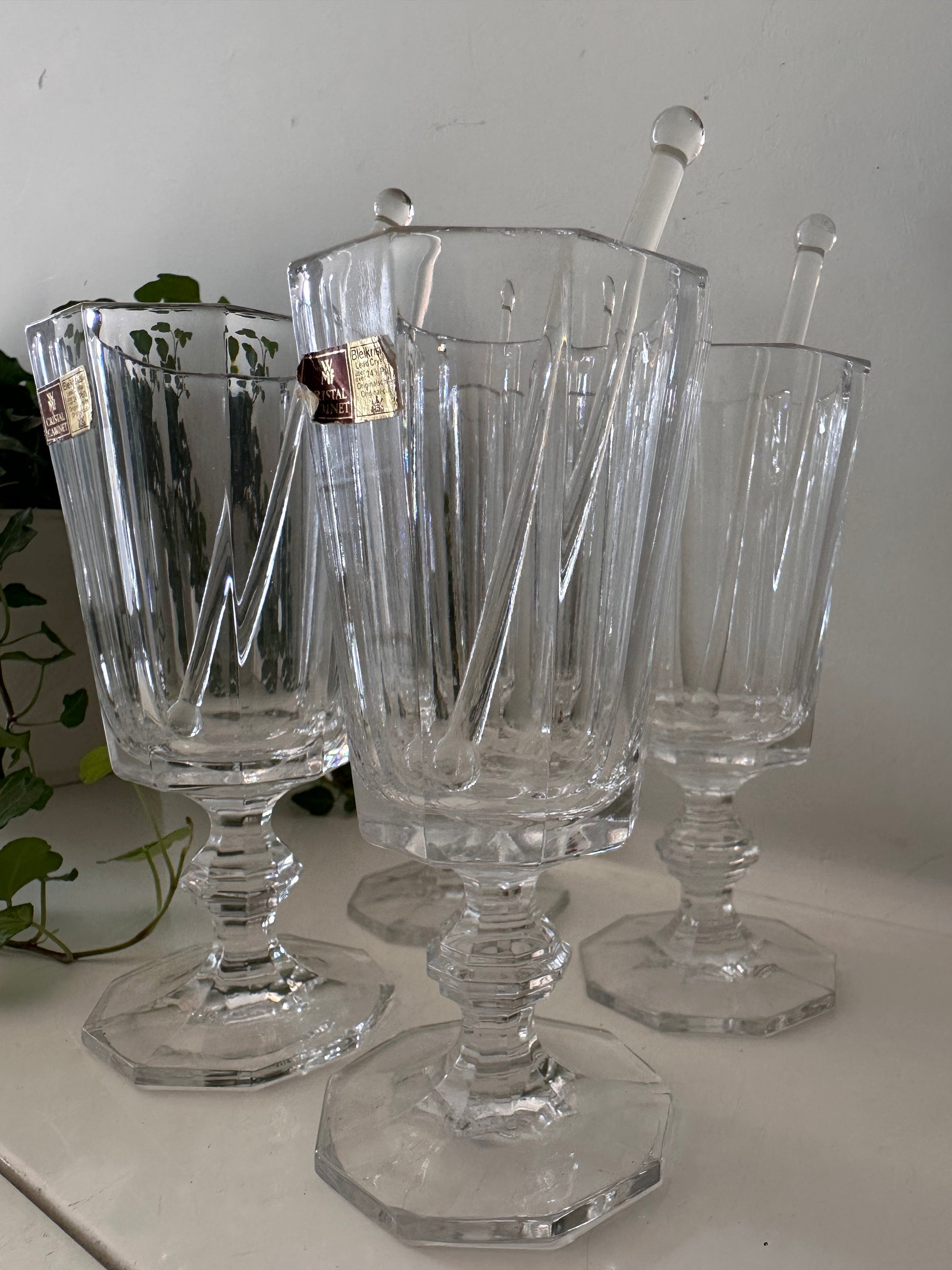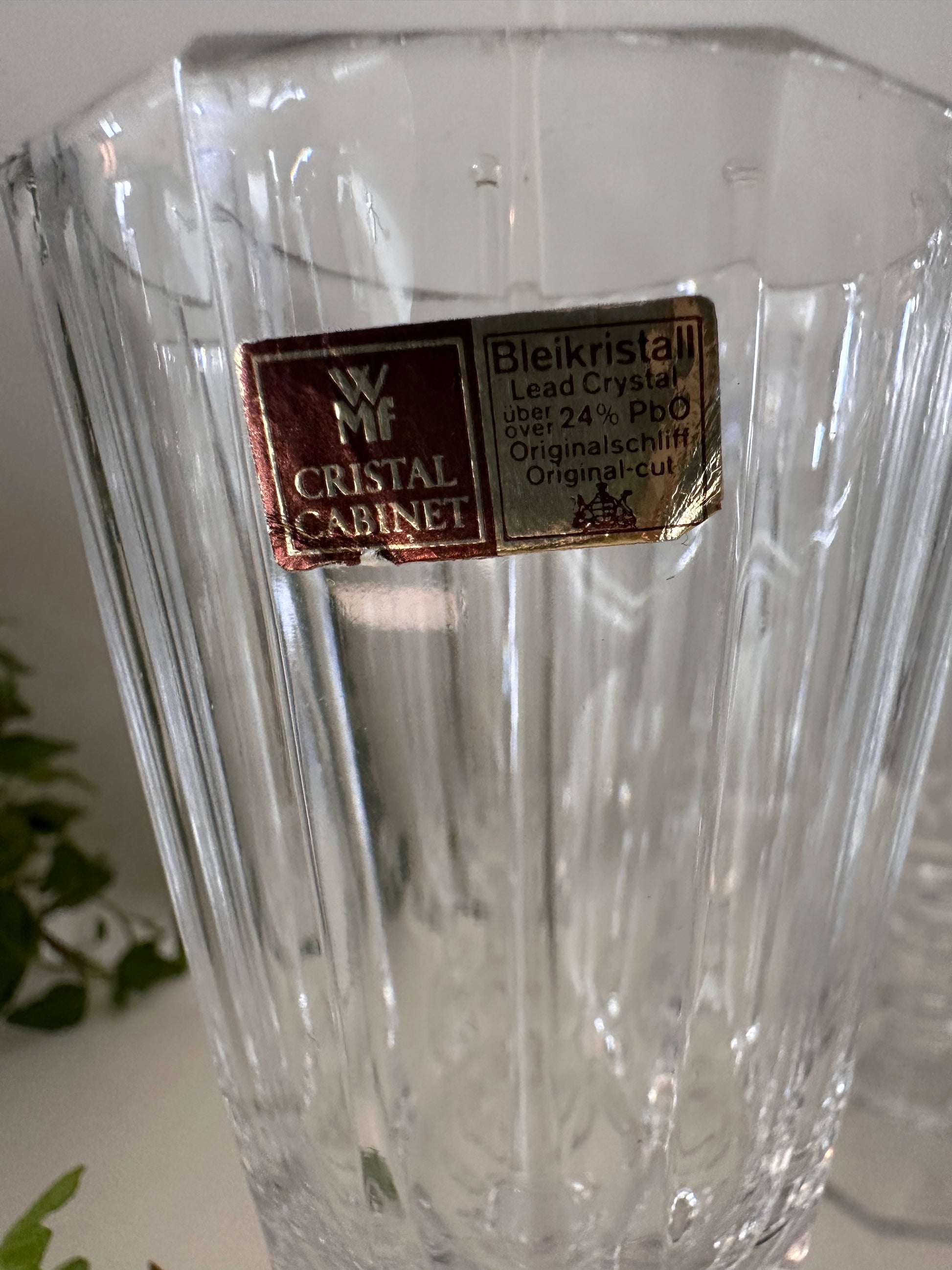 Supermooie vintage set van WMF ‘Cristal Cabinet’ — helder geslepen loodkristal met die typische facetvorm en stevige voet. Elk glas heeft z’n originele glazen lepel erbij. Mooi voor Irish coffee of een chique dessert. Q381