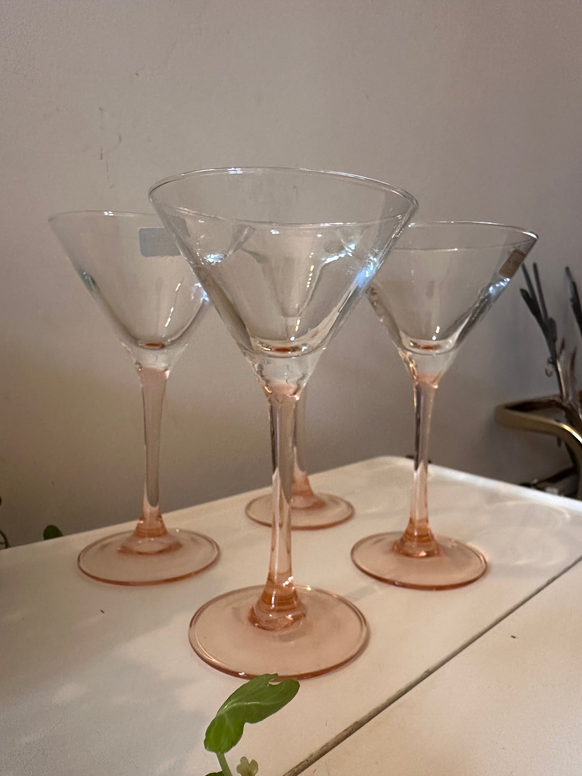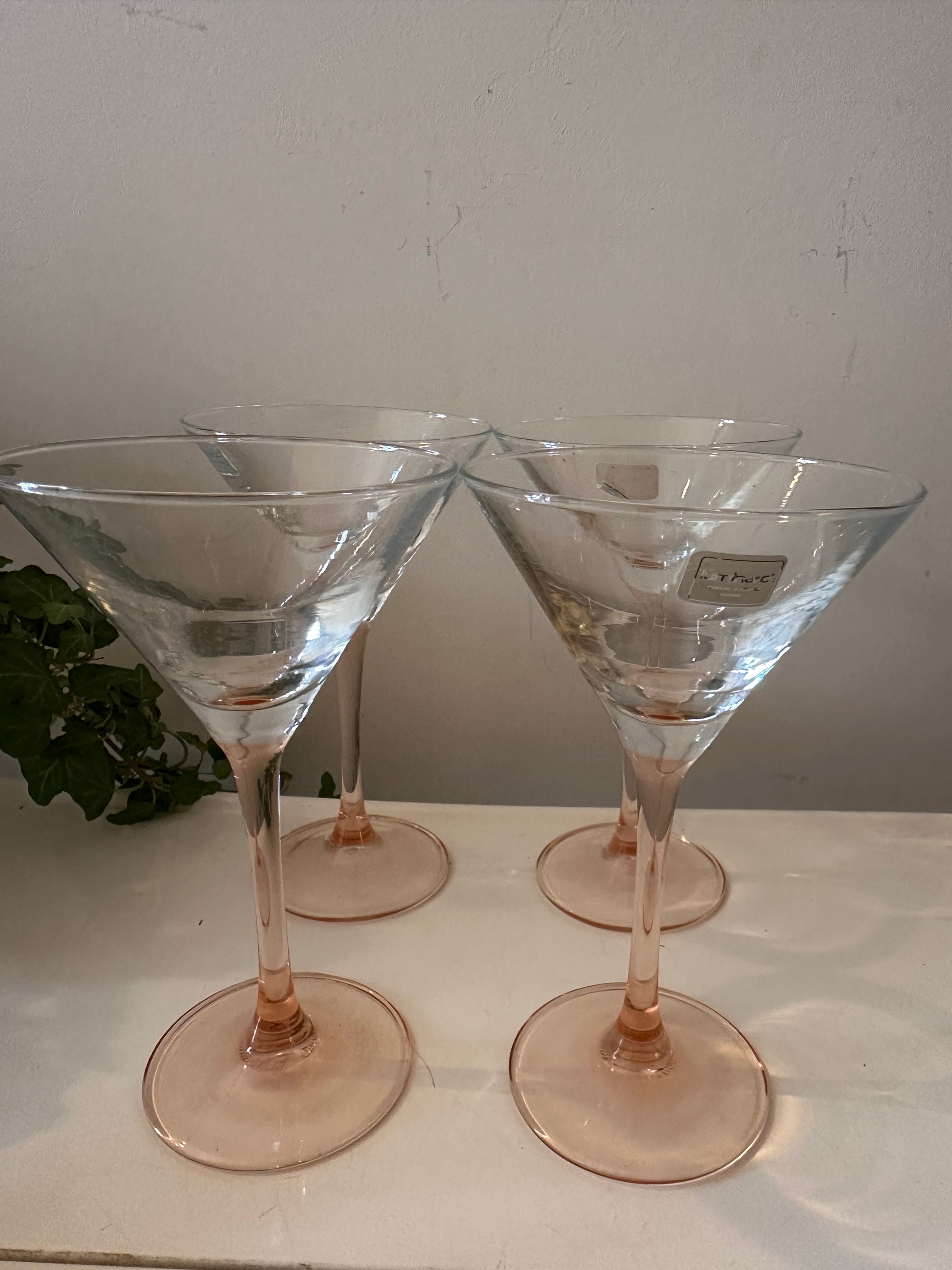 Superleuke set roze voet martiniglazen van Luminarc, nog met originele merksticker. De transparante kelk met zachtroze voet geeft ze die typische jaren 70 look — perfect voor feestjes of een retro barsetting. Q539