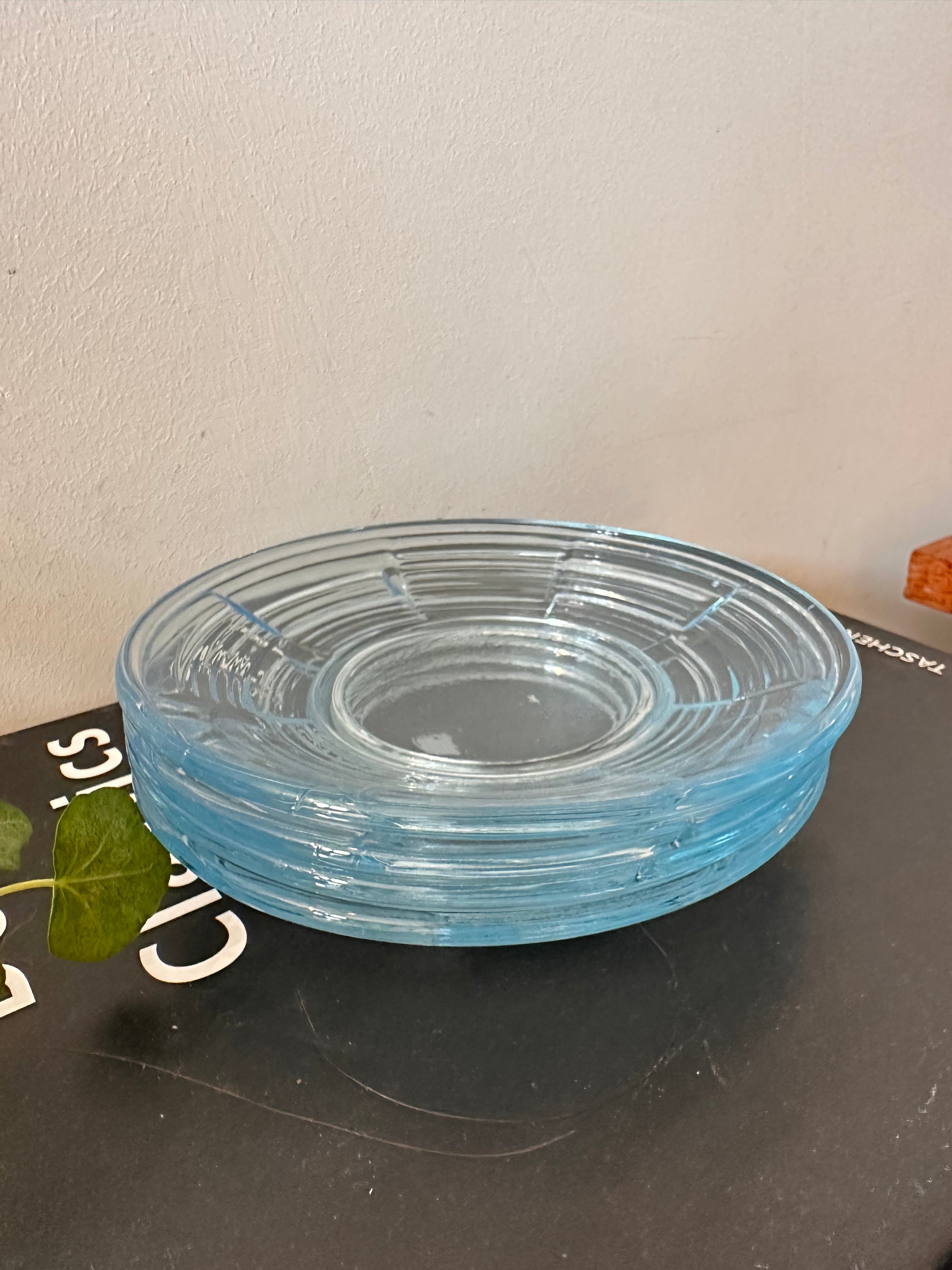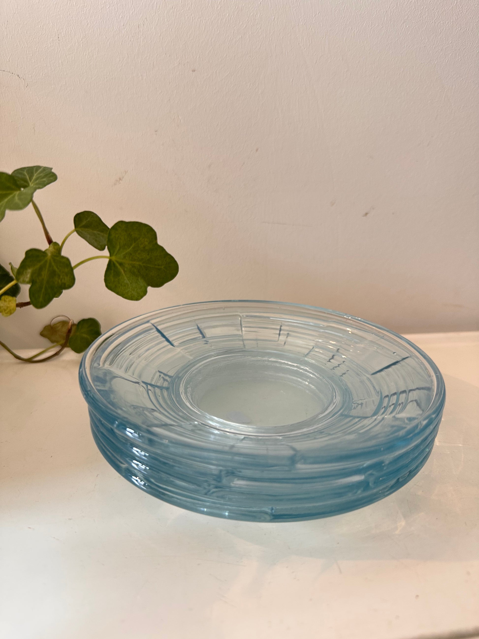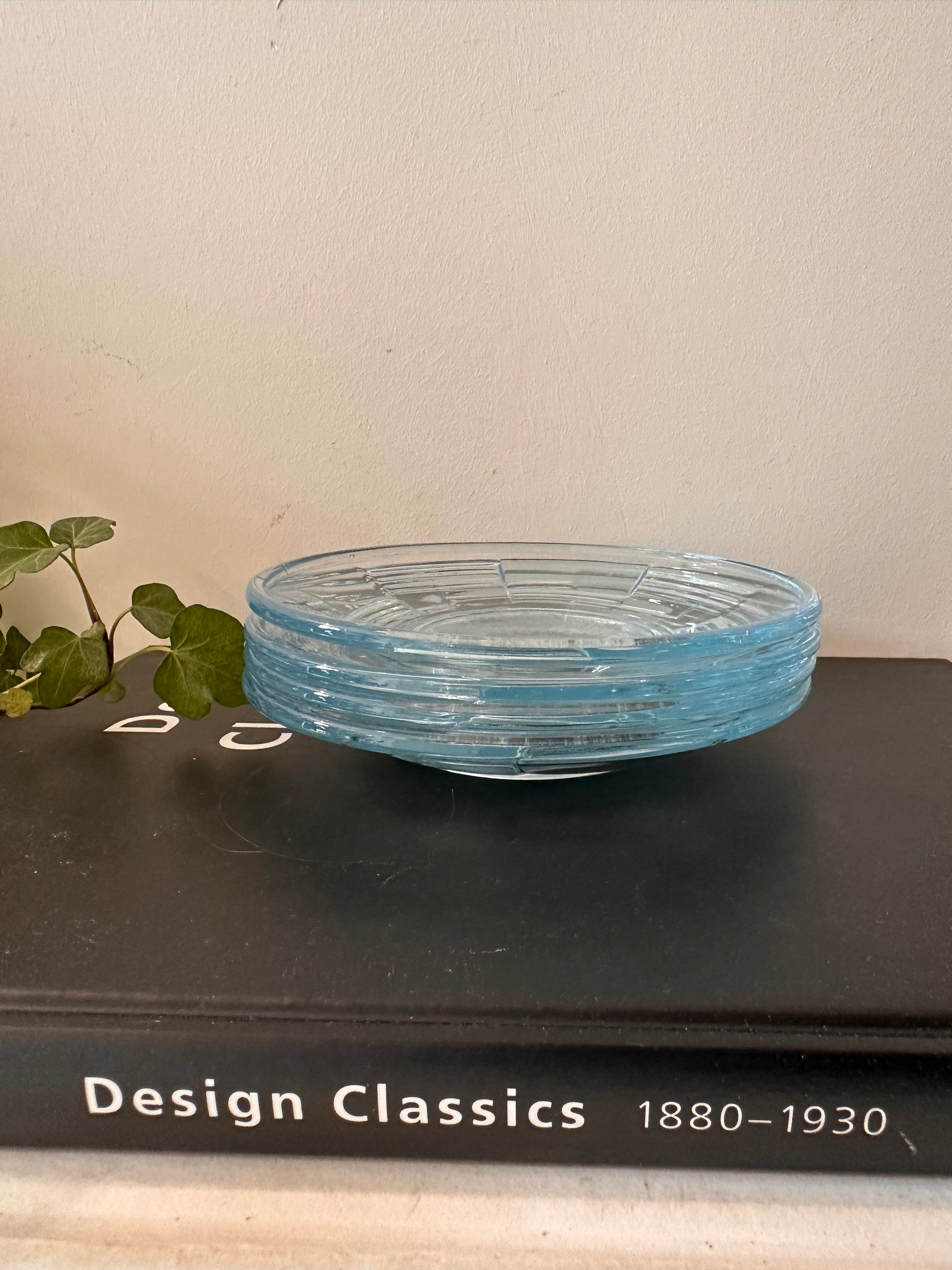 Hoe leuk zijn deze? Lichtblauw glas met een gestileerd lijnenpatroon en een iets verhoogde rand rondom. Gemaakt van dik persglas en lekker stevig. In mooie vintage staat. Q173