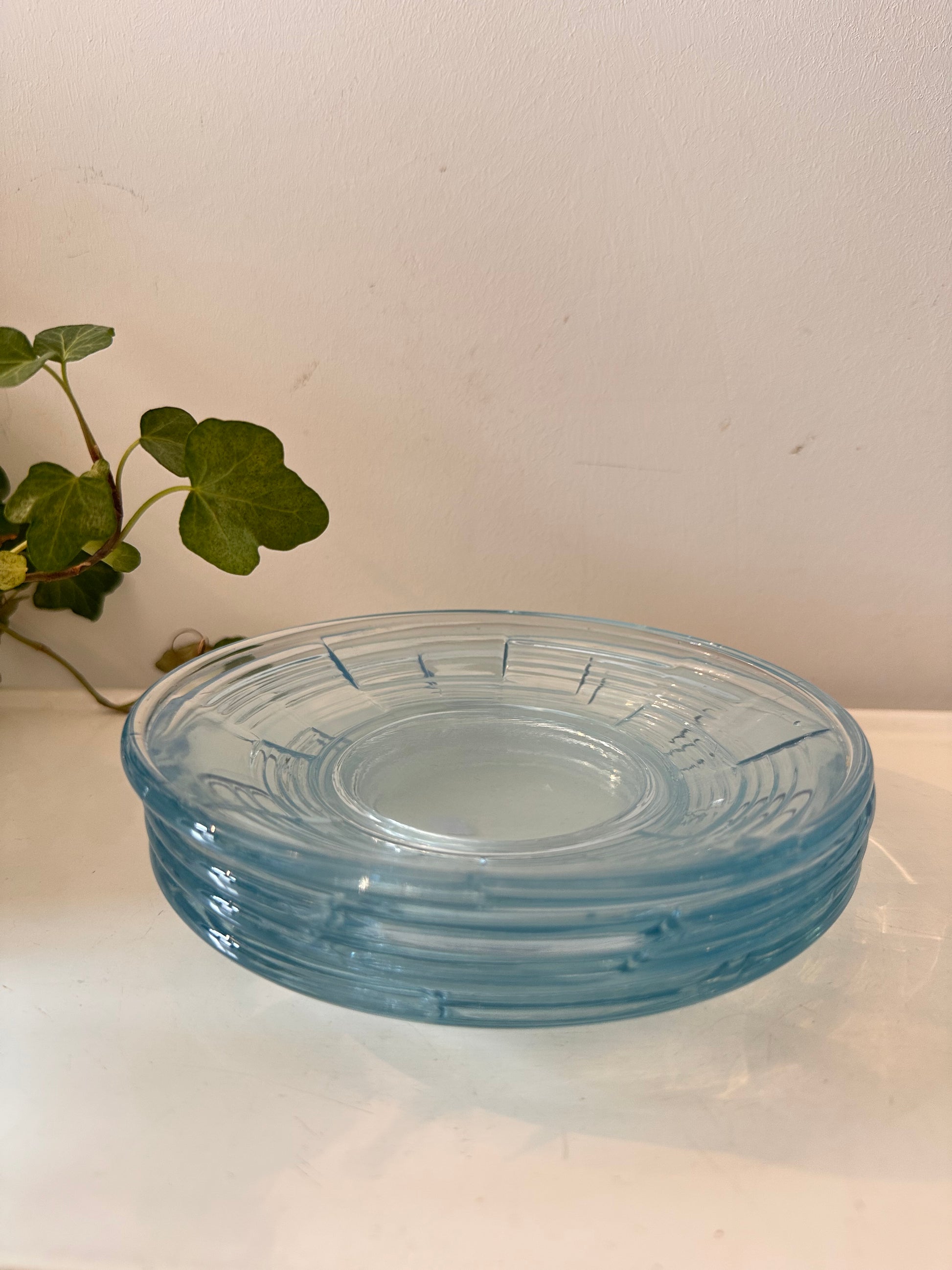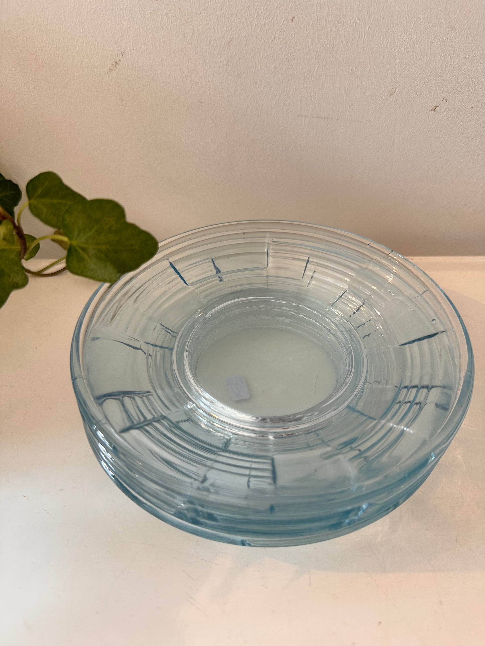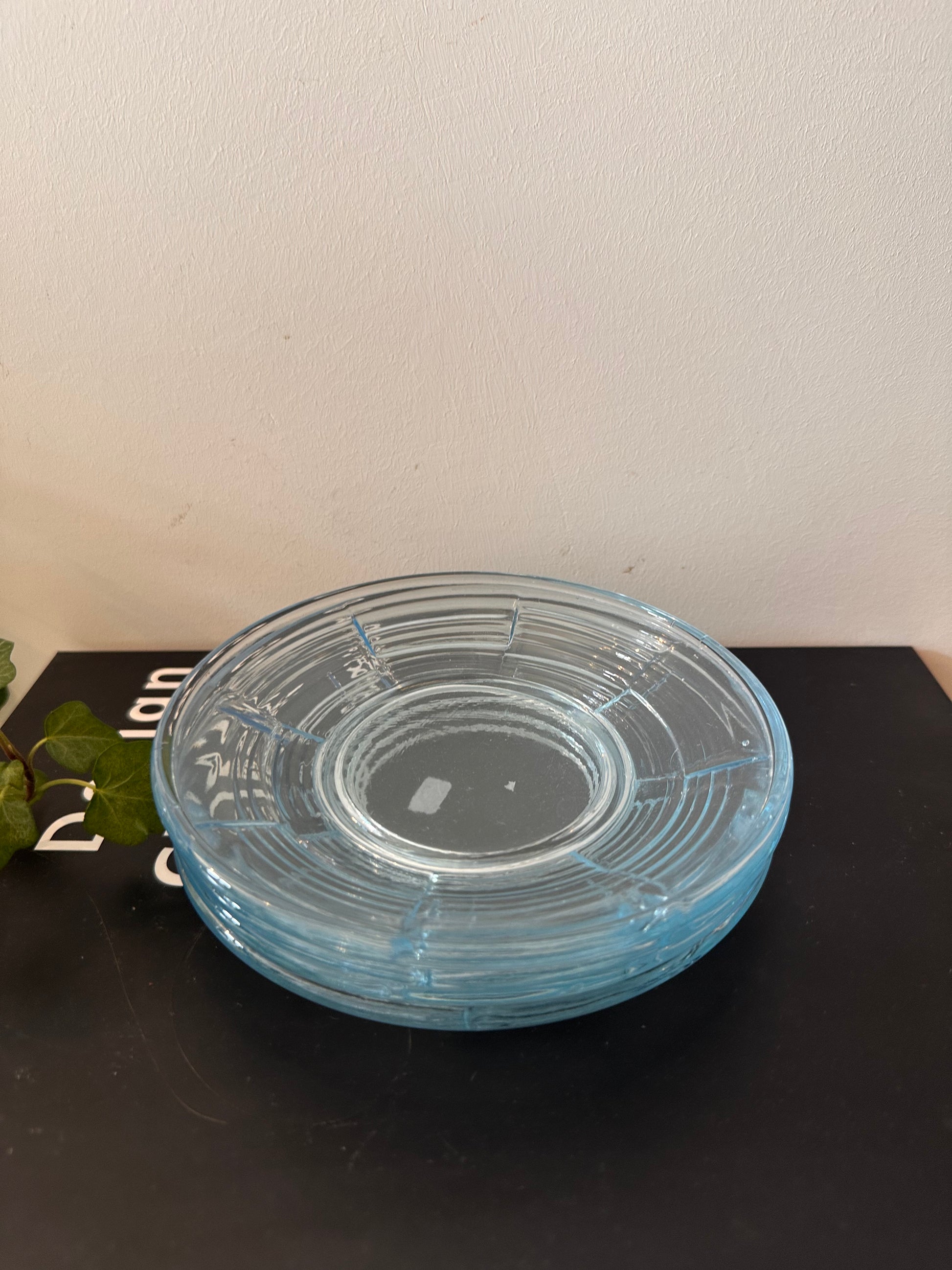 Hoe leuk zijn deze? Lichtblauw glas met een gestileerd lijnenpatroon en een iets verhoogde rand rondom. Gemaakt van dik persglas en lekker stevig. In mooie vintage staat. Q173