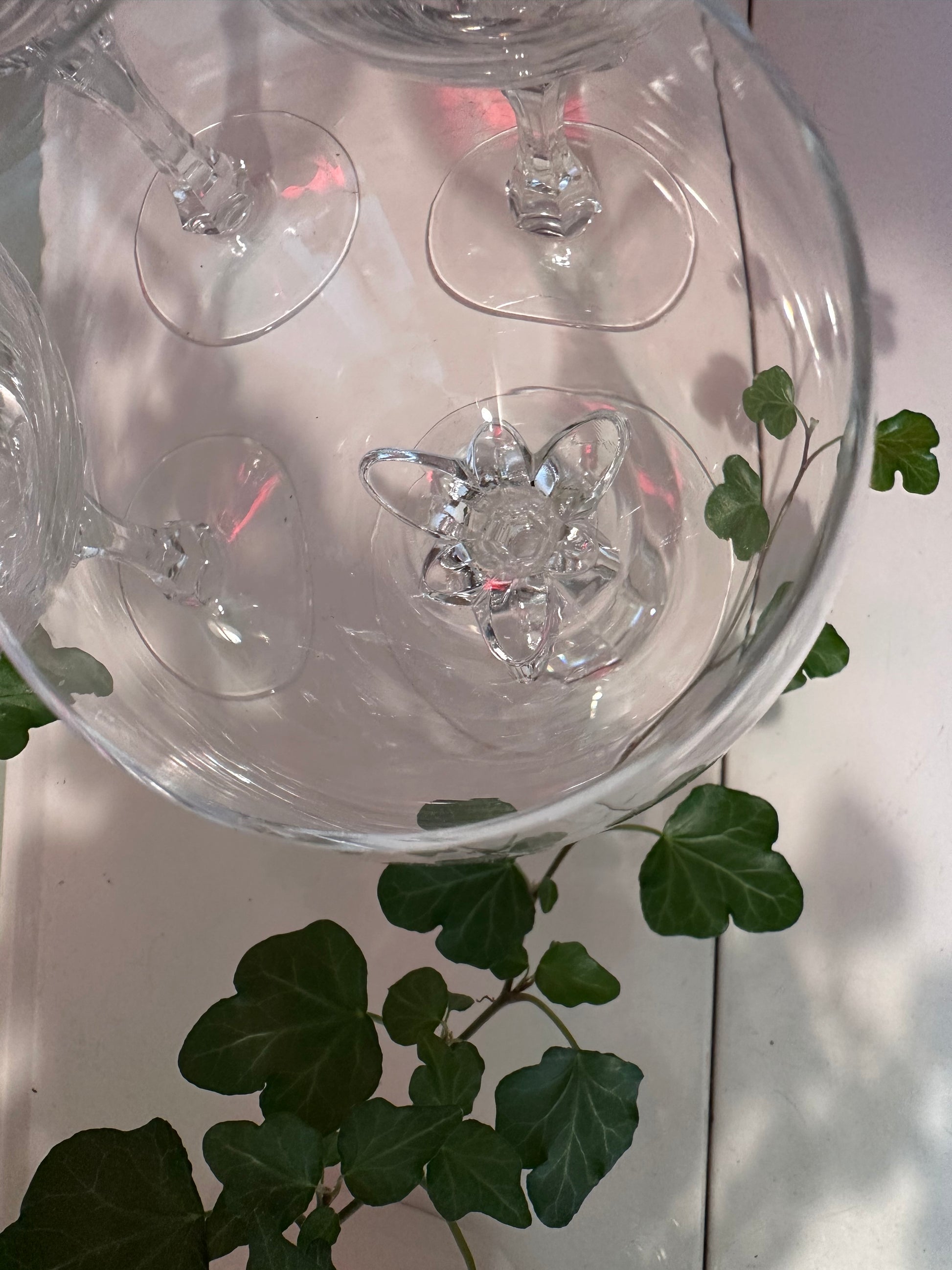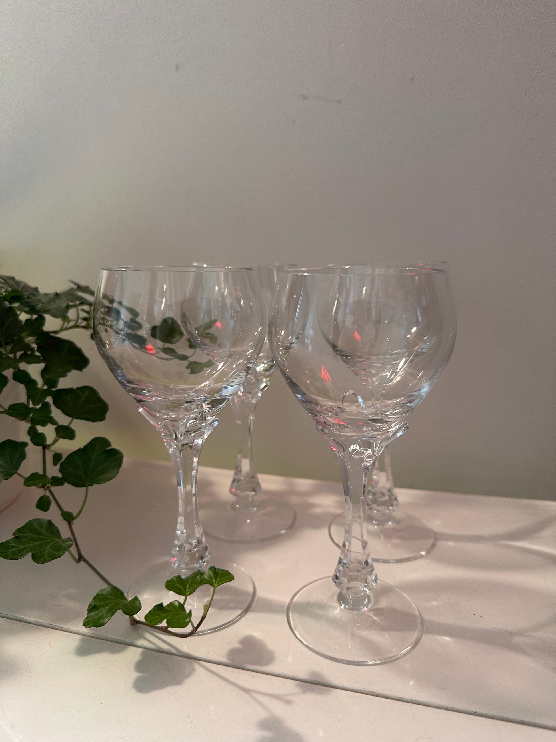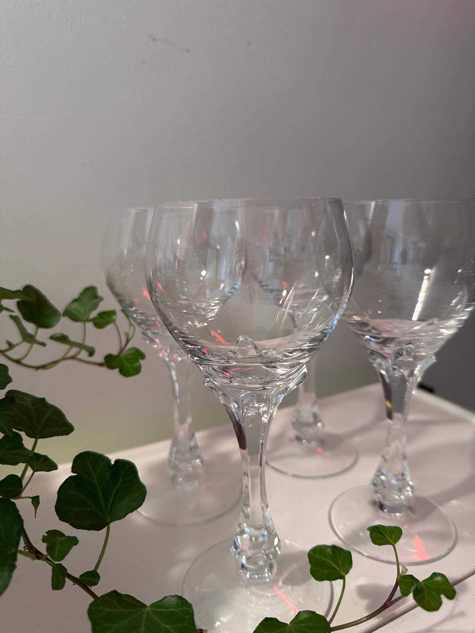 Supermooie set deze 4 kristallen wijnglazen. Staan op een prachtige voet die uitloopt naar het glas als de kelk van de bloem. Als je in het glas kijkt zie je de blaadjes. In een top staat. Dateren jaren 80 en afkomstig uit Duitsland.