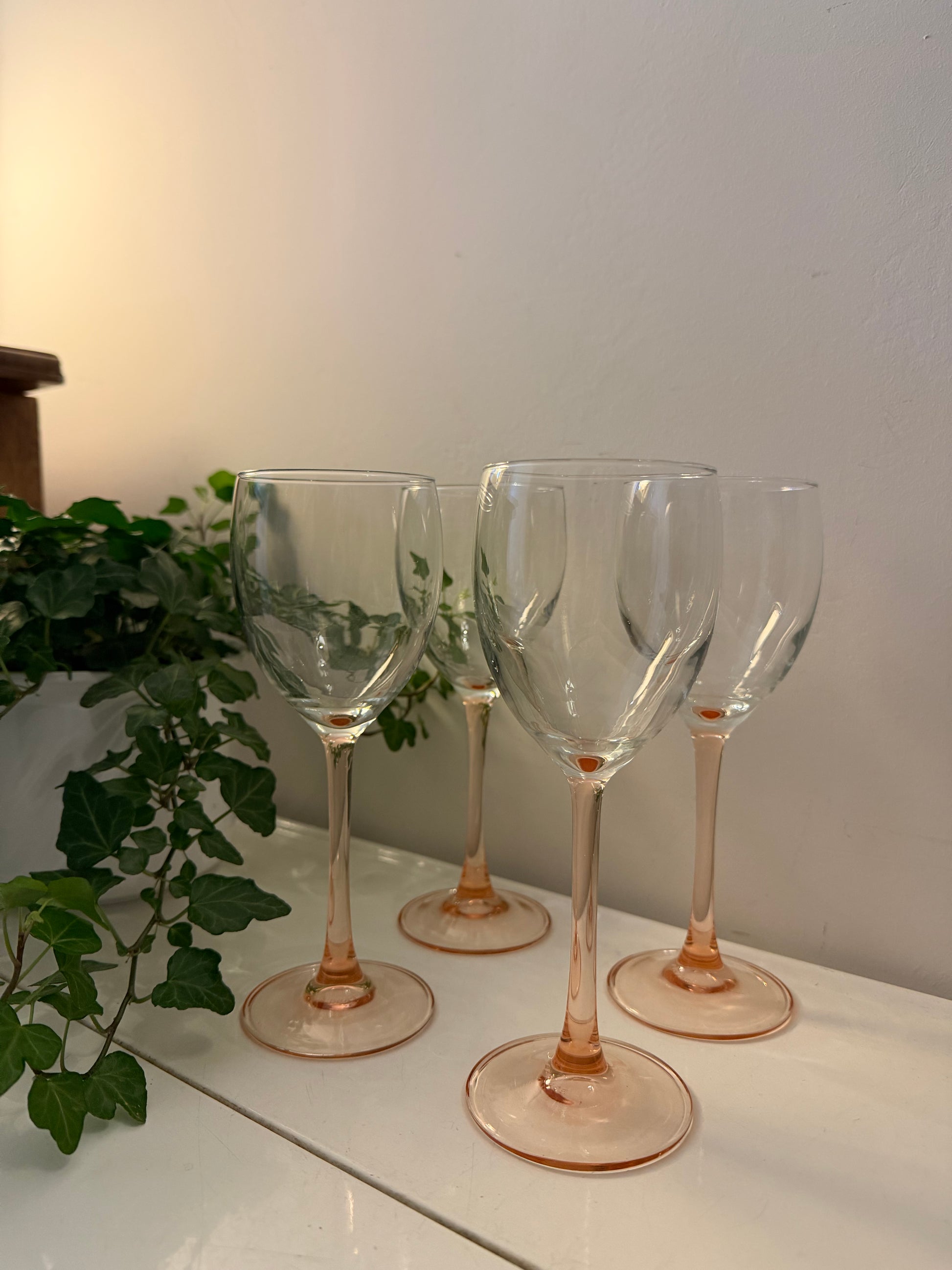 Set van vier wijnglazen met helder glas en transparante oranje-roze steel en voet. Slank model met lichte kelkvorm en mooi kleuraccent onderin de kelk. Onderzijde gemerkt met France. Jaren 70/80 glaswerk met zacht perzik/zalmtint in de voet. Q847