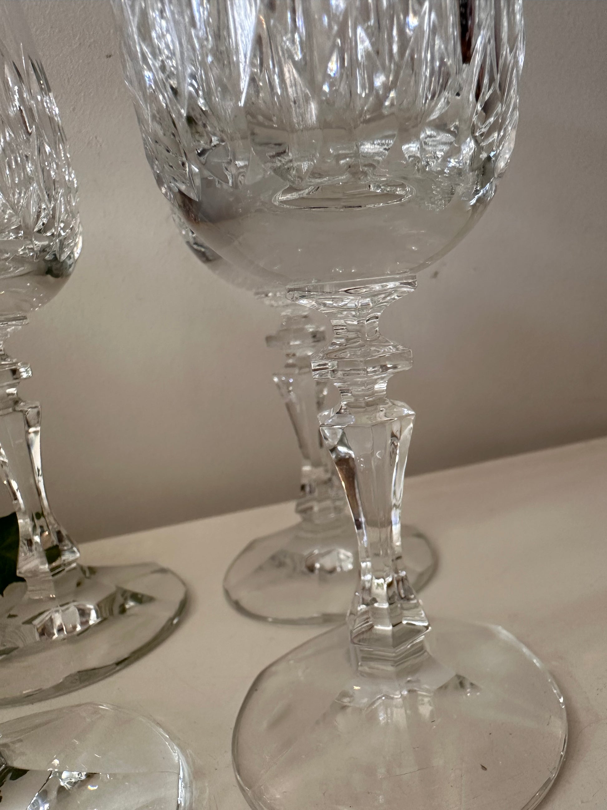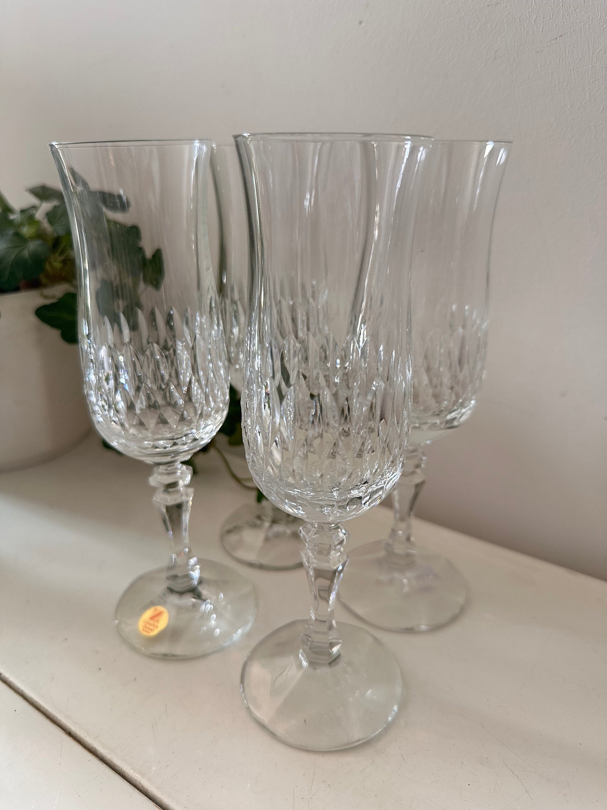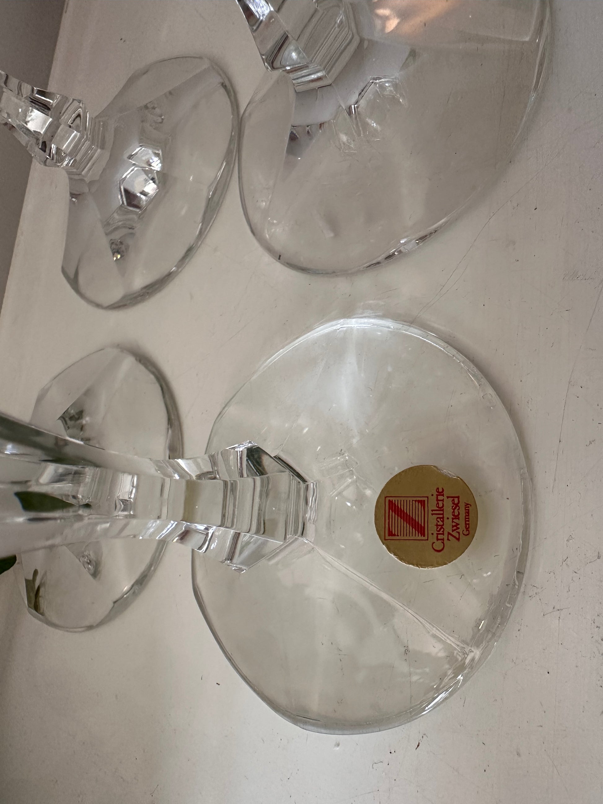 Zware kristallen champagneglazen van het Duitse merk Cristallerie Zwiesel. Deze flutes hebben een geslepen kelk, een sierlijk geslepen voet en liggen lekker in de hand. In een top vintage staat. Q171
