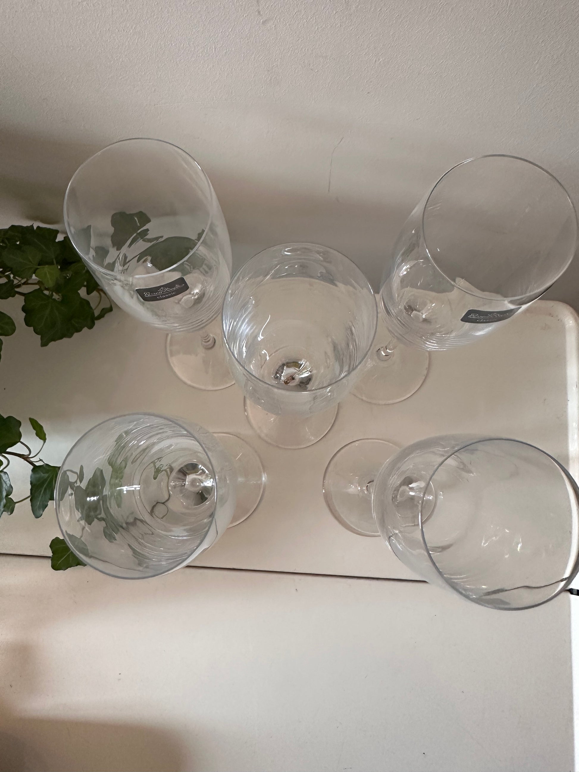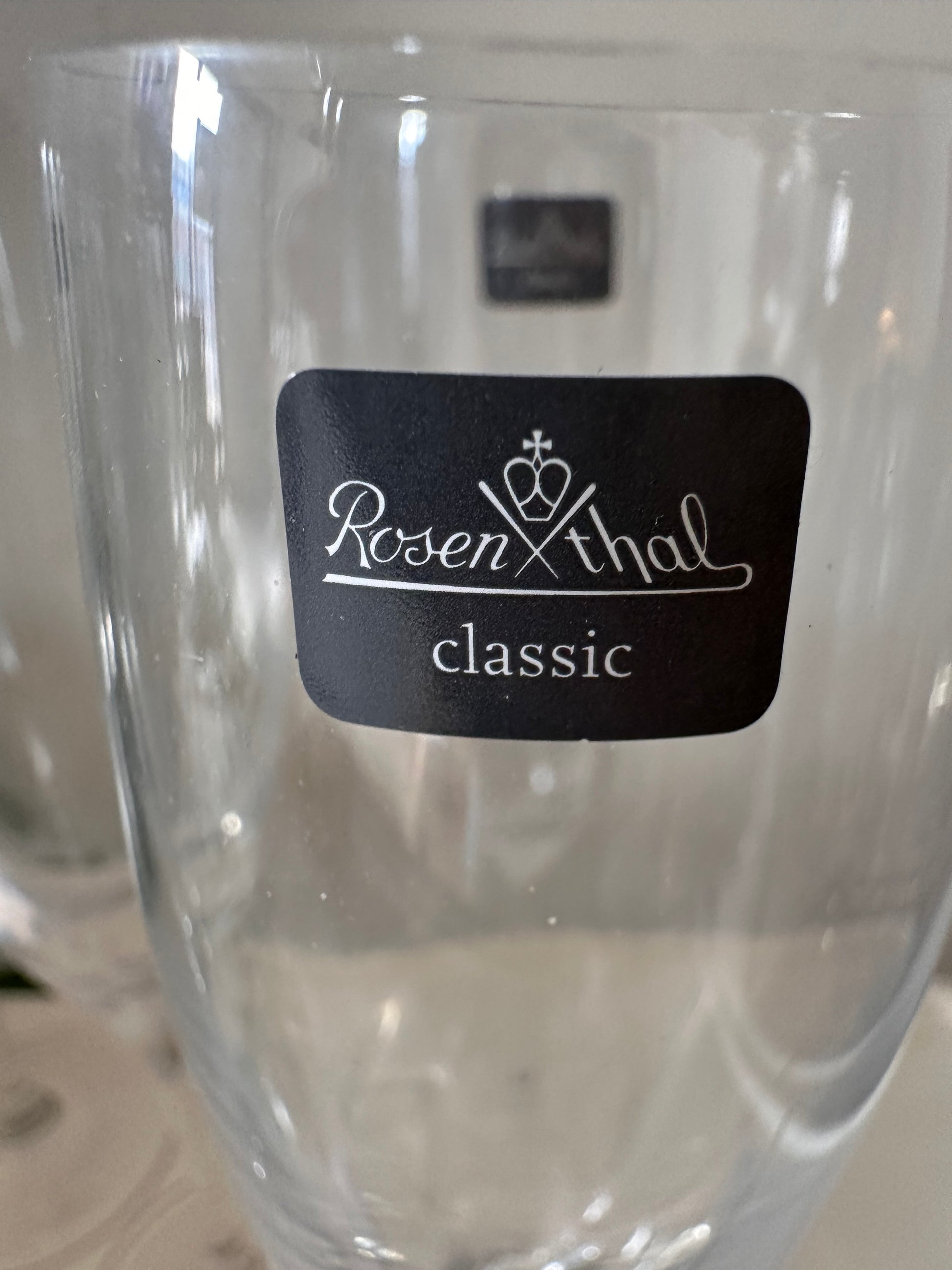 Superchique set flûtes van het Duitse merk Rosenthal — helder kristalglas met subtiel reliëf en het originele merkje er nog op. Mooi dun glas, klassiek model en echt kwaliteit. Perfect om feestelijk te tafelen of je bar mee aan te vullen. Gemerkt met sticker en gegraveerde in de voet.