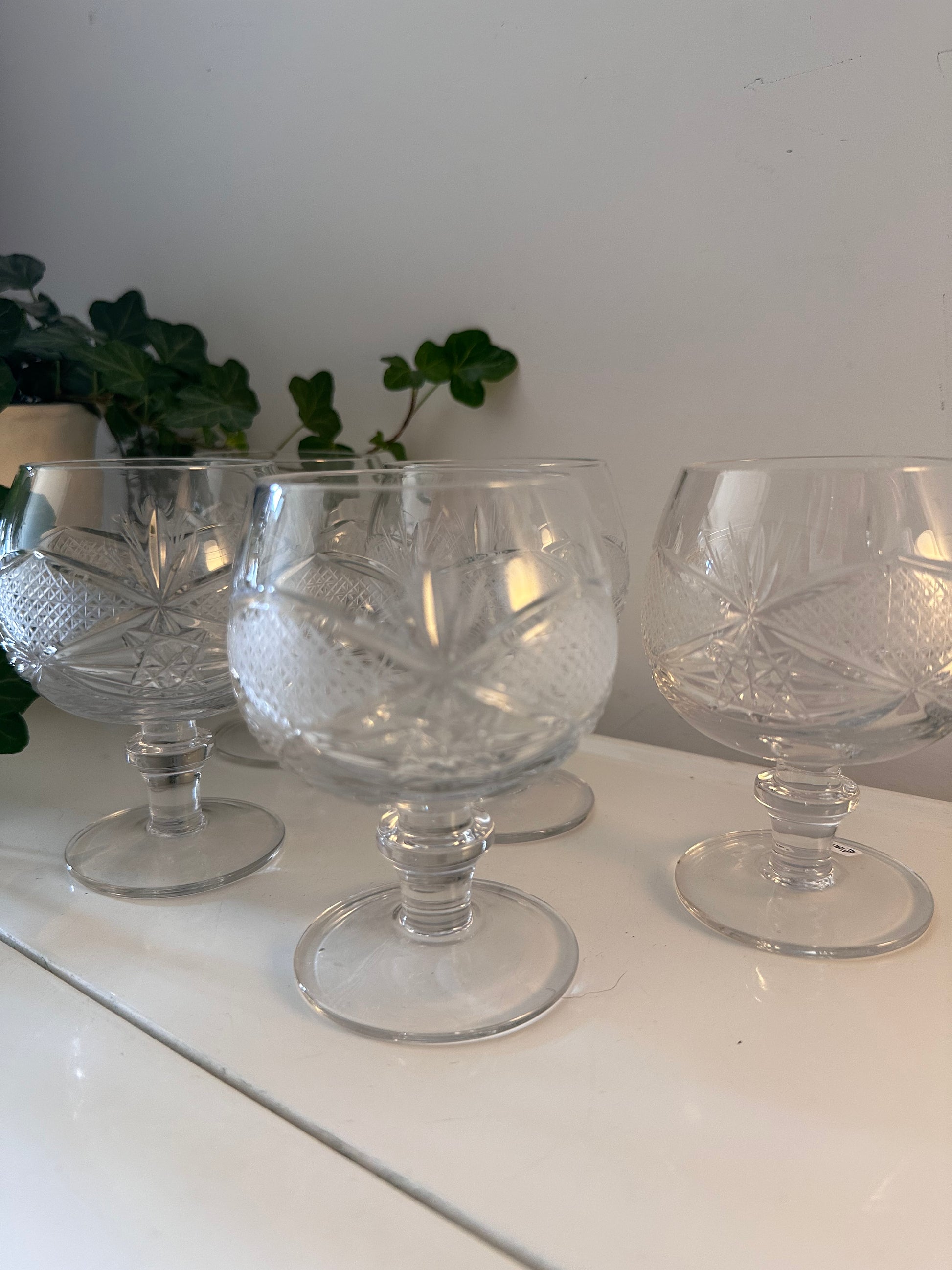Prachtige set van vijf kristallen cognacglazen met een verfijnd geslepen patroon en stevige voet. De glazen zijn in een top vintage staat.Q712